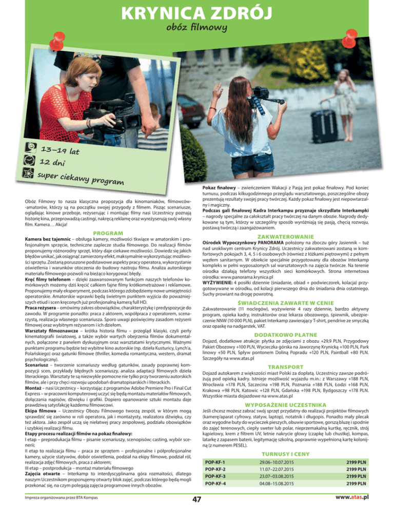 KRYNICA ZDRÓJ obóz ¿lmowy 13–19 lat 12 dni super ciek awy progr am Pokaz finałowy – zwieńczeniem Wakacji z Pasją jest pokaz finałowy. Pod koniec turnusu, podczas kilkugodzinnego przeglądu warsztatowego, poszczególne obozy prezentują rezultaty swojej pracy twórczej. Każdy pokaz finałowy jest niepowtarzalny i magiczny. Podczas gali finałowej Kadra Interkampu przyznaje skrzydlate Interkampki – nagrody specjalne za całokształt pracy twórczej na danym obozie. Nagrody dedykowane są tym, którzy w szczególny sposób wyróżniają się pasją, chęcią rozwoju, postawą twórczą i zaangażowaniem. Obóz Filmowy to nasza klasyczna propozycja dla kinomaniaków, filmowców-amatorów, którzy są na początku swojej przygody z filmem. Pisząc scenariusze, oglądając kinowe przeboje, reżyserując i montując filmy nasi Uczestnicy poznają historię kina, przeprowadzą castingi, nakręcą reklamę oraz wyreżyserują swój własny film. Kamera… Akcja! PROGRAM ZAKWATEROWANIE Kamera bez tajemnic – obsługa kamery, możliwości tkwiące w amatorskim i profesjonalnym sprzęcie, techniczne zaplecze studia filmowego. Do realizacji filmów proponujemy różnorodny sprzęt, który daje ciekawe możliwości. Dowiedz się jakich błędów unikać, jak osiągnąć zamierzony efekt, maksymalnie wykorzystując możliwości sprzętu. Zostaną poruszone podstawowe aspekty pracy operatora, wykorzystanie oświetlenia i warunków otoczenia do budowy nastroju filmu. Analiza autorskiego materiału filmowego pozwoli na bieżąco korygować błędy. Kręć filmy telefonem – dzięki zaawansowanym funkcjom naszych telefonów komórkowych możemy dziś kręcić całkiem fajne filmy krótkometrażowe i reklamowe. Proponujemy mały eksperyment, podczas którego zdobędziemy nowe umiejętności operatorskie. Amatorskie wprawki będą świetnym punktem wyjścia do poważniejszych etiud i scen kręconych już profesjonalną kamerą full HD. Praca reżysera – omówimy zakres obowiązków, charakterystykę i predyspozycje do zawodu. W programie ponadto: praca z aktorem, współpraca z operatorem, scenarzystą, realizacja własnego scenariusza. Sporo uwagi poświęcimy zasadom reżyserii filmowej oraz wybitnym reżyserom i ich dziełom. Warsztaty filmoznawcze – krótka historia filmu – przegląd klasyki, czyli perły kinematografii światowej, a także wybór wartych obejrzenia filmów dokumentalnych, połączone z panelem dyskusyjnym oraz warsztatami krytycznymi. Ważnymi punktami programu będzie też wybitne kino autorskie (np. dzieła Kusturicy, Lynch’a, Polańskiego) oraz gatunki filmowe (thriller, komedia romantyczna, western, dramat psychologiczny). Scenariusz – tworzenie scenariuszy według gatunków, zasady poprawnej kompozycji scen, przykłady błędnych scenariuszy, analiza adaptacji filmowych dzieła literackiego. Warsztaty te są niezwykle pomocne nie tylko przy tworzeniu autorskich filmów, ale i przy chęci rozwoju upodobań dramatopisarskich i literackich. Montaż – nasi Uczestnicy – korzystając z programów Adobe Premiere Pro i Final Cut Express – w pracowni komputerowej uczyć się będą montażu materiałów filmowych, dołączania napisów, dźwięku i grafiki. Dopiero opanowanie sztuki montażu daje prawdziwą satysfakcję każdemu filmowcowi. Ekipa filmowa – Uczestnicy Obozu Filmowego tworzą zespół, w którym mogą sprawdzić się zarówno w roli operatora, jak i montażysty, realizatora dźwięku, czy też aktora. Jako zespół uczą się niełatwej pracy zespołowej, podziału obowiązków i szybkiej realizacji filmu. Etapy procesu realizacji filmów na pokaz finałowy: I etap – preprodukacja filmu – pisanie scenariuszy, scenopisów; casting, wybór scenerii; II etap to realizacja filmu – praca ze sprzętem – profesjonalne i półprofesjonalne kamery, użycie statywów, dobór oświetlenia, podział na ekipy filmowe, podział ról, realizacja zdjęć filmowych, praca z aktorem; III etap – postprodukcja – montaż materiału filmowego Zajęcia otwarte – Interkamp to interdyscyplinarna góra rozmaitości, dlatego naszym Uczestnikom proponujemy otwarty blok zajęć, podczas którego będą mogli przekonać się, na czym polegają zajęcia programowe innych obozów. Impreza organizowana przez BTA Kompas Ośrodek Wypoczynkowy PANORAMA położony na zboczu góry Jasiennik – tuż nad urokliwym centrum Krynicy Zdrój. Uczestnicy zakwaterowani zostaną w komfortowych pokojach 3, 4, 5 i 6 osobowych (również z łóżkami piętrowymi) z pełnym węzłem sanitarnym. W obiekcie specjalnie przygotowany dla obozów Interkamp kompleks w pełni wyposażonych sal warsztatowych na zajęcia twórcze. Na terenie ośrodka działają telefony wszystkich sieci komórkowych. Strona internetowa ośrodka: www.panorama.krynica.pl WYŻYWIENIE: 4 posiłki dziennie (śniadanie, obiad + podwieczorek, kolacja) przygotowywane w ośrodku, od kolacji pierwszego dnia do śniadania dnia ostatniego. Suchy prowiant na drogę powrotną. ŚWIADCZENIA ZAWARTE W CENIE Zakwaterowanie (11 noclegów), wyżywienie 4 razy dziennie, bardzo aktywny program, opieka kadry, instruktorów oraz lekarza obozowego, śpiewnik, ubezpieczenie NNW (10 000 PLN), pakiet Interkamp zawierający T-shirt, pendrive ze smyczką oraz opaskę na nadgarstek, VAT. DODATKOWO PŁATNE Dojazd, dodatkowe atrakcje: płytka ze zdjęciami z obozu +29,9 PLN, Przygodowy Pakiet Obozowy +100 PLN, Wycieczka górska na Jaworzynę Krynicką +100 PLN, Park linowy +50 PLN, Spływ pontonem Doliną Popradu +120 PLN, Paintball +80 PLN. Szczegóły na www.atas.pl TRANSPORT Dojazd autokarem z większości miast Polski za dopłatą. Uczestnicy zawsze podróżują pod opieką kadry. Istnieje możliwość wyjazdu m.in.: z Warszawy +188 PLN, Wrocławia +178 PLN, Szczecina +198 PLN, Poznania +188 PLN, Łodzi +168 PLN, Krakowa +98 PLN, Katowic +128 PLN, Gdańska +198 PLN, Bydgoszczy +178 PLN. Wszystkie miasta dojazdowe na www.atas.pl WYPO
