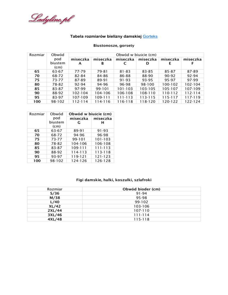 Tabela rozmiarów bielizny damskiej Gorteks Biustonosze, gorsety Rozmiar 65 70 75 80 85 90 95 100 Rozmiar 65 70 75 80 85 90 95 100 Obwód pod biustem (cm) 63-67 68-72 73-77 78-82 83-87 88-92 83-97 98-102 Obwód pod biustem (cm) 63-67 68-72 73-77 78-82 83-87 88-92 93-97 98-102 miseczka A miseczka B 77-79 82-84 87-89 92-94 97-99 102-104 107-109 112-114 79-81 84-86 89-91 94-96 99-101 104-106 109-111 114-116 Obwód w biuście (cm) miseczka miseczka C D 81-83 86-88 91-93 96-98 101-103 106-108 111-113 116-118 83-85 88-90 93-95 98-100 103-105 108-110 113-115 118-120 Obwód w biuście (cm) miseczka miseczka G H 89-91 94-96 99-101 104-106 109-111 114-113 119-121 124-126 91-93 96-98 101-103 106-108 111-113 113-118 121-123 126-128 Figi damskie, halki, koszulki, szlafroki Rozmiar S/36 M/38 L/40 XL/42 2XL/44 3XL/46 4XL/48 Obwód bioder (cm) 91-94 95-98 99-102 103-106 107-110 111-114 115-118 miseczka E miseczka F 85-87 90-92 95-97 100-102 105-107 110-112 115-117 120-122 87-89 92-94 97-99 102-104 107-109 112-114 117-119 122-124