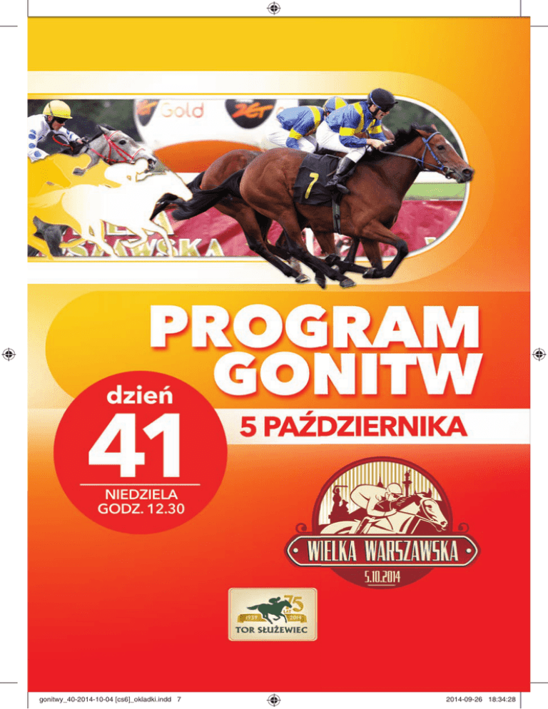 gonitwy_40-2014-10-04 [cs6]_okladki.indd 7 2014-09-26 18:34:28 Fani sportu dziękują graczom LOTTO Każda złotówka, którą przeznaczasz na gry liczbowe LOTTO, to 19 groszy dla sportu i kultury. Gramy dla sportu i kultury gonitwy_40-2014-10-04 [cs6]_okladki.indd 8 2014-09-26 18:34:28 SPIS GONITW 41 DZIEŃ 5 PAŹDZIERNIKA 2014 Nagroda Hubala (wcześniej Tarana) 1 12:30 2 Gonitwa płotowa międzynarodowa dla 3-letnich i starszych koni. Za każdą wygraną w bieżącym roku gonitwę płotową lub przeszkodową 1 kg nadwagi. Konie, które nie zajęły płatnego miejsca 2 kg, a konie, które debiutują, 3 kg ulgi wagi. Nie jest stosowana ulga wagi za kategorie jeździeckie. Nagroda dodatkowa PKWK dystans 2800 m suma nagród 17 500 zł Gonitwa dla 3-letnich koni czystej krwi arabskiej II grupy hodowli krajowej wpisanych do Polskiej Księgi Stadnej Koni Arabskich Czystej Krwi (PASB). dystans 2000 m suma nagród 12 250 zł 13:00 3 13:45 4 14:15 5 15:00 6 15:30 7 16:30 8 Gonitwa handikapowa III grupy dla 3-letnich i starszych koni. Wagi według handikapu generalnego: 4-letnie i starsze minus 5 kg, 3-letnie minus 6 kg. Nagroda dodatkowa PKWK Gonitwa o puchar firmy W.Kruk dystans 1200 m suma nagród 11 550 zł Nagroda Mosznej – L (kat. A) dystans 1600 m suma nagród 47 250 zł Gonitwa międzynarodowa dla 3-letnich i starszych koni. Nagroda dodatkowa PKWK Nagroda Cardei – (kat. B) Gonitwa dla 2-letnich klaczy. Nagroda dodatkowa PKWK Gonitwa o puchar Noble Bank dystans 1200 m suma nagród 34 125 zł Gonitwa handikapowa IV grupy dla 3-letnich i starszych koni. Wagi według handikapu generalnego: 4-letnie i starsze plus 6 kg, 3-letnie plus 4 kg. Nagroda dodatkowa PKWK dystans 1800 m suma nagród 9 800 zł Wielka Warszawska – Nagroda Prezydenta m.st. Warszawy – G1 POL (kat. A) Gonitwa międzynarodowa dla 3-letnich i starszych koni. Nagroda dodatkowa PKWK dystans 2600 m suma nagród 218 750 zł Gonitwa dla 2-letnich koni II grupy. Nagroda dodatkowa PKWK dystans 1300 m suma nagród 16 625 zł Gonitwa dla 3-letnich i starszych koni II grupy. Nagroda dodatkowa PKWK dystans 2200 m suma nagród 15 050 zł 17:10 9 17:45 JAK CZYTAĆ PROGRAM GONITW numer gonitwy 1 numer gonitwy w sezonie godzina rozpoczęcia gonitwy nagrody za poszczególne miejsca wyniki osiągnięte w danym roku kolejność na celowniku dystans i czas gonitwy gonitwy_41-2014-10-05 [cs6]-Z.indd 1 Dandolo – Handikap Otwarcia Gonitwa handikapowa I grupy dla 4-letnich i starszych koni. Wagi według handikapu generalnego minus 11 kg. 1800 m 15:00 15 500 zł wypłaty nieobjęte planem gonitw NAGRODA DODATKOWA PKWK. (1) I II 6 200 zł III 3 100 zł IV 1 550 zł V dystans gonitwy 775 zł SUMA NAGRÓD 27 125 ZŁ 1 nazwa nagrody Jansen 2012ȩsȩȩsȩȩZ 14.10 IV gr. ȩZȩsȩ*UTRZENKAȩȩ-ORlNAȩȩJansen 59ȩDYSTȩIȩ MȩYȩMȩIȩnȩ,'RIGOREVAȩ*ASNAȩȩ,UCKYȩ-OMENTȩȩ+ARBONADOȩȩ sȩ1600m – 1’45,2”ȩȩsȩtor elastyczny (3,3)ȩsȩSTYLȩSILNIEȩ WYSYANYȩsȩðDALEKO suma nagród suma nagród zdobytych w danym roku przebieg gonitwy stan toru 2014-09-30 11:37:08 ($ ,$;T #$%&'$()*+%,&,$-.-&'*/01023*.,&'*/0+*,&4$($ 5$46 '%/,7( $/,(802/2%6( &'*.'$ /7,.9:9.)%&)/$0*; <%&4$(0 $)*.,&4$($ 5$46'6-.,&'*/02'6-.,202/2%&0$'29: &'** ,&/'&=;$ 5$46>$%5$;*&43*., 6%&' !" E E D E " F 9 09 * E F ?%? @A ? B %? AA ?C D !" E E D E F " ** BC " J L D N F I KM gonitwy_41-2014-10-05 [cs6]-Z.indd 2 E FH" %?3&G! BCH " D KM KL @K @F "D JL * 9 %4 E "HF I KF "M JL D" FJ KMF 2014-09-30 11:37:25 4 @A ? 6 B 4 AA ?C " L !" E E D E F " ** E F 9.S&0'* 40 * E " 3&G! BC BCH @ @ D " D KF J K@ "D L @M DM / "A ? 6 B !@ E E F E " *** gonitwy_41-2014-10-05 [cs6]-Z.indd 3 E F ** D E " * 9.S&0'* /,( E D 2014-09-30 11:37:26 3&G! BCH " D K@ J @J JF L DM K@M D K@M @JM N @KM J@M F ""D DN@ I LMJ KMMF KM N@M KJJM 9 JA ? 6 B 9 AA ?C F !@ E E " *V E J E " *** E F E J ** K E F * 9.S&0'* 90 BC E K 3&G! BC BCH J @J JF L K@M @JM gonitwy_41-2014-10-05 [cs6]-Z.indd 4 D "DM N@M N FJM KDFM F KDFM ""DM I "M@J DMJF KM LMJM KMMFM 2014-09-30 11:37:27 /%S / ? "AA A ?A,A? -O OC? ? BC A A BCH BCA O O H P *!@ **!" ***!J *BCH P@Q"QJR@J P@JQ@RJF !@ 0' ? L A A ?A ,A? OC O? ? BC A A BCH BC A O O H P *U@ **U" ***UKE *VUJ VU@ *BCH P@W"WKWJW@RJF PJFW@RID !@ )2)/.3&G )!3&G 4 OOOC3&G /OC"H XH Y O?O ?H / A *H H H? / )2)/.=9*$'$ 4O )!=9*$'$ OC H ? ) O H E H ? 60$* !% AO B ?A ?C !)/ZB ?OBC ?H ?HCH OA/ !0 BCAAA? B 6 HH !0BC !) ?, / 0B A - [ O A /0B A)OH /H gonitwy_41-2014-10-05 [cs6]-Z.indd 5 2014-09-30 11:37:27 Nagroda Hubala (wcześniej Tarana) 1 Gonitwa płotowa międzynarodowa dla 3-letnich i starszych koni. Za każdą wygraną w bieżącym roku gonitwę płotową lub przeszkodową 1 kg nadwagi. Konie, które nie zajęły płatnego miejsca 2 kg, a konie, które debiutują, 3 kg ulgi wagi. Nie jest stosowana ulga wagi za kategorie jeździeckie. (352) NAGRODA DODATKOWA PKWK 12:30 I 10 000 zł II 4 000 zł III 2 000 zł IV 1 000 zł V 2800 m 500 zł SUMA NAGRÓD 17 500 ZŁ NR KOŃ POCHODZENIE HODOWCA, WŁAŚCICIEL, STAJNIA, TRENER 1 Salopa 2 Sopran Lesto (ITY) 3 Soley 4 Solo Su (IRE) 5 Odwaga 6 Netto 7 Alpha Prim okulary 8 Swinger 9 Test 10 Barbarosa (CZE) JEŹDZIEC KG (POWOŻĄCY) k.dż. A.Kabardov 67 4 lata klacz kasztanowata P: Zafonium – Strefa po Saphir H: SK Iwno W: K.Rogowski S: Metis II T: K.Rogowski u. T.Pastuszka 69 5 lat wałach ciemnogniady P: Daro Sopran – Les Trois Lamas po Machiavellian H: AZ AG S. Uberto In Cerrecchia SRL W: A.Pastuszka S: Panat T: M.Rogowska pr.dż. M.Włostowski 69 6 lat ogier gniady P: Leone – Sordina po In Camera H: T.Sobierajski W: T.Sobierajski S: Annamaria T: M.Łojek st.u. A.Chopyk 69 6 lat ogier gniady P: Statue of Liberty – Shulammite Woman po Desert Sun H: J.Mahon W: BHT Animal Trade Sp. z o.o. S: Animal Trade – Horse Racing T: M.Janikowski u. J.Miedzianowska 61 3 lata klacz gniada P: Masini – Oliwka po Otmar H: A.Prus W: A.Sosnowski i Y.Hemi S: Kamila T: B.Chrzanowski dż. Z.Lica 63 3 lata ogier ciemnogniady P: Kornel – Nebbia po Royal Court H: SK Golejewko W