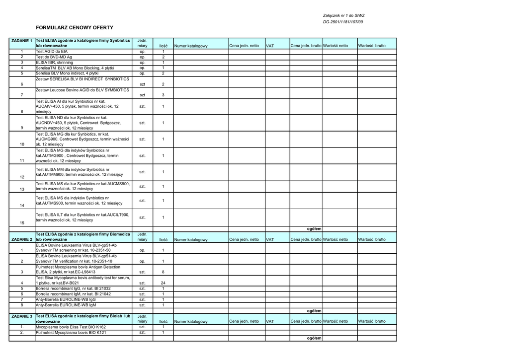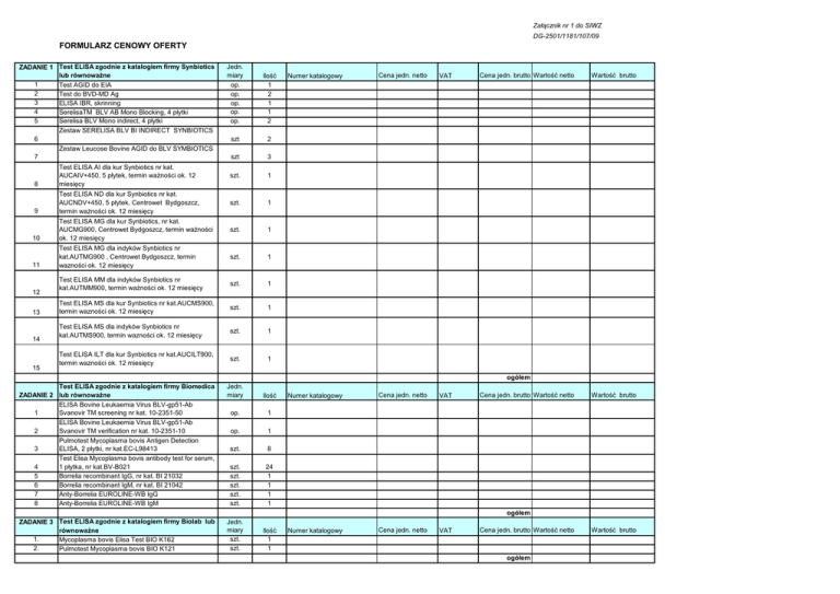 Załącznik nr 1 do SIWZ DG-2501/1181/107/09 FORMULARZ CENOWY OFERTY ZADANIE 1 Test ELISA zgodnie z katalogiem firmy Synbiotics lub równoważne 1 Test AGID do EIA 2 Test do BVD-MD Ag 3 ELISA IBR, skrinning 4 SerelisaTM BLV AB Mono Blocking, 4 płytki 5 Serelisa BLV Mono indirect, 4 płytki Zestaw SERELISA BLV BI INDIRECT SYNBIOTICS 6 Zestaw Leucose Bovine AGID do BLV SYMBIOTICS 7 Jedn. miary op. op. op. op. op. Ilość 1 2 1 1 2 szt 2 szt 3 szt. 1 8 Test ELISA AI dla kur Synbiotics nr kat. AUCAIV+450, 5 płytek, termin ważności ok. 12 miesięcy szt. 1 9 Test ELISA ND dla kur Synbiotics nr kat. AUCNDV+450, 5 płytek, Centrowet Bydgoszcz, termin ważności ok. 12 miesięcy szt. 1 10 Test ELISA MG dla kur Synbiotics, nr kat. AUCMG900, Centrowet Bydgoszcz, termin ważności ok. 12 miesięcy szt. 1 11 Test ELISA MG dla indyków Synbiotics nr kat.AUTMG900 , Centrowet Bydgoszcz, termin wazności ok. 12 miesięcy Test ELISA MM dla indyków Synbiotics nr kat.AUTMM900, termin ważności ok. 12 miesięcy szt. 1 Test ELISA MS dla kur Synbiotics nr kat.AUCMS900, termin wazności ok. 12 miesięcy szt. 1 Test ELISA MS dla indyków Synbiotics nr kat.AUTMS900, termin wazności ok. 12 miesięcy szt. 1 Test ELISA ILT dla kur Synbiotics nr kat.AUCILT900, termin wazności ok. 12 miesięcy szt. 1 12 13 14 15 Numer katalogowy Cena jedn. netto VAT Cena jedn. brutto Wartość netto Wartość brutto ogółem Test ELISA zgodnie z katalogiem firmy Biomedica ZADANIE 2 lub równoważne ELISA Bovine Leukaemia Virus BLV-gp51-Ab 1 Svanovir TM screening nr kat. 10-2351-50 ELISA Bovine Leukaemia Virus BLV-gp51-Ab 2 Svanovir TM verification nr kat. 10-2351-10 Pulmotest Mycoplasma bovis Antigen Detection 3 ELISA, 2 płytki, nr kat.EC-L98413 Test Elisa Mycoplasma bovis antibody test for serum, 4 1 płytka, nr kat.BV-B021 5 Borrelia recombinant IgG, nr kat. BI 21032 6 Borrelia recombinant IgM, nr kat. BI 21042 7 Anty-Borrelia EUROLINE-WB IgG 8 Anty-Borrelia EUROLINE-WB IgM Jedn. miary Ilość op. 1 op. 1 szt. 8 szt. szt. szt. szt. szt. 24 1 1 1 1 ZADANIE 3 Test ELISA zgodnie z katalogiem firmy Biolab lub równoważne 1. Mycoplasma bovis Elisa Test BIO K162 2. Pulmotest Mycoplasma bovis BIO K121 Jedn. miary szt. szt. Numer katalogowy Cena jedn. netto VAT Cena jedn. brutto Wartość netto Wartość brutto ogółem Ilość 1 1 Numer katalogowy Cena jedn. netto VAT Cena jedn. brutto Wartość netto ogółem Wartość brutto ZADANIE 4 Test ELISA zgodnie z katalogiem firmy Cirad lub równoważne Kit CFT PPCB 1000 serums + plaque, nr kat. 1 02230085 Jedn. miary Ilość szt. 4 ZADANIE 5 Test ELISA zgodnie z katalogiem firmy Bio X lub równoważne zestawy ELISA do wykrywania toksyny Alfa 1 C.perfringens, prod Bio X nr kat. BIO K 084 zestawy ELISA do wykrywania toksyny Beta 2 C.perfringens, prod Bio X nr kat. BIO K 094 3 IHN BIO K 198 4 Mycoplasma bovis Elisa Test BIO K162 5 Pulmotest Mycoplasma bovis BIO K121 Jedn. miary Ilość zestaw 3 zestaw op szt. szt. 3 8 8 8 Numer katalogowy Cena jedn. netto VAT Cena jedn. brutto Wartość netto Wartość brutto ogółem Numer katalogowy Cena jedn. netto VAT Cena jedn. brutto Wartość netto Wartość brutto ogółem ZADANIE 6 Test ELISA zgodnie z katalogiem firmy bioScreen lub równoważne 1 Test ELISA ENTERISOL ILEITIS TEST 2płytkowy Jedn. miary zestaw Ilość 3 Numer katalogowy Cena jedn. netto VAT Cena jedn. brutto Wartość netto Wartość brutto ogółem ZADANIE 7 1 Test ELISA zgodnie z katalogiem firmy Biosense lub równoważne Biotoksyny ASP, 48 oznaczeń, Jedn. miary szt. Ilość 5 Numer katalogowy Cena jedn. netto VAT Cena jedn. brutto Wartość netto Wartość brutto ogółem Test ELISA zgodnie z katalogiem firmy BioChek ZADANIE 8 lub równoważne 1 Test ELISA AI Ab, multispecies, nr kat.: CK401 Jedn. miary Ilość szt. 2 2 Test ELISA antygen AI , nr kat. CK 121, termin ważności ok. 12 miesięcy szt. 1 3 Test ELISA ND, nr kat.: CK 116 szt. 1 Numer katalogowy Cena jedn. netto VAT Cena jedn. brutto Wartość netto Wartość brutto ogółem ZADANIE 9 Test ELISA zgodnie z katalogiem firmy KoVax lub równoważne 1 KHV KIT Jedn. miary op. ZADANIE 10 Test ELISA zgodnie z katalogiemwg kat. FULLER LABORATORIES lub równoważne 1 Jedn. miary Ilość szt 1 Ilość 4 Numer katalogowy Cena jedn. netto VAT Cena jedn. brutto Wartość netto Wartość brutto ogółem Ff-TXG-120 Feline Toxoplasmosis IFA kit Numer katalogowy Cena jedn. netto VAT Cena jedn. brutto Wartość netto Wartość brutto ogółem ZADANIE 11 Test ELISA zgodnie z katalogiem firmy IZS Brescia lub równoważne 1 RHD serological kit PRRD010110 2 RHD virological kit PRRD010130 3 Code SVD: a complete SVD ELISA kit Zestaw do diagnostyki serologicznej RHD królików 4 Zestaw do diagnostyki serologicznej EBHS zajęcy 5 Zestaw do diagnostyki wirusologicznej RHD królików i 6 EBHS zajęcy 7 RHS016 DOT Elisa RHDVstrip Jedn. miary kit kit kit Ilość 2 2 12 zestaw 1 zestaw 1 zestaw szt. 2 6 Numer katalogowy Cena jedn. netto VAT Cena jedn. brutto Wartość netto Wartość brutto ogółem ZADANIE 12 Test ELISA zgodnie z katalogiem firmy Svanova lub równoważne 1 ELISA IBR, skrinning, 10-2100-02 2 ELISA BRSV-Ab, 10-2500-02 Jedn. miary op. op. Ilość 1 20 Numer katalogowy Cena jedn. netto VAT Cena jedn. brutto Wartość netto Wartość brutto ogółem ZADANIE 13 Test ELISA zgodnie z katalogiem firmy EUROClone SpA-Life Science Division lub równoważne 1 ELISA BRSV Ag, L98513 Jedn. miary op. Ilość 8 Numer katalogowy Cena jedn. netto VAT Cena jedn. brutto Wartość netto Wartość brutto ogółem ZADANIE 14 Test ELISA zgodnie z katalogiem firmy BIOX lub równoważne ELISA Digestive kit, BGVV B-290 (rotavirus, 1 coronavirus, E.coli K99&Cryptosporidium) ELISA Duo digestive kit, kit BGVV B-242, (Rota, 2 Corona) Zestaw Elisa Mycoplasma bovis antibody test for 3 serum, 1 płytka, nr kat. BV-B021 Jedn. miary Ilość op. 1 op. 1 szt. 16 Numer katalogowy Cena jedn. netto VAT Cena jedn. brutto Wartość netto ogółem Wartość brutto