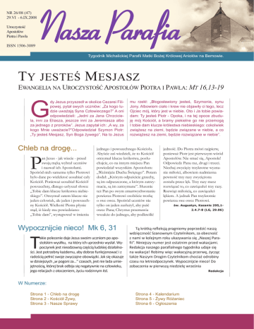 Nasza Parafia NR 26/08 (47) 29.VI - 6.IX.2008 Uroczystość Apostołów Piotra i Pawła ISSN 1506-3089 Tygodnik Michalickiej Parafii Matki Bożej Królowej Aniołów na Bemowie. Ty jesteś Mesjasz Ewangelia na Uroczystość Apostołów Piotra i Pawła: Mt 16,13-19 G dy Jezus przyszedł w okolice Cezarei Filipowej, pytał swych uczniów: „Za kogo ludzie uważają Syna Człowieczego?” A oni odpowiedzieli: „Jedni za Jana Chrzciciela, inni za Eliasza, jeszcze inni za Jeremiasza albo za jednego z proroków”. Jezus zapytał ich: „A wy, za kogo Mnie uważacie?”Odpowiedział Szymon Piotr: „Ty jesteś Mesjasz, Syn Boga żywego”. Na to Jezus Chleb na drogę... P an Jezus - jak wiecie - przed swoją męką wybrał uczniów i nazwał ich Apostołami. Spośród nich samemu tylko Piotrowi było dane po wielekroć uosabiać cały Kościół. Ponieważ uosabiał Kościół powszechny, dlatego usłyszał słowa: „Tobie dam klucze królestwa niebieskiego”. Otrzymał zatem klucze nie jeden człowiek, ale jeden i powszechny Kościół. Wielkość Piotra płynie stąd, iż kiedy mu powiedziano: „Tobie dam”, występował w imieniu jednego i powszechnego Kościoła. Abyście zaś wiedzieli, że to Kościół otrzymał klucze królestwa, posłuchajcie, co na innym miejscu Pan powiedział wszystkim Apostołom: „Weźmijcie Ducha Świętego”. Potem dodał: „Którym odpuścicie grzechy, są im odpuszczone, a którym zatrzymacie, są im zatrzymane”. Słusznie też Pan po swym zmartwychwstaniu powierza Piotrowi osobiście troskę o swe owce. Spośród uczniów nie tylko on jeden zasłużył, aby paść owce Pana; Chrystus przemawia wszakże do jednego, aby podkreślić Wypocznijcie nieco! Mk 6, 31 T mu rzekł: „Błogosławiony jesteś, Szymonie, synu Jony. Albowiem ciało i krew nie objawiły ci tego, lecz Ojciec mój, który jest w niebie. Oto i Ja tobie powiadam: Ty jesteś Piotr - Opoka, i na tej opoce zbuduję mój Kościół, a bramy piekielne go nie przemogą I tobie dam klucze królestwa niebieskiego: cokolwiek zwiążesz na ziemi, będzie związane w niebie, a co rozwiążesz na ziemi, będzie rozwiązane w niebie”. akie polecenie daje Jezus swoim uczniom po apostolskim wysiłku, na który ich uprzednio wysłał. Wypoczynek jest nieodzowną częścią ludzkiej działalności. Jest potrzebny każdemu, aby dobrze funkcjonować i z radością pełnić swoje zwyczajne obowiązki. Jak się okazuje w dzisiejszych „w pogoni za…” czasach, jest nie lada umiejętnością, której brak odbija się negatywnie na człowieku, jego relacjach z otoczeniem, życiu rodzinnym itd. jedność. Do Piotra mówi najpierw, ponieważ Piotr jest pierwszym wśród Apostołów. Nie smuć się, Apostole! Odpowiedz Panu raz, drugi i trzeci. Niechaj zwycięży trzykrotne wyznanie miłości, albowiem nadmierna pewność trzy razy zwyciężona została przez lęk. Trzy razy masz rozwiązać to, co zawiązałeś trzy razy. Rozwiąż miłością, co zawiązałeś lękiem. A jednak Pan trzykrotnie powierza swe owce Piotrowi. św. Augustyn, Kazanie 295,1- Tą krótką refleksją pragniemy poprzedzić naszą wdzięczność Szanownym Czytelnikom, za obecność z nami w kolejnym roku ukazywania się „Naszej Parafii”. Niniejszy numer jest ostatnim przed wakacjami. Redakcja naszego parafialnego tygodnika udaje się na wakacje! Robimy więc wakacyjną przerwę, życząc także Naszym Drogim Czytelnikom chociaż odrobiny czasu na letniodpoczynek. Wypocznijcie nieco! Do zobaczenia w pierwszą niedzielę września Redakcja W Numerze: Strona 1 - Chleb na drogę Strona 2 - Kościół Żywy, Strona 3 - Nasze Sprawy 2.4.7-8 (LG, 29.06) Strona 4 - Kalendarium Strona 5 - Żywy Różaniec Strona 6 - Ogłoszenia 2 Nasza Parafia 26/2008 Mów bo Twój Bóg słucha... Kościół Żywy Bóg stając się człowiekiem w osobie Jezusa Chrystusa przybliżył się do mnie między innymi po to bym ja pragnął adorować Jego, tak jak mąż adorujący żonę, którą kocha i uwielbia. On przybliżył się do mnie, więc ja nie mogę stać z dala od Niego. Z adajemy sobie często pytanie dotyczące naszej egzystencji. Pytanie to brzmi: Kim tak naprawdę my jesteśmy? Co można o nas powiedzieć w epoce, w której upadła ideologia kolektywu albo inaczej utopijnej komuny i dialektyzmu materialistycznego a światem zaczęła rządzić wolność i demokracja? Mówią o nas, że jesteśmy pokoleniem tsunami. Jest między nami wielu ludzi, którzy potrafią jedynie niszczyć i psuć. Mamy wielu wspaniałych egoistów, których nadrzędną rolą i zasadą życia jest teoria ,,wielkich grabi”, aby wszystko zagarnąć dla siebie, nie licząc się przy tym z nikim i niczym! Kiedyś nie było nic, dziś jest wszystko! Za pieniądze mogę wszystko! Liczę się tylko ja, nie liczy się nikt inny, nawet mąż, żona, dzieci, przyjaciele. Czubek własnego nosa, nic poza tym! Materializm sięgający zenitu za cenę zdrowych relacji z innymi, miłości, przyjaźni! Świat, w którym żyjemy nieustannie goni za pieniądzem. Nie mamy czasu dla dzieci, przyjaciół, stawiając wyżej zakupy w sklepie, oglądając wystawy z lekkim poddenerwowaniem, że jest znowu coś w sklepie czego jeszcze nie mamy. Potrafimy dziś do wszystkiego podejść tylko ekonomicznie! Ale gdzie jest tak naprawdę człowiek? Gdzie w moim życiu jest miejsce dla Boga? Czy ja mam jeszcze czas na spotkanie z Nim w adoracji, kiedy ja mogę patrzeć na Niego, a On na mnie?! Kiedy pochłania nas adorowanie bilbordów i reklam, fascynujących sprzętów i przepięknych ciuchów. Jakże jesteśmy godni politowania, mali i nędzni wobec Boga, który powinien być dla nas wszystkim! Święty Wincenty Pallotti często stawał przed Jego Majestatem na klęczkach , z poczuciem wielkiej niegodności i wielkiej grzeszności. Jeśli istnieje jakaś tajemnica adoracji, to jest nią tajemnica zanurzająca i przyjmująca moje grzeszne ciało w Jego doskonałości. A wszystko to z miłości 