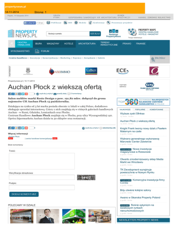 propertynews.pl 14-11-2014 Strona: 1 GRUPA PTWP: Piątek, 14 listopada 2014 Lubię to! RYNEK G O S P O D A R K A S A M O R Z Ą D Y H R ARCHITEKTURA S P O Ż Y W C Z Y Publikacje 1,6 tys. RSS Moduły Konferencje HANDEL ZDROWIE R O L N I C T W O Prezentacje projektów CENTRA HANDLOWE HOTELE • MAGAZYNY SZUKAJ Szukaj w portalu Twoja lokalizacja: CENTRA HANDLOWE BIURA WYKONAWSTWO MAGAZYNY HOTELE ARCHITEKTURA TERENY INWESTYCYJNE PRAWO FINANSE FORUM ZALOGUJ SIĘ Centra handlowe | Inwestycje | Komercjalizacja | Marketing | Najemcy | Zarządzanie | Galerie Propertynews.pl | 14-11-2014 Auchan Płock z wiekszą ofertą 0 wydrukuj artykuł prześlij dalej 0 komentarzy Salon meblów marki Resto Design o pow. 191,82 mkw. dołączył do grona najemców CH Auchan Płock 15 października. Działająca na rynku od 3 lat marka posiada obecnie 11 lokali w całej Polsce, dodatkowo obsługuje sprzedaż internetową. Cztery z nich znajdują się w różnych galeriach handlowych Auchan - w Rumi, Gdańsku, Łomiankach oraz Płocku. Centrum Handlowe Auchan Płock znajduje się w Płocku, przy ulicy Wyszogrodzkiej 140. Oprócz hipermarketu Auchan działa tu 30 sklepów oraz restauracji. NAJNOWSZE POPULARNE KOMENTOWANE Wyższe zyski Sfinksa 13 min. temu Auchan Płock z wiekszą ofertą 14 min. temu 0 Więcej informacji Auchan Płock RSS | centra handlowe komercjalizacja RSS Brak komentarzy Treść: wydrukuj artykuł skomentuj (0) Knight Frank tworzy nowy dział z Pawłem Maternym na czele 2 godz. temu Wybrano generalnego wykonawcę Marcredo Center Zawiercie 2 godz. temu TYLKO U NAS Nowa inwestycja magazynowa w Rzeszowie 4 godz. temu Otwarto zmodernizowany sklep Media Markt we Wrocławiu 4 godz. temu Weryfikacja obrazkowa: TK Development wynajmuje powierzchnie w Nowym Rynku 4 godz. temu TYLKO U NAS Podpis: Komercyjna inwestycja firmy Cordia 4 godz. temu Briju otwiera kolejne salony DODAJ KOMENTARZ 4 godz. temu Awans w Skanska Property Poland 5 godz. temu POLECAMY W DZIALE POLECAMY Rośnie optymizm na światowych rynkach nieruchomościowych 5 godz. temu NEWSLETTER PROPERTY NEWS propertynews.pl 14-11-2014 Otwarto zmodernizowany sklep Media Markt we Wrocławiu Strona: 2 Rośnie optymizm na światowych rynkach nieruchomościowych Wzrost rentowności sklepów sieci Stokrotka Drogerie Dayli rozbudują siec w mniejszych miastach i w Niemczech ZAPISZ Podaj e-mail MULTIMEDIA KUKE ostrzega: sytuacja na Wschodzie zwiększy liczbę upadłości na początku 2015 roku 1,5 mld zł na wsparcie ekspansji zagranicznej polskich firm Hiszpańska sieć z zabawkami zadebiutowała w Polsce - zobacz zdjęcia Retail Map Hotels Map Warehouses Map Twoja lokalizacja [ZMIEŃ] Przejdź do mapy Podaj nazwę centrum handlowego KALENDARIUM Interbiuro i Propertynews.pl zapraszają na film 19 listopada 2014, Property Forum Wrocław 8 grudnia 2014, Wrocław II Forum Dobrego Designu 10 grudnia 2014, OSTATNIO NA FORUM GTC poprawia wyniki operacyjne paula ,kriss: z tym titaniciem to trochę popłynąłeś ;) ja osobiście mam dosyć jeżdżenia po większe zakupy do propertynews.pl 14-11-2014 Strona: 3 innych dzielnic, bo teraz nie da się załatwić wszystkich spraw w jednym miejscu... Stolicy przybędą kolejne pięciogwiazdkowe hotele aaa ,Polonia Palace ma 4 gwiazdki Nowa marka od LPP już wiosną 2016 roku dsfasf ,Wreszcie POLECANE PROJEKTY PROPERTY NEWS BUSINESS PARK MARYWILSKA | Emmerson S.A. Agencja Mienia Wojskowego KCI S.A. Kraków - ZESPÓŁ BIUROWO-MIESZKANIOWY REDAKCJA • REKLAMA • REGULAMIN • POLITYKA PRYWATNOŚCI • POLITYKA COOKIES • KONTAKT • MODUŁY INFORMACJI • RSS • PARTNERZY Centra handlowe Biura Magazyny Hotele Finanse Katowice Warszawa Inwestycje Inwestycje Inwestycje Inwestycje Waluty Kraków Trójmiasto Komercjalizacja Komercjalizacja Komercjalizacja Sieci Akcje i indeksy Łódź Szczecin Marketing Najemcy Zarządzanie Euro 2012 Komentarze giełdowe Poznań Wrocław POLECAMY W SERWISACH Specjalizujemy się w tworzeniu zintegrowanych rozwiązań w obszarze komunikacji biznesowej. Serwisy i wydawnictwa o budowie i urządzaniu domu.