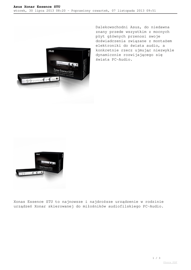Asus Xonar Essence STU wtorek, 30 lipca 2013 08:20 - Poprawiony czwartek, 07 listopada 2013 09:51 Dalekowschodni Asus, do niedawna znany przede wszystkim z mocnych płyt głównych przenosi swoje doświadczenia związane z montażem elektroniki do świata audio, a konkretnie rzecz ujmując niezwykle dynamicznie rozwijającego się świata PC-Audio. Xonas Essence STU to najnowsze i najdroższe urządzenie w rodzinie urządzeń Xonar skierowanej do miłośników audiofilskiego PC-Audio. 1 / 3 Phoca PDF Asus Xonar Essence STU wtorek, 30 lipca 2013 08:20 - Poprawiony czwartek, 07 listopada 2013 09:51 Podobnie jak marki takie jak NuForce, FiiO, Astell&Kern, Asus Xonar wypłynął w ostatnich latach na fali rosnącej popularności audiofilskich rozwiązań PC-Audio wśród młodego pokolenia. Decydując się na wypuszczenie na rynek tak drogiego urządzenia jak STU, Asus podejmuje rękawice rzuconą przez Arcama i Cambridge Audio - czy faktycznie będzie miał czym walczyć z tak doświadczonymi producentami sprzętu hi-fi? Prawdopodobnie nie będzie takiej potrzeby, ponieważ Xonar Essence STU stawia na zdecydowanie młodszą grupę docelową - nie bez powodu wręcz zachęca do wymiany op-ampów w Essence STU oraz rozbiera jego budowę na części pierwsze. 2 / 3 Phoca PDF Asus Xonar Essence STU wtorek, 30 lipca 2013 08:20 - Poprawiony czwartek, 07 listopada 2013 09:51 Pomijając dywagacje na temat docelowego segmentu, Xonar Essence STU wygląda na bardzo porządne urządzenie. Oparte na procesorze C-Media CM6631A, opampach Texas Instruments, kondensatorach WIMA oraz Nichicon oraz co najważniejsze na przetworniku DAC Texas Instruments PCM1792a sprawia wrażenie bardzo dobrego wyboru w swoim zakresie cenowym. Szokujące wrażenie robią parametry pracy Xonara. Stosunek sygnał szum na poziomie 120 decybeli oraz zniekształcenia THD 0.00036% to parametry wręcz hiendowe. Do tego asynchroniczne wejście USB z transmisją danych do poziomu 24 / 192. Komplet klasycznych niezbalansowanych wejść cyfrowych, porządny wzmacniacz słuchawkowy na pokładzie i niezbalansowane wyjście liniowe to kolejne argumenty za. Pozostaje kwestia brzmienia - czekamy na recenzje! Cena i specyfikacja Asus Xonar Essence STU 3 / 3 Phoca PDF