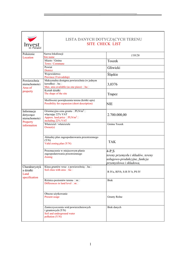 LISTA DANYCH DOTYCZĄCYCH TERENU SITE CHECK LIST Położenie Location Powierzchnia nieruchomości Area of property Nazwa lokalizacji Site name Miasto / Gmina Town / Commune Powiat District Województwo Province (Voivodship) Maksymalna dostępna powierzchnia (w jednym kawałku) ha Max. area available (as one piece) ha Kształt działki The shape of the site Możliwości powiększenia terenu (krótki opis) Possibility for expansion (short description) Informacje dotyczące nieruchomości Property information Orientacyjna cena gruntu PLN/m2 włączając 22% VAT Approx. land price PLN/m2 including 22% VAT Właściciel / właściciele Owner(s) Gliwicki Śląskie 3,0376 Trapez NIE Gmina Toszek Przeznaczenie w miejscowym planie zagospodarowania przestrzennego Zoning Klasa gruntów wraz z powierzchnią Soil class with area ha Toszek 2.700.000,00 Aktualny plan zagospodarowania przestrzennego (T/N) Valid zoning plan (Y/N) Charakterystyk a działki Land specification 110/26 TAK 4-P,S tereny przemysłu i składów, tereny usługowo-produkcyjne, funkcja przemysłowa i składowa, ha R IVa, RIVb, S-R IV b, PS IV Różnica poziomów terenu m Differences in land level m Brak Obecne użytkowanie Present usage Grunty Rolne Zanieczyszczenia wód powierzchniowych i gruntowych (T/N) Soil and underground water pollution (Y/N) 1 Brak danych Poziom wód gruntowych m Underground water level m Brak danych Czy były prowadzone badania geologiczne terenu (T/N) Were geological research done (Y/N) Ryzyko wystąpienia zalań lub obsunięć terenu (T/N) Risk of flooding or land slide (Y/N) Brak danych NIE Przeszkody podziemne (T/N) Underground obstacles (Y/N) Brak danych Przeszkody występujące na powierzchni terenu (T/N) Ground and overhead obstacles (Y/N) (np. linie energetyczne, drogi przechodzące przez teren, zbiorniki i cieki wodne, kanały, obiekty pod ochroną itp.) brak Połączenia transportowe Transport links Istniejące ograniczenia ekologiczne (T/N) Ecological restrictions (Y/N) NIE Budynki i zabudowania na terenie (T/N) Buildings / other constructions on site (Y/N) NIE Droga dojazdowa do terenu (rodzaj drogi i jej szerokość) Access road to the plot (type and width of access road) Autostrada / droga krajowa km Nearest motorway / national road A 4 – 10 km A 1 – ok. 20 km km Porty rzeczne i morskie w odległości do 200 km Sea and river ports located up to 200 km Kolej km Railway line km Bocznica kolejowa km Railway siding km Istniejąca infrastruktura Existing infrastructure km Katowice – Pyrzowice 50 km km Elektryczność na terenie (T/N) Electricity (Y/N) Gliwice 25km, Opole – 50km Kędzierzyn-Koźle -40km Wrocław -150km Toszek 4km Toszek 4 km Najbliższe lotnisko międzynarodowe Nearest international airport km Najbliższe miasto wojewódzkie Nearest province capital km Droga Powiatowa – jezdnia 6m Odległość przyłącza od granicy terenu Connection point (distance from boundary) m Katowice – 50 km Opole – 50 km Brak przyłącza energetycznego Sieć energetyczna w odległości około 350 m od granicy działki. Napięcie Voltage kV brak danych Dostępna moc Available capacity MW Gaz na terenie (T/N) Gas (Y/N) NIE Odległość przyłącza od granicy działki Connection point (distance from boundary) m Wartość kaloryczna Calorific value MJ/Nm3 Średnica rury Pipe diameter mm Dostępna objętość Available capacity Nm3/h 38 Brak danych NIE Odległość przyłącza od granicy terenu Connection point (distance from boundary) m Dostępna objętość Available capacity m3/24h Kanalizacja na terenie (T/N) Sewage discharge (Y/N) Odległość przyłącza od granicy terenu Connection point (distance from boundary) m Dostępna objętość Available capacity m3/24h Oczyszczalnia ścieków na terenie bądź w bezpośrednim sąsiedztwie Treatment plant (Y/N) Telefony (T/N) Telephone (Y/N) 1000 m 100 Woda na terenie (T/N) Water supply (Y/N) brak danych Odległość przyłącza od granicy terenu Connection point (distance from boundary) m 350m Brak danych NIE (terenu) brak danych Brak danych NIE NIE 350 Uwagi Comments Osoba przygotowująca ofertę Offer prepared by Osoby do kontaktu Contact person Imię, nazwisko, stanowisko, tel., tel. komórkowy, e-mail, znajomość języków obcych Ewelina Czyżowicz – Inspektor w Referacie Nieruchomości, Rolnictwa i ochrony środowiska Tel.: 32 237 80 28 e-mail: [email protected] Jacek Doliński – Podinspektor w Referacie Inwestycji, Spraw komunalnych i Planowania Przestrzennego Tel.: 32 237 80 21 e-mail: [email protected] Imię, nazwisko, stanowisko, tel., tel. komórkowy, e-mail, znajomość języków obcych Ewelina Czyżowicz – Inspektor w Referacie Nieruchomości, Rolnictwa i ochrony środowiska Tel.: 32 237 80 28 e-mail: [email protected] Jacek Doliński – Podinspektor Referacie Inwestycji, Spraw komunalnych i Planowania Przestrzennego Tel.: 32 237 80 21 e-mail: [email protected]