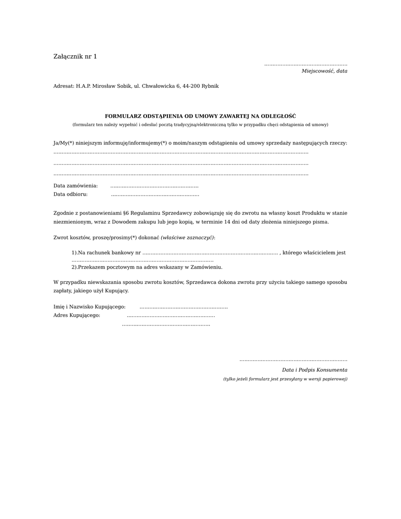 Załączniknr1 ……………..……………………………. Miejscowość,data Adresat:H.A.P.MirosławSobik,ul.Chwałowicka6,44-200Rybnik FORMULARZODSTĄPIENIAODUMOWYZAWARTEJNAODLEGŁOŚĆ (formularztennależywypełnićiodesłaćpocztątradycyjną/elektronicznątylkowprzypadkuchęciodstąpieniaodumowy) Ja/My(*)niniejszyminformuję/informujemy(*)omoim/naszymodstąpieniuodumowysprzedażynastępującychrzeczy: ………………………………………………………………………………………………………………………………………… ………………………………………………………………………………………………………………………………………… ………………………………………………………………………………………………………………………………………… Datazamówienia:……………………………………………… Dataodbioru:……………………………………………… Zgodniezpostanowieniami§6RegulaminuSprzedawcyzobowiązujęsiędozwrotunawłasnykosztProduktuwstanie niezmienionym,wrazzDowodemzakupulubjegokopią,wterminie14dnioddatyzłożenianiniejszegopisma. Zwrotkosztów,proszę/prosimy(*)dokonać(właściwezaznaczyć): 1).Narachunekbankowynr………………………………………………………………………..,któregowłaścicielemjest ……………………………………………………………...…………… 2).PrzekazempocztowymnaadreswskazanywZamówieniu. Wprzypadkuniewskazaniasposobuzwrotukosztów,Sprzedawcadokonazwrotuprzyużyciutakiegosamegosposobu zapłaty,jakiegoużyłKupujący. ImięiNazwiskoKupującego:……………………………………………… AdresKupującego:……………………………………………… ……………………………………………… ………………………………………………………… DataiPodpisKonsumenta (tylkojeżeliformularzjestprzesyłanywwersjipapierowej)