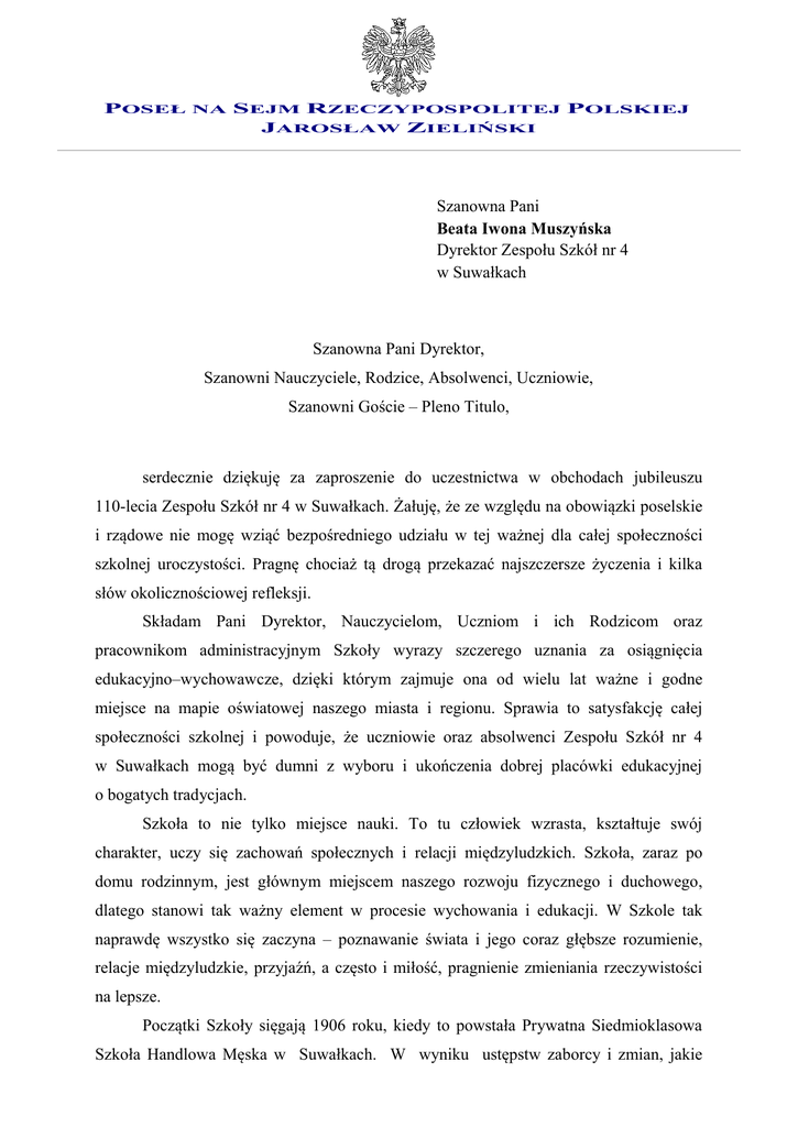 POSEŁ NA SEJM RZECZYPOSPOLITEJ POLSKIEJ JAROSŁAW ZIELIŃSKI Szanowna Pani Beata Iwona Muszyńska Dyrektor Zespołu Szkół nr 4 w Suwałkach Szanowna Pani Dyrektor, Szanowni Nauczyciele, Rodzice, Absolwenci, Uczniowie, Szanowni Goście – Pleno Titulo, serdecznie dziękuję za zaproszenie do uczestnictwa w obchodach jubileuszu 110-lecia Zespołu Szkół nr 4 w Suwałkach. Żałuję, że ze względu na obowiązki poselskie i rządowe nie mogę wziąć bezpośredniego udziału w tej ważnej dla całej społeczności szkolnej uroczystości. Pragnę chociaż tą drogą przekazać najszczersze życzenia i kilka słów okolicznościowej refleksji. Składam Pani Dyrektor, Nauczycielom, Uczniom i ich Rodzicom oraz pracownikom administracyjnym Szkoły wyrazy szczerego uznania za osiągnięcia edukacyjno–wychowawcze, dzięki którym zajmuje ona od wielu lat ważne i godne miejsce na mapie oświatowej naszego miasta i regionu. Sprawia to satysfakcję całej społeczności szkolnej i powoduje, że uczniowie oraz absolwenci Zespołu Szkół nr 4 w Suwałkach mogą być dumni z wyboru i ukończenia dobrej placówki edukacyjnej o bogatych tradycjach. Szkoła to nie tylko miejsce nauki. To tu człowiek wzrasta, kształtuje swój charakter, uczy się zachowań społecznych i relacji międzyludzkich. Szkoła, zaraz po domu rodzinnym, jest głównym miejscem naszego rozwoju fizycznego i duchowego, dlatego stanowi tak ważny element w procesie wychowania i edukacji. W Szkole tak naprawdę wszystko się zaczyna – poznawanie świata i jego coraz głębsze rozumienie, relacje międzyludzkie, przyjaźń, a często i miłość, pragnienie zmieniania rzeczywistości na lepsze. Początki Szkoły sięgają 1906 roku, kiedy to powstała Prywatna Siedmioklasowa Szkoła Handlowa Męska w Suwałkach. W wyniku ustępstw zaborcy i zmian, jakie dokonały się w strukturze oświatowej w zaborze rosyjskim po rewolucji 1905 roku i tzw. strajku szkolnym, umożliwiono nauczanie w języku polskim, ale tylko w prywatnych szkołach. Suwalczanie wykorzystali tę możliwość i samorzutnie zorganizowali zbiórkę pieniędzy fundując prywatną szkołę. Już wtedy nowopowstała placówka wyróżniała się wśród funkcjonujących placówek oświatowych w regionie, które w większości były zarządzane przez zaborcę, a prowadzone w nich nauczanie odbywało się wyłącznie w języku rosyjskim. Prywatna Siedmioklasowa Szkoła Handlowa Męska w Suwałkach była nie tylko ważną placówką edukacyjną, ale przede wszystkim oświatową ostoją polskości. Późniejsza działalność szkoły, która zintensyfikowała się po I wojnie światowej ugruntowała jej pozycję i prestiż wśród innych placówek tego typu. W trakcie swojej działalności Szkoła kilkakrotnie zmieniała swoją siedzibę, aby wreszcie na stałe, w specjalnie do tego wybudowanym budynku, kontynuować edukacyjną misję wśród społeczeństwa Suwałk i Suwalszczyzny. Mimo przekształceń, które przez lata zmieniały i poszerzały profil edukacyjny Szkoły, nie utraciła ona swego pierwotnego charakteru i wciąż przez mieszkańców Suwałk utożsamiana jest ze swoim głównym nurtem kształcenia obejmującym naukę w zawodzie handlowca i ekonomisty. Po dziś dzień w świadomości suwalczan jest ona obecna jako liceum ekonomiczne albo po prostu ekonomiak. W kontekście dzisiejszego jubileuszowego spotkania i historii Szkoły należy podkreślić wartość autorytetu wychowawcy. To nauczyciele i pracownicy przez lata, poprzez swój osobisty wkład, budowali jej pozycję i przyczyniali się do jej wzrostu. To w głównej mierze od polskich nauczycieli i pedagogów zależy również przyszłość naszej Ojczyzny. Polska szkoła nie tylko przekazuje wiedzę, ale aktywnie uczestniczy w kształtowaniu postaw i charakterów młodego pokolenia. Przecież „takie Rzeczypospolite będą, jakie ich młodzieży chowanie”. Na szczególne podkreślenie zasługują zwłaszcza te aspekty pracy wychowawczej, które bywają często bagatelizowane, a powinny stać się jedną z ważniejszych ról i celów – kształtowanie wśród uczniów postaw patriotycznych i obywatelskich oraz przywiązania do polskiej tradycji narodowej i utrwalonego wiarą naszych ojców systemu aksjologicznego. Cieszy mnie, że Zespół Szkół nr 4 w Suwałkach pamięta o spuściźnie i wartościach przyświecających jego historycznym fundatorom. Dowodem na to jest obecna działalność Szkoły, która wywiązuje się w sposób wzorowy z powierzonej jej misji oświatowej dbając nie tylko o rozwój intelektualny uczniów, ale także o kształtowanie ich postaw patriotycznych, kultywowanie tradycji przodków, oraz pamięci o Żołnierzach Wyklętych i ofiarach Obławy Augustowskiej. Jestem przekonany, że dzięki takim szkołom jak Zespół Szkół nr 4 w Suwałkach i pracującym w nich nauczycielom pamięć o naszej historii będzie zawsze żywa, a wartości wyznawane przez naszych przodków znajdą swych naśladowców w młodym pokoleniu. Z Zespołem Szkół Ekonomicznych związany czuję się również osobiście. Przez znaczną część mojej oświatowej aktywności zawodowej w roli Kuratora Oświaty, a potem także Wiceministra Edukacji i Nauki łączyły mnie ze społecznością szkolną więzi służbowe, ale również, jako mieszkańca Suwałk, bardziej prywatne. Znałem przecież kolejnych dyrektorów i wielu nauczycieli, a także pracowników Szkoły. W ostatnich latach spotykam się jako Poseł Rzeczypospolitej z uczniami, w szczególności w związku z ich licznym udziałem w organizowanym przeze mnie Konkursie HistorycznoLiterackim zatytułowanym „By czas nie zaćmił i niepamięć”. W poszukiwaniu prawdy o Katyniu, Smoleńsku i Obławie Augustowskiej. Z głębi serca życzę całej społeczności Zespołu Szkół nr 4 w Suwałkach kolejnych lat owocnej pracy i niesłabnącego zaangażowania w edukacyjne dzieło pokoleń. Dziękuję wszystkim kolejnym dyrektorom, nauczyciel