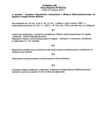 UCHWAŁA NR. Rady Miejskiej W Mosinie z dnia 27 czerwca 2013 r. w sprawie: przyjęcia Regulaminu korzystania z Miejsca Wykorzystywanego do Kąpieli w miejscowości Mosina Na podstawie art. 40 ust. 2 pkt 4 i art. 41 ust. I ustawy z dnia 8 marca 1990 r. o samorządzie gminnym (t.j. Dz. U. z200lr., Nr 142, poz. 1591) uchwala się, co następuje: Ustala się następujący regulamin porządkowy miejsca wykorzystywanego do kąpieli „Glinianki”, zwane dalejregulaminem: Regulamin miejsca wykorzystywanego do kąpieli „Glinianki” w brzmieniu określonym w załączniku nr I do uchwały, - 2. Regulaminy podaje się do publicznej informacji poprzez zamieszczenie na tablicach na obszarze w/w obiektu. 3. Wykonanie uchwały powierza się Burmistrzowi Gminy Mosina. 4. Uchwała podlega publikacji w dzienniku Urzędowym Województwa Wielkopolskiego i wchodzi w życie po upływie 14 dni od dnia jej ogłoszenia. Uzasadnienie W związku z organizacją miejsca wykorzystywanego do kąpieli nad zbiornikiem „Glinianki” w Mosinie oraz dbając o zapewnienie bezpieczeństwa korzystającym z niego mieszkańcom Gminy Mosina oraz turystom, niezbędne jest uregulowanie prawne zasad i trybu korzystania z przedmiotowego miejsca. Do kompetencji Rady należy wydanie aktu prawa miejscowego w tym zakresie, zgodnie z art.40 ust2 pkt 4 ustawy z dnia 8 marca 1990r. o samorządzie gminnym (tj. Dz.U. z 2001r. Nr142 poz.1591 z późn. zm.) Uchwalenie Regulaminu nałoży na osoby korzystające z kąpieli, obowiązek stosowania określonych norm i zasad zachowania, a zarazem jest konieczne w odniesieniu do ewentualnych roszczeń odszkodowawczych z tytułu nieszczęśliwych wypadków, kierowanych do Gminy Mosina Załącznik Nr 1 do Uchwały Nr Rady Miejskiej w Mosinie z dnia 27 czerwca 2013 roku Regulamin porządkowy miejsca wykorzystywanego do kąpieli „GLINIANKI” 1. 2. 3. 4. 5. 6. 7. 8. 9. 10. 11. 12. 13. 14. Miejsce wykorzystywane do kąpieli jest obiektem Gminy Mosina. Organizatorem miejsca wykorzystywanego do kąpieli jest Burmistrz Gminy MosinaJGmina Mosina Miejsce wykorzystywane do kąpieli jest czynne codziennie w godzinach 9.00-17.00, w okresie letnim od I lipca do 31 sierpnia. Korzystanie z miejsca wykorzystywanego do kąpieli, plaży i pasa zieleni jest bezpłatne. Organizator nie ponosi odpowiedzialności materialnej za przedmioty i rzeczy pozostawione bez opieki. Dzieci do lat 7 mogą przebywać na terenie miejsca wykorzystywanego do kąpieli wyłącznie pod opieką osób dorosłych. Zabrania się: a. wstępu na teren miejsca wykorzystywanego do kąpieli osobom, których stan wskazuje na spożycie alkoholu b. sprzedaży, podawania, wnoszenia i spożywania napojów alkoholowych na terenie miejsca wykorzystywanego do kąpieli. Osoby przebywające na terenie miejsca wykorzystywanego do kąpieli obowiązuje noszenie stroju kąpielowego. Na terenie całego zbiornika obowiązuje zakaz pływania skuterami i łodziami motorowymi, z wyłączeniem służb porządkowych i ratunkowych. Leżakowanie dozwolone jest na całym terenie miejsca wykorzystywanego do kąpieli z wyjątkiem stref wydzielonych liną z chorągiewkami. Ratownikami są osoby noszące czerwone spodenki i żółte koszulki z emblematami WOPR. Osoby przebywające na terenie miejsca wykorzystywanego do kąpieli zobowiązane są stosować się do poleceń ratowników. Kąpiel dozwolona jest w czasie godzin otwarcia miejsca wykorzystywanego do miejsca wykorzystywanego do kąpieli, gdy wywieszona jest biała flaga. Osobom znajdującym się na terenie miejsca wykorzystywanego do kąpieli nie wolno: a. przekraczać granicy strefy oznaczonej bojami żółtymi (głębokość do 1.20m), jeśli nie umieją pływać, b. przekraczać granicy strefy oznaczonej bojami czerwonymi (głębokość do 3m), c. wchodzić do wody wbrew zakazowi ratowników oraz w czasie, w którym wywieszona jest czerwona flaga, d. przekraczać granicy stref oznakowanych liną z chorągiewkami, e. zakłócać wypoczynku innych osób, popychać i wrzucać do wody, f. wchodzić na wieże i łodzie ratownicze, g. pływać na pontonach, materacach i innym sprzęcie pneumatycznym pływającym za strefą żółtych boi, h. korzystać ze sprzętu pływającego w strefie wyznaczonej do kąpieli, i. wprowadzać zwierząt gospodarskich i domowych oraz ich kąpieli, j. łowić ryb, k. zaśmiecać i brudzić terenu kąpieliska, 15. 16. 17. 18. 19. 1. niszczyć urządzeń i sprzętu kąpieliska. m. zanieczyszczania wody, używania środków piorących i higieny osobistej. Grupy zorganizowane zgłaszają swoją obecność u starszego ratownika. Osoby naruszające porządek publiczny lub przepisy niniejszego regulaminu będą usuwane z terenu kąpieliska. Osoby niszczące i uszkadzające sprzęt wodny lub urządzenia miejsca wykorzystywanego do kąpieli ponoszą odpowiedzialność materialną za wyrządzone szkody. Skargi i wnioski należy składać w Urzędzie Miejskim w Mosinie. W przypadku łamania zapisów Regulaminu należy skontaktować się ze Strażą Miejską w Mosinie pod numerem telefonu 501467312 lub Policją pod numerem alarmowym 112.