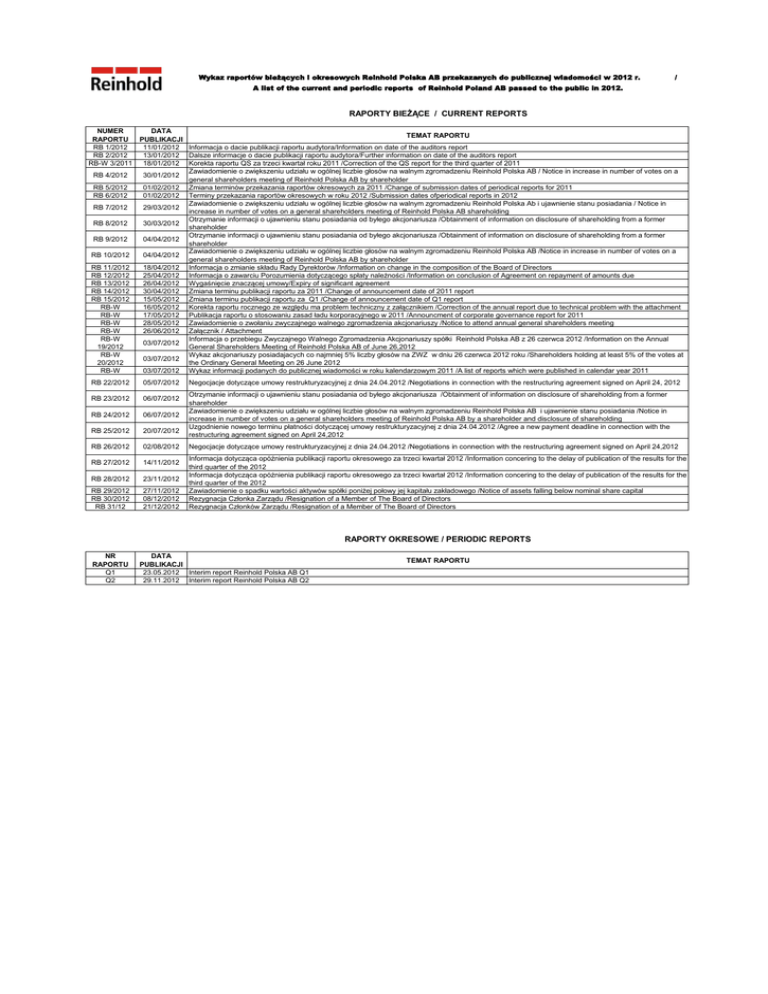 Wykaz raportów bieżących i okresowych Reinhold Polska AB przekazanych do publicznej wiadomości w 2012 r. / A list of the current and periodic reports of Reinhold Poland AB passed to the public in 2012. RAPORTY BIEŻĄCE / CURRENT REPORTS NUMER DATA TEMAT RAPORTU RAPORTU PUBLIKACJI RB 1/2012 11/01/2012 Informacja o dacie publikacji raportu audytora/Information on date of the auditors report RB 2/2012 13/01/2012 Dalsze informacje o dacie publikacji raportu audytora/Further information on date of the auditors report RB-W 3/2011 18/01/2012 Korekta raportu QS za trzeci kwartał roku 2011 /Correction of the QS report for the third quarter of 2011 Zawiadomienie o zwiększeniu udziału w ogólnej liczbie głosów na walnym zgromadzeniu Reinhold Polska AB / Notice in increase in number of votes on a RB 4/2012 30/01/2012 general shareholders meeting of Reinhold Polska AB by shareholder RB 5/2012 01/02/2012 Zmiana terminów przekazania raportów okresowych za 2011 /Change of submission dates of periodical reports for 2011 RB 6/2012 01/02/2012 Terminy przekazania raportów okresowych w roku 2012 /Submission dates ofperiodical reports in 2012 Zawiadomienie o zwiększeniu udziału w ogólnej liczbie głosów na walnym zgromadzeniu Reinhold Polska Ab i ujawnienie stanu posiadania / Notice in RB 7/2012 29/03/2012 increase in number of votes on a general shareholders meeting of Reinhold Polska AB shareholding Otrzymanie informacji o ujawnieniu stanu posiadania od byłego akcjonariusza /Obtainment of information on disclosure of shareholding from a former RB 8/2012 30/03/2012 shareholder Otrzymanie informacji o ujawnieniu stanu posiadania od byłego akcjonariusza /Obtainment of information on disclosure of shareholding from a former RB 9/2012 04/04/2012 shareholder Zawiadomienie o zwiększeniu udziału w ogólnej liczbie głosów na walnym zgromadzeniu Reinhold Polska AB /Notice in increase in number of votes on a RB 10/2012 04/04/2012 general shareholders meeting of Reinhold Polska AB by shareholder RB 11/2012 18/04/2012 Informacja o zmianie składu Rady Dyrektorów /Information on change in the composition of the Board of Directors RB 12/2012 25/04/2012 Informacja o zawarciu Porozumienia dotyczącego spłaty należności /Information on conclusion of Agreement on repayment of amounts due RB 13/2012 26/04/2012 Wygaśnięcie znaczącej umowy/Expiry of significant agreement RB 14/2012 30/04/2012 Zmiana terminu publikacji raportu za 2011 /Change of announcement date of 2011 report RB 15/2012 15/05/2012 Zmiana terminu publikacji raportu za Q1 /Change of announcement date of Q1 report RB-W 16/05/2012 Korekta raportu rocznego ze względu ma problem techniczny z załącznikiem /Correction of the annual report due to technical problem with the attachment RB-W 17/05/2012 Publikacja raportu o stosowaniu zasad ładu korporacyjnego w 2011 /Announcment of corporate governance report for 2011 RB-W 28/05/2012 Zawiadomienie o zwołaniu zwyczajnego walnego zgromadzenia akcjonariuszy /Notice to attend annual general shareholders meeting RB-W 26/06/2012 Załącznik / Attachment RB-W Informacja o przebiegu Zwyczajnego Walnego Zgromadzenia Akcjonariuszy spółki Reinhold Polska AB z 26 czerwca 2012 /Information on the Annual 03/07/2012 19/2012 General Shareholders Meeting of Reinhold Polska AB of June 26,2012 RB-W Wykaz akcjonariuszy posiadajacych co najmniej 5% liczby głosów na ZWZ w dniu 26 czerwca 2012 roku /Shareholders holding at least 5% of the votes at 03/07/2012 20/2012 the Ordinary General Meeting on 26 June 2012 RB-W 03/07/2012 Wykaz informacji podanych do publicznej wiadomości w roku kalendarzowym 2011 /A list of reports which were published in calendar year 2011 RB 22/2012 05/07/2012 RB 23/2012 06/07/2012 RB 24/2012 06/07/2012 RB 25/2012 20/07/2012 RB 26/2012 02/08/2012 RB 27/2012 14/11/2012 RB 28/2012 23/11/2012 RB 29/2012 RB 30/2012 RB 31/12 27/11/2012 08/12/2012 21/12/2012 Negocjacje dotyczące umowy restrukturyzacyjnej z dnia 24.04.2012 /Negotiations in connection with the restructuring agreement signed on April 24, 2012 Otrzymanie informacji o ujawnieniu stanu posiadania od byłego akcjonariusza /Obtainment of information on disclosure of shareholding from a former shareholder Zawiadomienie o zwiększeniu udziału w ogólnej liczbie głosów na walnym zgromadzeniu Reinhold Polska AB i ujawnienie stanu posiadania /Notice in increase in number of votes on a general shareholders meeting of Reinhold Polska AB by a shareholder and disclosure of shareholding Uzgodnienie nowego terminu płatności dotyczącej umowy restrukturyzacyjnej z dnia 24.04.2012 /Agree a new payment deadline in connection with the restructuring agreement signed on April 24,2012 Negocjacje dotyczące umowy restrukturyzacyjnej z dnia 24.04.2012 /Negotiations in connection with the restructuring agreement signed on April 24,2012 Informacja dotycząca opóźnienia publikacji raportu okresowego za trzeci kwartał 2012 /Information concering to the delay of publication of the results for the third quarter of the 2012 Informacja dotycząca opóźnienia publikacji raportu okresowego za trzeci kwartał 2012 /Information concering to the delay of publication of the results for the third quarter of the 2012 Zawiadomienie o spadku wartości aktywów spółki poniżej połowy jej kapitału zakładowego /Notice of assets falling below nominal share capital Rezygnacja Członka Zarządu /Resignation of a Member of The Board of Directors Rezygnacja Członków Zarządu /Resignation of a Member of The Board of Directors RAPORTY OKRESOWE / PERIODIC REPORTS NR RAPORTU Q1 Q2 DATA PUBLIKACJI 23.05.2012 Interim report Reinhold Polska AB Q1 29.11.2012 Interim report Reinhold Polska AB Q2 TEMAT RAPORTU