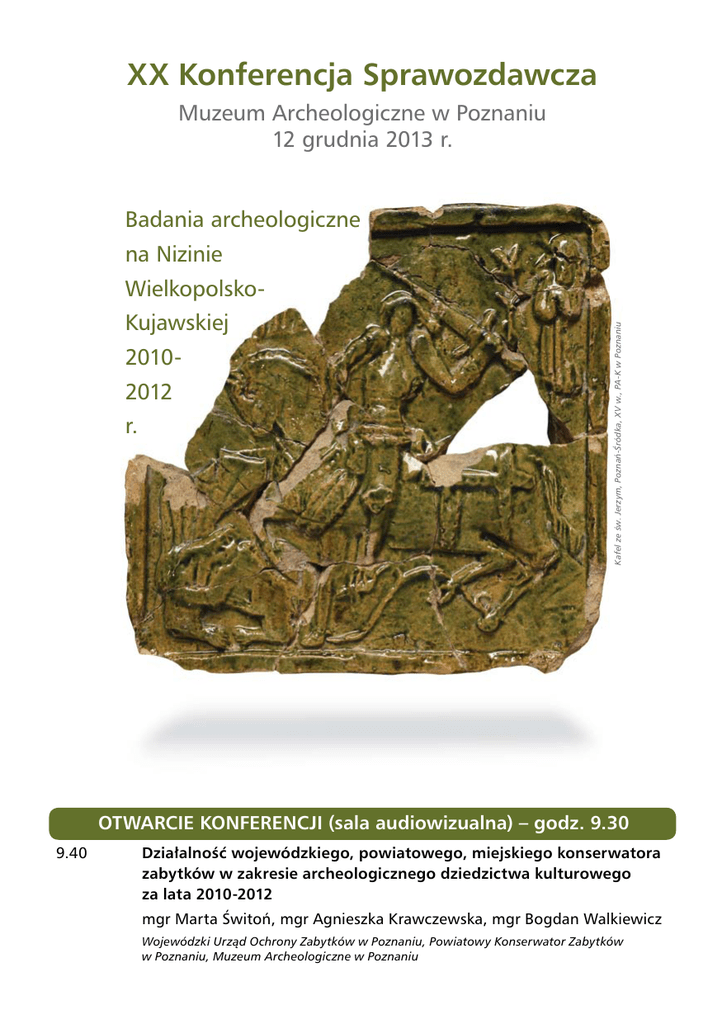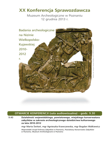 XX Konferencja Sprawozdawcza Muzeum Archeologiczne w Poznaniu 12 grudnia 2013 r. Badania archeologiczne na Nizinie Kujawskiej 20102012 r. Kafel ze św. Jerzym, Poznań-Śródka, XV w., PA-K w Poznaniu Wielkopolsko- OTWARCIE KONFERENCJI (sala audiowizualna) – godz. 9.30 9.40 Działalność wojewódzkiego, powiatowego, miejskiego konserwatora zabytków w zakresie archeologicznego dziedzictwa kulturowego za lata 2010-2012 mgr Marta Świtoń, mgr Agnieszka Krawczewska, mgr Bogdan Walkiewicz Wojewódzki Urząd Ochrony Zabytków w Poznaniu, Powiatowy Konserwator Zabytków w Poznaniu, Muzeum Archeologiczne w Poznaniu SEKCJA PRADZIEJOWA (sala audiowizualna) 10.00-10.30 Interdyscyplinarne badania schyłkowopaleolitycznego osadnictwa na stanowisku 10 w Lubrzy Instytut Archeologii i Etnologii PAN, Poznań dr Iwona Sobkowiak-Tabaka 10.30-11.00 Schyłkowopaleolityczne i wczesnomezolityczne materiały krzemienne ze stanowiska Kijewo 6, woj. wielkopolskie Pracownia Archeologiczno-Konserwatorska mgr Alina Jaszewska, Zielona Góra 11.00-11.30 Stanowisko wczesnomezolityczne w Krzyżu Wielkopolskim Instytut Archeologii i Etnologii PAN, Poznań lic. Aleksandra Rakoca, mgr Piotr Wawrzyniak dr hab. Jacek Kabaciński, prof. PAN 11.30-11.45 Dyskusja 11.45-12.15 Przerwa 12.15-12.45 Wyniki badań osady metalurgów kultury mogiłowej w Szczepidle, gm. Krzymów, woj. wielkopolskie, stan. 17 dr hab. Przemysław Makarowicz 12.45-13.15 Modelowe nieinwazyjne badania obszarów leśnych. Krajobraz kulturowy środkowej epoki brązu w Lesie Krotoszyn prof. dr hab. Janusz Czebreszuk, dr Mateusz Jaeger, dr Łukasz Pospieszny, mgr Mateusz Cwaliński, mgr Jakub Niebieszczański, mgr Mateusz Stróżyk Instytut Prahistorii UAM, Poznań 13.15-13.30 Nowoodkryta osada ludności kultury łużyckiej w Napachaniu, stan. 59 (ark. AZP 50-26, nr 201) – na trasie budowy zachodniej obwodnicy miasta Poznania Muzeum Archeologiczne w Poznaniu Instytut Prahistorii UAM, Poznań mgr Andrzej Krzyszowski 13.30-14.00 Od birytualnego cmentarzyska ludności kultury mogiłowej po osadę średniowieczną. Wyniki badań wielokulturowego stanowiska nr 20 w Górzycy, pow. słubicki, woj. lubuskie Muzeum Twierdzy Kostrzyn mgr Krzysztof Socha 14.00 Dyskusja SEKCJA OKRESU WPŁYWÓW RZYMSKICH (sala dydaktyczna) 10.00-10.30 Osada przedrzymska w Jeziorach Wielkich, gm. Zaniemyśl, stan. 30 Uniwersytet Gdański, Fundacja Patrimonium – Poznań dr Henryk Machajewski, mgr Ryszard Pietrzak 10.30-11.00 Osadnictwo kultury przeworskiej w dorzeczach górnej Baryczy i Ołoboku Ostrów Wielkopolski 11.00-11.30 Końcowe sprawozdanie z badań cmentarzyska z okresu rzymskiego w Karczynie, gm. Inowrocław Instytut Prahistorii UAM, Poznań mgr Sebastian Przybylski mgr Adriana Romańska 11.30-11.45 Dyskusja 11.45-12.15 Przerwa 12.15-12.30 Badania ratownicze na cmentarzysku z okresu wpływów rzymskich w Osieku, pow. jarociński mgr Ewa Pawlak Pracownia Archeologiczno-Konserwatorska mgr Alina Jaszewska, Zielona Góra 12.30-12.45 Wyniki badań weryfikacyjno-rozpoznawczych na cmentarzysku kurhanowym z okresu wpływów rzymskich w Grudnej, stan. 2, pow. złotowski, woj. wielkopolskie Instytut Prahistorii UAM, Poznań mgr Igor Kołoszuk 12.45-13.15 Osadnictwo kultury wielbarskiej na terenie powiatu wągrowieckiego. Badania 2011-2012 r. Pracownia Dokumentacji Archeologicznej, Dąbrowa Górnicza; Muzeum Regionalne w Wągrowcu 13.15-13.45 Badania zespołu osadniczego kultury przeworskiej w Parchankach, gm. Dąbrowa Biskupia (stanowiska 8,12,12A,13,24) Instytut Prahistorii UAM, Poznań 13.45 Dyskusja mgr Marcin Krzepkowski, mgr Tomasz Podzerek dr Józef Bednarczyk SEKCJA OKRESU ŚREDNIOWIECZA I CZASÓW NOWOŻYTNYCH (sala wystaw czasowych) 10.00-10.30 Badania archeologiczne na grodziskach wczesnośredniowiecznych w Gliniku i Santoku w latach 2010-2012 – najnowsze wyniki prac Instytut Archeologii i Etnologii PAN, Poznań dr Kinga Zamelska-Monczak 10.30-11.00 Badania archeologiczne na Śródce w Poznaniu w latach 2012-2013 Pracownia Archeologiczno Konserwatorska Henryk Klunder, Poznań 11.00-11.15 Cmentarzysko z okresu średniowiecza przy ul. 11 Listopada w Pile, stan. 118 Muzeum Okręgowe w Pile, Muzeum Ziemi Złotowskiej w Złotowie 11.15-11.30 Buk, z dziejów średniowiecznego i nowożytnego miasta (wyniki nadzoru archeologicznego przy budowie kanalizacji sanitarnej w latach 2010-2011) Muzeum Archeologiczne w Poznaniu mgr Paweł Pawlak, mgr Paulina Wesołowska dr Jarosław Rola, mgr Magdalena Stasiak mgr Andrzej Krzyszowski 11.30-11.45 Dyskusja 11.45-12.15 Przerwa 12.15-12.30 Badania ratownicze przy kanonii nr 6 położonej na Ostrowie Tumskim w Poznaniu MOS MAIORUM Pracownia Archeologiczno-Konserwatorska, Poznań mgr Artur Dębski 12.30-12.45 Wyniki ekshumacji szczątków powstańców poległych podczas bitwy pod Sokołowem w 1848 roku dr Michał Brzostowicz, mgr Sebastian Mazurkiewicz, mgr Anna Wrzesińska Muzeum Archeologiczne w Poznaniu, Muzeum Regionalne im. Dzieci Wrzesińskich we Wrześni, Muzeum Pierwszych Piastów na Lednicy 12.45-13.15 Wstępne wyniki badań XIX-wiecznego cmentarza staromarcińskiego w Poznaniu Pracownia Archeologiczno-Konserwatorska mgr Alina Jaszewska, Zielona Góra 13.15 Dyskusja mgr Paweł Banaszak, mgr Piotr Wawrzyniak