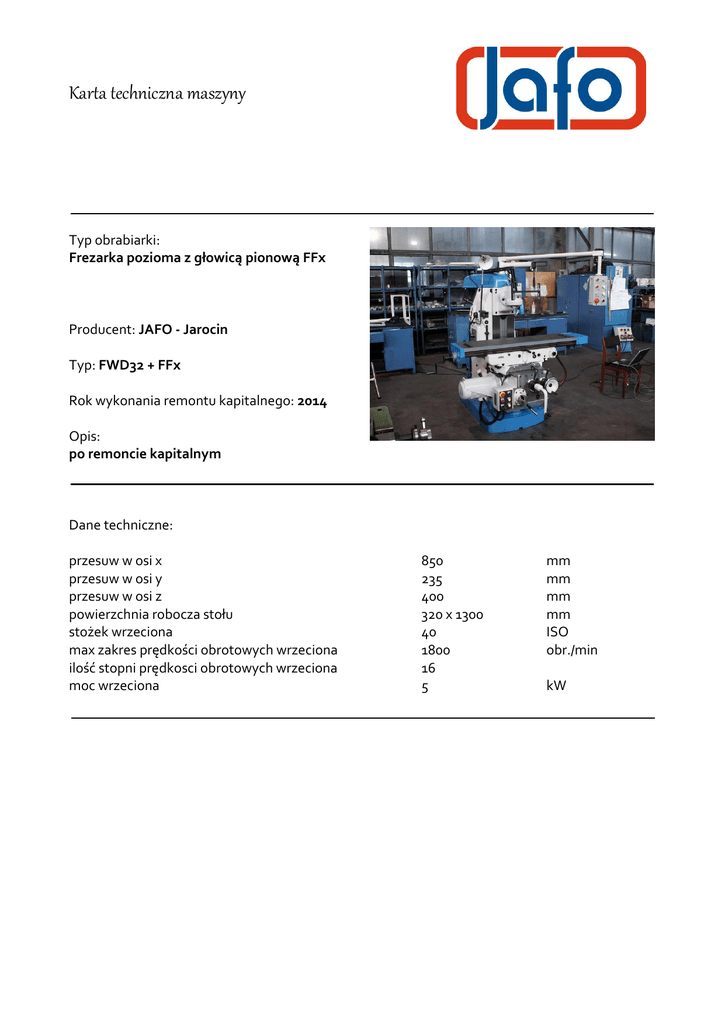 Karta techniczna maszyny Typ obrabiarki: Frezarka pozioma z głowicą pionową FFx Producent: JAFO - Jarocin Typ: FWD32 + FFx Rok wykonania remontu kapitalnego: 2014 Opis: po remoncie kapitalnym Dane techniczne: przesuw w osi x przesuw w osi y przesuw w osi z powierzchnia robocza stołu stożek wrzeciona max zakres prędkości obrotowych wrzeciona ilość stopni prędkosci obrotowych wrzeciona moc wrzeciona 850 235 400 320 x 1300 40 1800 16 5 mm mm mm mm ISO obr./min kW
