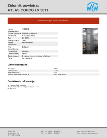 Zbiornik powietrza ATLAS COPCO LV 3011 Niestety maszyna została sprzedana! Numer magazynowy: Rodzaj maszyny: Producent: Typ: Rok produkcji: Rodzaj sterowania: Kraj pochodzenia: Lokalizacja: Czas dostawy: Opcja dostawy: Cena: 1400312 Zbiornik powietrza ATLAS COPCO LV 3011 1997 konventionell Belgium Leipzig 3 zaraz Z załadunkiem w miejscu lokalizacji na zapytanie Dane techniczne Zawartość: capacity in bar: Waga maszyny ok.: Wymiary gabarytowe maszyny ok.: 3000 l 11 bar k.A. t Dm=1,2 x H: 3,2 m Dodatkowe informację Air Pressure Tank (standing) maximum allowable working overpressure 11 bar on sale as is! WMW AG Messeallee 10a D-04158 Leipzig Powered by TCPDF (www.tcpdf.org) Tel: +49 (0341) - 52 04 60 Fax: +49 (0341) - 52 04 61 7 Mail: [email protected] Web: http://www.wmwag.com