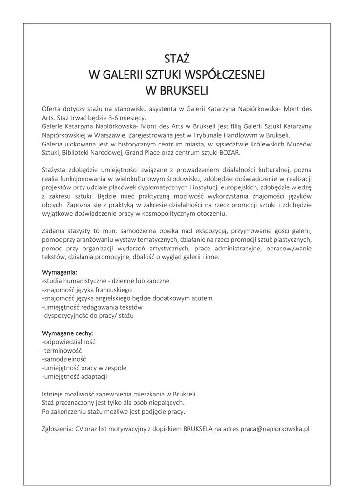 STAŻ W GALERII SZTUKI WSPÓŁCZESNEJ W BRUKSELI Oferta dotyczy stażu na stanowisku asystenta w Galerii Katarzyna Napiórkowska- Mont des Arts. Staż trwać będzie 3-6 miesięcy. Galerie Katarzyna Napiórkowska- Mont des Arts w Brukseli jest filią Galerii Sztuki Katarzyny Napiórkowskiej w Warszawie. Zarejestrowana jest w Trybunale Handlowym w Brukseli. Galeria ulokowana jest w historycznym centrum miasta, w sąsiedztwie Królewskich Muzeów Sztuki, Biblioteki Narodowej, Grand Place oraz centrum sztuki BOZAR. Stażysta zdobędzie umiejętności związane z prowadzeniem działalności kulturalnej, pozna realia funkcjonowania w wielokulturowym środowisku, zdobędzie doświadczenie w realizacji projektów przy udziale placówek dyplomatycznych i instytucji europejskich, zdobędzie wiedzę z zakresu sztuki. Będzie mieć praktyczną możliwość wykorzystania znajomości języków obcych. Zapozna się z praktyką w zakresie działalności na rzecz promocji sztuki i zdobędzie wyjątkowe doświadczenie pracy w kosmopolitycznym otoczeniu. Zadania stażysty to m.in. samodzielna opieka nad ekspozycją, przyjmowanie gości galerii, pomoc przy aranżowaniu wystaw tematycznych, działanie na rzecz promocji sztuk plastycznych, pomoc przy organizacji wydarzeń artystycznych, prace administracyjne, opracowywanie tekstów, działania promocyjne, dbałość o wygląd galerii i inne. Wymagania: -studia humanistyczne - dzienne lub zaoczne -znajomość języka francuskiego -znajomość języka angielskiego będzie dodatkowym atutem -umiejętność redagowania tekstów -dyspozycyjność do pracy/ stażu Wymagane cechy: -odpowiedzialność -terminowość -samodzielność -umiejętność pracy w zespole -umiejętność adaptacji Istnieje możliwość zapewnienia mieszkania w Brukseli. Staż przeznaczony jest tylko dla osób niepalących. Po zakończeniu stażu możliwe jest podjęcie pracy. Zgłoszenia: CV oraz list motywacyjny z dopiskiem BRUKSELA na adres [email protected]