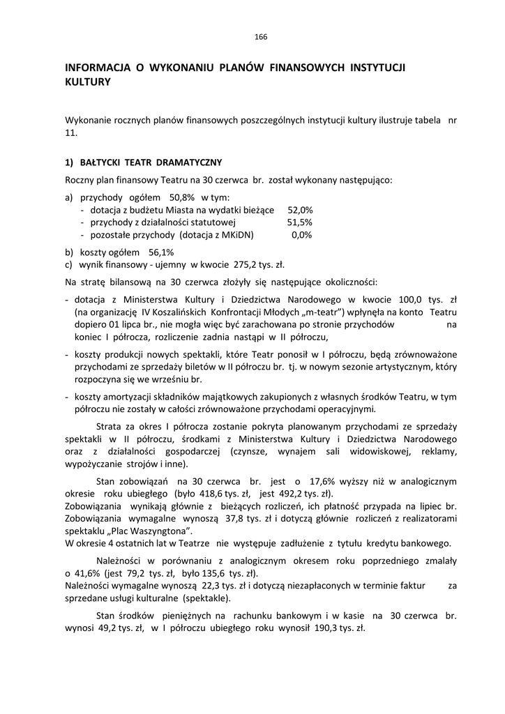 166 INFORMACJA O WYKONANIU PLANÓW FINANSOWYCH INSTYTUCJI KULTURY Wykonanie rocznych planów finansowych poszczególnych instytucji kultury ilustruje tabela nr 11. 1) BAŁTYCKI TEATR DRAMATYCZNY Roczny plan finansowy Teatru na 30 czerwca br. został wykonany następująco: a) przychody ogółem 50,8% w tym: - dotacja z budżetu Miasta na wydatki bieżące - przychody z działalności statutowej - pozostałe przychody (dotacja z MKiDN) 52,0% 51,5% 0,0% b) koszty ogółem 56,1% c) wynik finansowy - ujemny w kwocie 275,2 tys. zł. Na stratę bilansową na 30 czerwca złożyły się następujące okoliczności: - dotacja z Ministerstwa Kultury i Dziedzictwa Narodowego w kwocie 100,0 tys. zł (na organizację IV Koszalińskich Konfrontacji Młodych „m-teatr”) wpłynęła na konto Teatru dopiero 01 lipca br., nie mogła więc być zarachowana po stronie przychodów na koniec I półrocza, rozliczenie zadnia nastąpi w II półroczu, - koszty produkcji nowych spektakli, które Teatr ponosił w I półroczu, będą zrównoważone przychodami ze sprzedaży biletów w II półroczu br. tj. w nowym sezonie artystycznym, który rozpoczyna się we wrześniu br. - koszty amortyzacji składników majątkowych zakupionych z własnych środków Teatru, w tym półroczu nie zostały w całości zrównoważone przychodami operacyjnymi. Strata za okres I półrocza zostanie pokryta planowanym przychodami ze sprzedaży spektakli w II półroczu, środkami z Ministerstwa Kultury i Dziedzictwa Narodowego oraz z działalności gospodarczej (czynsze, wynajem sali widowiskowej, reklamy, wypożyczanie strojów i inne). Stan zobowiązań na 30 czerwca br. jest o 17,6% wyższy niż w analogicznym okresie roku ubiegłego (było 418,6 tys. zł, jest 492,2 tys. zł). Zobowiązania wynikają głównie z bieżących rozliczeń, ich płatność przypada na lipiec br. Zobowiązania wymagalne wynoszą 37,8 tys. zł i dotyczą głównie rozliczeń z realizatorami spektaklu „Plac Waszyngtona”. W okresie 4 ostatnich lat w Teatrze nie występuje zadłużenie z tytułu kredytu bankowego. Należności w porównaniu z analogicznym okresem roku poprzedniego zmalały o 41,6% (jest 79,2 tys. zł, było 135,6 tys. zł). Należności wymagalne wynoszą 22,3 tys. zł i dotyczą niezapłaconych w terminie faktur za sprzedane usługi kulturalne (spektakle). Stan środków pieniężnych na rachunku bankowym i w kasie na 30 czerwca br. wynosi 49,2 tys. zł, w I półroczu ubiegłego roku wynosił 190,3 tys. zł. 167 2) FILHARMONIA KOSZALIŃSKA Roczny plan finansowy Filharmonii na 30 czerwca br. został wykonany następująco: a) przychody ogółem 52,8% w tym: - dotacja z budżetu Miasta na wydatki bieżące 49,1% - przychody z działalności statutowej 71,5% b) koszty ogółem 50,7% c) wynik finansowy - dodatni w kwocie 104,7 tys. zł. Dodatni wynik finansowy na 30 czerwca br. powstał w związku: - z niewykorzystaniem zaliczki na koncerty finansowane przez Urząd Marszałkowski, których realizacja przypada na II kwartał br. - korzystnym zaawansowaniem planu przychodów z działalności statutowej (głównie ze sprzedaży biletów) – 71,%. Zobowiązania ogółem wynoszą 191,6 tys. zł i są o 24,1% wyższe niż w analogicznym okresie roku poprzedniego (wynosiły 154,4 tys. zł). Zobowiązania wynikają z bieżących rozliczeń, wymagalne nie występują. Należności w porównaniu z analogicznym okresem roku ubiegłego wzrosły o 50,1% (jest 28,2 tys. zł, było 18,8 tys. zł), głównie z tytułu rozliczeń z Urzędem Skarbowym, dotyczy podatku VAT. Należności wymagalne nie występują. Stan środków na rachunku bankowym i w kasie na 30 czerwca br. wynosi 390,8 tys. zł. 3) CENTRUM KULTURY 105 W KOSZALINIE Roczny plan finansowy tej instytucji na 30 czerwca 2014 roku został wykonany następująco: a) przychody ogółem 54,3% w tym: - dotacja z budżetu Miasta na wydatki bieżące - dotacja z budżetu Miasta na wydatki inwestycyjne - przychody z działalności statutowej - pozostałe przychody 49,0% 100,0% 57,1% 69,0% b) koszty ogółem 52,0% c) wynik finansowy dodatni w wysokości 172,1 tys. zł. Na ten wynik wpłynęły pozostałe przychody, na które składają się środki z Państwowego Instytutu Sztuki Filmowej i Ministerstwa Kultury i Dziedzictwa Narodowego (wpłynęło 300,0 tys. zł). Również wpływy z biletów i reklam są wyższe niż planowano. Plan imprez na I półrocze br. został zrealizowany w całości. Zobowiązania ogółem utrzymują się na poziomie zbliżonym do roku poprzedniego, wynoszą 813,2 tys. zł (było 815,2 tys. zł). W łącznej kwocie zobowiązań występuje kredyt w rachunku bieżącym, w wysokości 53,1 tys. zł. Zadłużenie z tego tytułu zmalało w porównaniu z analogicznym okresem roku poprzedniego, wówczas wynosiło 170,8 tys. zł. Zobowiązania dotyczą rozliczeń bieżących, głównie zrealizowanego w czerwcu Festiwalu „Młodzi i Film”. Zobowiązania wymagalne nie występują. 168 Zobowiązania na 30 czerwca br. znajdują zabezpieczenie w środkach na rachunku bankowym i w kasie. Stan tych środków na 30 czerwca br. wynosi 501,8 tys. zł. pieniężnych Należności ogółem utrzymują się na poziomie zbliżonym do analogicznego okresu roku poprzedniego (jest 204,8tys. zł, było 193,0 tys. zł). Należności wymagalne wynoszą 35,0 tys. zł i dotyczą rozliczeń z tytułu sprzedaży usług kulturalnych i wynajmu pomieszczeń. Poza dotacją na wydatki bieżące CK 105 przyznano dotację na wydatki inwestycyjne (plan i wykonanie 150,0 tys. zł). Dotacja w tej wysokości została przeznaczona na: - zakup sprzętu do studia filmowego w CK 105 „Młodzi Film” -50,0 tys. zł, - remont pomieszczeń po Filharmonii oraz ich wyposażenie - 100,0 tys. zł (rozliczenie remontu i zakupu wyposażenia nastąpi w II półroczu). 4) KOSZALIŃSKA BIBLIOTEKA PUBLICZNA Roczny plan finansowy na 30 czerwca 2014 roku Biblioteka wykonała następująco: a) przychody ogółem 55,1% w tym: - 