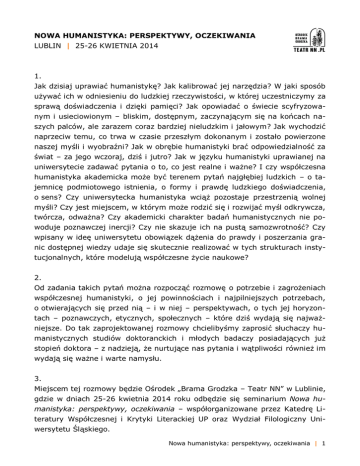 NOWA HUMANISTYKA: PERSPEKTYWY, OCZEKIWANIA LUBLIN | 25-26 KWIETNIA 2014 1. Jak dzisiaj uprawiać humanistykę? Jak kalibrować jej narzędzia? W jaki sposób używać ich w odniesieniu do ludzkiej rzeczywistości, w której uczestniczymy za sprawą doświadczenia i dzięki pamięci? Jak opowiadać o świecie scyfryzowanym i usieciowionym – bliskim, dostępnym, zaczynającym się na końcach naszych palców, ale zarazem coraz bardziej nieludzkim i jałowym? Jak wychodzić naprzeciw temu, co trwa w czasie przeszłym dokonanym i zostało powierzone naszej myśli i wyobraźni? Jak w obrębie humanistyki brać odpowiedzialność za świat – za jego wczoraj, dziś i jutro? Jak w języku humanistyki uprawianej na uniwersytecie zadawać pytania o to, co jest realne i ważne? I czy współczesna humanistyka akademicka może być terenem pytań najgłębiej ludzkich – o tajemnicę podmiotowego istnienia, o formy i prawdę ludzkiego doświadczenia, o sens? Czy uniwersytecka humanistyka wciąż pozostaje przestrzenią wolnej myśli? Czy jest miejscem, w którym może rodzić się i rozwijać myśl odkrywcza, twórcza, odważna? Czy akademicki charakter badań humanistycznych nie powoduje poznawczej inercji? Czy nie skazuje ich na pustą samozwrotność? Czy wpisany w ideę uniwersytetu obowiązek dążenia do prawdy i poszerzania granic dostępnej wiedzy udaje się skutecznie realizować w tych strukturach instytucjonalnych, które modelują współczesne życie naukowe? 2. Od zadania takich pytań można rozpocząć rozmowę o potrzebie i zagrożeniach współczesnej humanistyki, o jej powinnościach i najpilniejszych potrzebach, o otwierających się przed nią – i w niej – perspektywach, o tych jej horyzontach – poznawczych, etycznych, społecznych – które dziś wydają się najważniejsze. Do tak zaprojektowanej rozmowy chcielibyśmy zaprosić słuchaczy humanistycznych studiów doktoranckich i młodych badaczy posiadających już stopień doktora – z nadzieją, że nurtujące nas pytania i wątpliwości również im wydają się ważne i warte namysłu. 3. Miejscem tej rozmowy będzie Ośrodek „Brama Grodzka – Teatr NN” w Lublinie, gdzie w dniach 25-26 kwietnia 2014 roku odbędzie się seminarium Nowa humanistyka: perspektywy, oczekiwania – współorganizowane przez Katedrę Literatury Współczesnej i Krytyki Literackiej UP oraz Wydział Filologiczny Uniwersytetu Śląskiego. Nowa humanistyka: perspektywy, oczekiwania | 1 4. Na seminarium złożą się dwie dyskusje panelowe, wykład mistrzowski, prowadzone w grupach konwersatoria mistrzowskie oraz warsztaty – ramowy program w załączeniu. Uczestnicy wszystkich zajęć przewidzianych w programie otrzymają certyfikat odbycia seminarium i uzyskania 2 punktów ECTS. 5. W ramach opłaty – wynoszącej 350,- złotych – zapewnimy uczestnikom dwa noclegi i wyżywienie. O przyjęciu na seminarium decydować będzie kolejność zgłoszeń, na które czekamy pod adresem: [email protected]. Warunkiem przyjęcia zgłoszenia jest przesłanie krótkiego szkicu (do 9.000 znaków) dotyczącego perspektyw i możliwych kierunków rozwoju współczesnej humanistyki lub / oraz oczekiwań wobec niej. Szkice te zamierzamy następnie zebrać w recenzowanej publikacji Nowa humanistyka: manifesty, dezyderaty, a pięć z nich zostanie zaprezentowanych przez autorów w ramach panelu doktorantów zatytułowanego manifesty, dezyderaty i stanowić będzie punkt wyjścia do dyskusji. 6. Osoby, które dysponują odpowiednim doświadczeniem i chciałyby współprowadzić warsztaty ścieżki finansowania nauki oraz poetyka wniosku grantowego, prosimy o zaznaczenie tego faktu w zgłoszeniu. Współprowadzenie warsztatów odnotujemy w certyfikacie potwierdzającym udział w seminarium. 7. Wybrane materiały seminarium (wystąpienia, prezentacje, zapis video dyskusji etc.) zamierzamy opublikować w postaci witryny internetowej. prof. UŚ dr hab. Danuta Opacka-Walasek prof. dr hab. Paweł Próchniak Nowa humanistyka: perspektywy, oczekiwania | 2 NOWA HUMANISTYKA: PERSPEKTYWY, OCZEKIWANIA LUBLIN | 25-26 KWIETNIA 2014 PERSPEKTYWY | PIĄTEK 11.30-13.30 | Brama na dłoni: prezentacja zasobów i działań Ośrodka „Brama Grodzka – Teatr NN” oraz warsztaty: zasoby pamięci | zajęcia otwarte (grupa pierwsza) 15.00-16.30 | panel: nowa humanistyka? prof. Dariusz Czaja, prof. Ryszard Koziołek, prof. Ryszard Nycz, prof. Piotr Śliwiński | zajęcia dla wszystkich 17.00-18.00 | wykład mistrzowski: prof. Ryszard Nycz | zajęcia dla wszystkich 18.30-20.00 | konwersatoria mistrzowskie: prof. Dariusz Czaja, prof. Ryszard Koziołek, prof. Piotr Śliwiński | zajęcia prowadzone równolegle w trzech grupach OCZEKIWANIA | SOBOTA | zajęcia dla wszystkich 10.00-12.00 | panel doktorantów: manifesty, dezyderaty | 5 wystąpień x 15 min. / dyskusja: 45 min. 12.30-13.30 | warsztaty: ścieżki finansowania nauki | prowadzenie: 2 doktorantów 14.00-15.00 | warsztaty: poetyka wniosku grantowego | prowadzenie: 2 doktorantów 16.30-18.30 | Brama na dłoni: prezentacja zasobów i działań Ośrodka „Brama Grodzka – Teatr NN” oraz warsztaty: zasoby pamięci | zajęcia otwarte (grupa druga) Nowa humanistyka: perspektywy, oczekiwania | 3