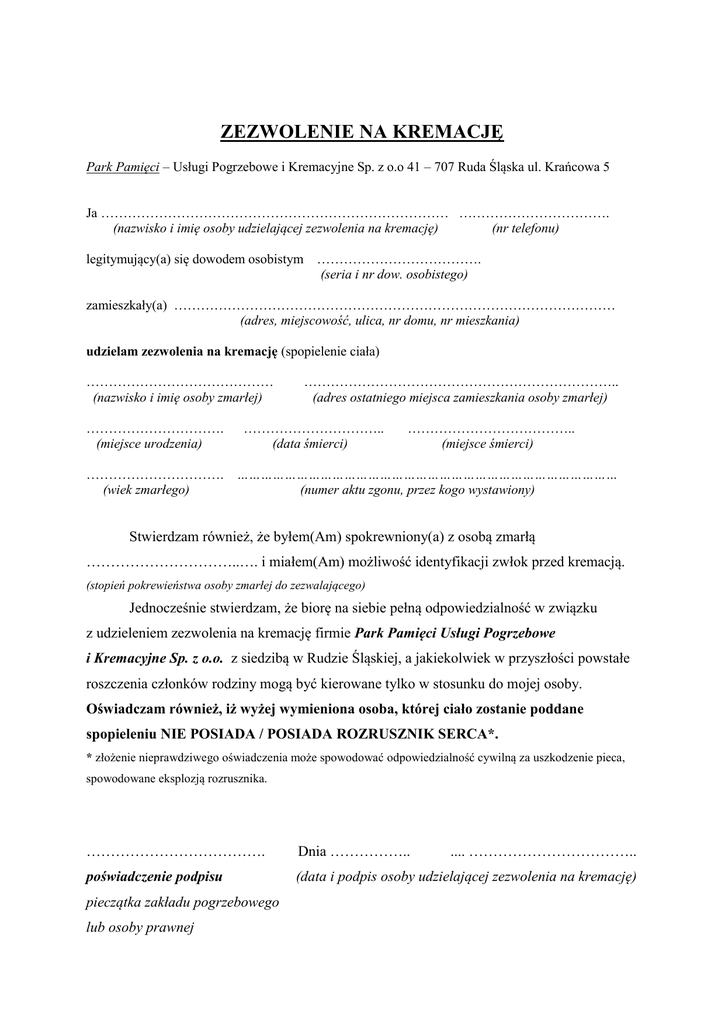 ZEZWOLENIE NA KREMACJĘ Park Pamięci – Usługi Pogrzebowe i Kremacyjne Sp. z o.o 41 – 707 Ruda Śląska ul. Krańcowa 5 Ja …………………………………………………………………… ……………………………. (nazwisko i imię osoby udzielającej zezwolenia na kremację) (nr telefonu) legitymujący(a) się dowodem osobistym ………………………………. (seria i nr dow. osobistego) zamieszkały(a) ……………………………………………………………………………………… (adres, miejscowość, ulica, nr domu, nr mieszkania) udzielam zezwolenia na kremację (spopielenie ciała) …………………………………… (nazwisko i imię osoby zmarłej) …………………………. (miejsce urodzenia) …………………………………………………………….. (adres ostatniego miejsca zamieszkania osoby zmarłej) ………………………….. (data śmierci) ……………………………….. (miejsce śmierci) …………………………. …………………………………………………………………………………… (wiek zmarłego) (numer aktu zgonu, przez kogo wystawiony) Stwierdzam również, że byłem(Am) spokrewniony(a) z osobą zmarłą …………………………..…. i miałem(Am) możliwość identyfikacji zwłok przed kremacją. (stopień pokrewieństwa osoby zmarłej do zezwalającego) Jednocześnie stwierdzam, że biorę na siebie pełną odpowiedzialność w związku z udzieleniem zezwolenia na kremację firmie Park Pamięci Usługi Pogrzebowe i Kremacyjne Sp. z o.o. z siedzibą w Rudzie Śląskiej, a jakiekolwiek w przyszłości powstałe roszczenia członków rodziny mogą być kierowane tylko w stosunku do mojej osoby. Oświadczam również, iż wyżej wymieniona osoba, której ciało zostanie poddane spopieleniu NIE POSIADA / POSIADA ROZRUSZNIK SERCA*. * złożenie nieprawdziwego oświadczenia może spowodować odpowiedzialność cywilną za uszkodzenie pieca, spowodowane eksplozją rozrusznika. ………………………………. Dnia …………….. poświadczenie podpisu (data i podpis osoby udzielającej zezwolenia na kremację) pieczątka zakładu pogrzebowego lub osoby prawnej .... ……………………………..