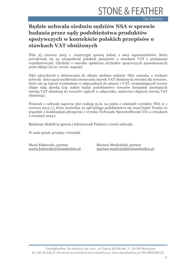 Będzie uchwała siedmiu sędziów NSA w sprawie badania przez sądy podobieństwa produktów spożywczych w kontekście polskich przepisów o stawkach VAT obniżonych NSA 23 czerwca 2015 r. rozstrzygał sprawę jednej z sieci supermarketów, która powoływała się na niezgodność polskich przepisów o stawkach VAT z przepisami wspólnotowymi. Chodziło o szerokie spektrum artykułów spożywczych sprzedawanych przez sklepy (m.in. owoce, napoje). NSA zdecydował o skierowaniu do składu siedmiu sędziów NSA wniosku o wydanie uchwały dotyczącej możliwości stosowania stawek VAT obniżonych również dla towarów, które nie są wprost wymienione w załącznikach do ustawy o VAT, wymieniających towary objęte taką stawką (czy należy badać podobieństwo towarów formalnie nieobjętych stawką VAT obniżoną do towarów ujętych w załączniku, ustawowo objętych stawką VAT obniżoną). Wniosek o uchwałę zapewne jest reakcją m.in. na jeden z ostatnich wyroków NSA (z 1 czerwca 2015 r.), który stwierdza, że sąd takiego podobieństwa nie musi badać Trudno to pogodzić z konkluzjami płynącymi z wyroku Trybunału Sprawiedliwości UE o e-bookach z września 2014 r. Będziemy śledzili tę sprawę i informowali Państwa o treści uchwały. W razie pytań, prosimy o kontakt. Maria Kukawska, partner [email protected] Mariusz Machciński, partner [email protected] 1