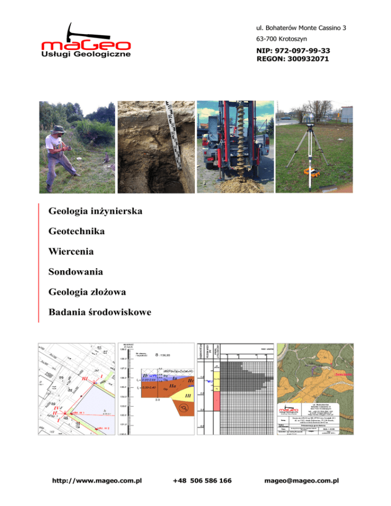 i maGeo - Usługi Geologiczne Andrzej Keczmerski ul. Bohaterów Monte Cassino 3 63-700 Krotoszyn Firma „maGeo - Usługi Geologiczne” wykonuje badania podłoża dla różnego rodzaju obiektów inżynierskich. Oferujemy pełny zakres prac geologicznych, począwszy od projektu, poprzez prace wiertnicze, sondowania i badania laboratoryjne aż do opracowania wynikowych dokumentacji geologicznych, geotechnicznych, złożowych i hydrogeologicznych. Posiadamy wykwalifikowanych fachowców, odpowiednie zaplecze sprzętowe (wiertnicę mechaniczną, sondy dynamiczne i SLVT). Współpracujemy z wiodącymi laboratoriami badawczymi (Instytut Geologi UAM, Zakład Analizy Gruntów i Wody - Wydział Chemii UAM). Gwarantem jakości usług firmy „maGeo - Usługi Geologiczne" jest wieloletnie doświadczenie, posiadane uprawnienia i ubezpieczenie odpowiedzialności cywilnej prowadzonej działalności do wysokości 100 000 zł. Proponowane usługi mogą być pomocne w realizacji Państwa kontraktów. Możemy zaoferować Państwu fachowość, indywidualne podejście i bardzo konkurencyjne ceny oraz krótkie terminy realizacji zleconych prac. Zapraszamy do zapoznania się z ofertą naszej firmy, zachęcamy do współpracy i korzystania z naszych usług. http://www.mageo.com.pl +48 506 586 166 [email protected] i maGeo - Usługi Geologiczne Andrzej Keczmerski ul. Bohaterów Monte Cassino 3 63-700 Krotoszyn Zakres usług Proponujemy Państwu następujący zakres usług: • Projekty i dokumentacje geologiczno - inżynierskie • Opinie i dokumentacje geotechniczne • Wiercenia badawcze, sondowania dynamiczne, sondowania SLVT • Badania zagęszczenia zasypek na budowach • Odbiory geotechniczne wykopów fundamentowych • Poszukiwanie złóż kruszyw naturalnych metodami wiertniczymi • Projekty i dokumentacje geologiczno - złożowe (projekty, dokumentowanie złóż, badania dla rozpoznania złóż kruszyw naturalnych, uzyskanie koncesji na wydobycie) • Projekty i dokumentacje hydrogeologiczne oraz operaty wodno - prawne • Monitoring wód podziemnych, instalacja piezometrów, pobór próbek gruntu i wód podziemnych do badań laboratoryjnych • Badania laboratoryjne gruntów • Oceny stanu czystości środowiska gruntowo – wodnego Przykładowo w ramach opinii bądź dokumentacji geotechnicznej wykonujemy: • wiercenia badawcze - ilość metrów zależna od wymagań projektanta i charakteru obiektu • sondowania sondą DPL, SLVT - przy ok. 40% otworów (w cenie wierceń) • badania laboratoryjne gruntów - zakres dobrany do zalegających w podłożu gruntów (w cenie wierceń) • dokumentację geotechniczną opracowaną i podpisaną przez osobę posiadającą uprawnienia (w cenie wierceń) W ramach dokumentacji geologiczno - inżynierskiej wykonujemy dodatkowo "projekt robót geologicznych" poprzedzający badania. Nasze prace wykonujemy na terenie całego kraju. Usługi te, mogą być pomocne w realizacji Państwa kontraktów. Oferujemy fachowość i konkurencyjne ceny. dojazd gratis niezależnie od regionu http://www.mageo.com.pl +48 506 586 166 [email protected] i maGeo - Usługi Geologiczne Andrzej Keczmerski ul. Bohaterów Monte Cassino 3 63-700 Krotoszyn Kwalifikacje i doświadczenie Potwierdzeniem uzyskanych kwalifikacji oraz wiedzy jest wydane przez Ministra Środowiska świadectwo. Rozmieszczenie badań i opracowań mgra Andrzej Keczmerskiego (stan na styczeń 2016) http://www.mageo.com.pl +48 506 586 166 [email protected] i maGeo - Usługi Geologiczne Andrzej Keczmerski ul. Bohaterów Monte Cassino 3 63-700 Krotoszyn Historia firmy Powstanie firmy maGeo – Usługi Geologiczne poprzedza wieloletnia praca (2003-2008) właściciela mgra Andrzeja Keczmerskiego w firmach Geoprojekt Sp. z o.o. oraz ARCADIS. Gwarancją wysokiego profesjonalizmu naszych opracowań są uzyskane uprawnienia kategorii VII oraz zdobyte doświadczenie w następujących projektach: • prace badawcze związane z rozpoznaniem warunków geologicznych dla projektowanej II i III linii metra warszawskiego, • badania geologiczne związane z rozbudową Lotniska Warszawa - Okęcie, • opracowanie "Bazy danych Geolgiczno-Inżynierskich wraz z opracowaniem Atlasu GeologicznoInżynierskiego Poznania", • opracowanie „Dokumentacji geologiczno – inżynierskiej do projektu architektoniczno- budowlanego osiedla mieszkaniowego „Zielone Zacisze” - etap D w Warszawie”, • opracowanie „Dokumentacji geologiczno – inżynierskiej z oceną stateczności zbocza „Skarpy Warszawskiej” do projektu architektoniczno - budowlanego obiektu administracyjno – magazynowego przy Al. Na Skarpie w Warszawie, • opracowanie „Dokumentacji geotechnicznej do projektu budowlanego KANAŁ SPALIN I WENTYLATOR na terenie elektrowni KOZIENICE S.A. w Świerżach Górnych”, • opracowanie „Projektu prac geologicznych dla projektu budowlanego i wykonawczego autostrady płatnej A1 Toruń - Stryków, zadanie I odcinek I Czerniewice - Odolion km 151+900 – 163+300”, • badania geologiczne dla "projektowanego tunelu drogowego Południowej Obwodnicy Warszawy", • oraz wielu innych projektów, dokumentacji geologiczno – inżynierskich, geotechnicznych i opinii geologicznych. oraz w ramach działalności firmy „maGeo - Usługi Geologiczne” - od 2008 r. ponad 400 opracowań: • badania dla rozpoznania warunków geologicznych pod projektowane stacje bazowe telefonii komórkowej dla Atem-Polska Sp. z o.o. (ponad 40 nadajników, wrzesień 2008 - styczeń 2016), • badania geologiczne dla zabezpiecznia reliktów ruin pałacu na terenie byłego Niemieckiego Obozu Zagłady Kulmhof w Chełmnie nad Nerem (wrzesień - październik 2015) • badania geotechniczne dla projektowanej rozbudowy hali magazynowo - produkcyjnej z zapleczem socjalno - biurowym i infrastrukturą w Czachorowie, gm. Gostyń dla Pracowni Projektowej Paweł Praczyk Sp. z o.o. (lipiec 2014) http://www.mageo.com.pl +48 506 586 166 [email protected] i maGeo - Usługi 