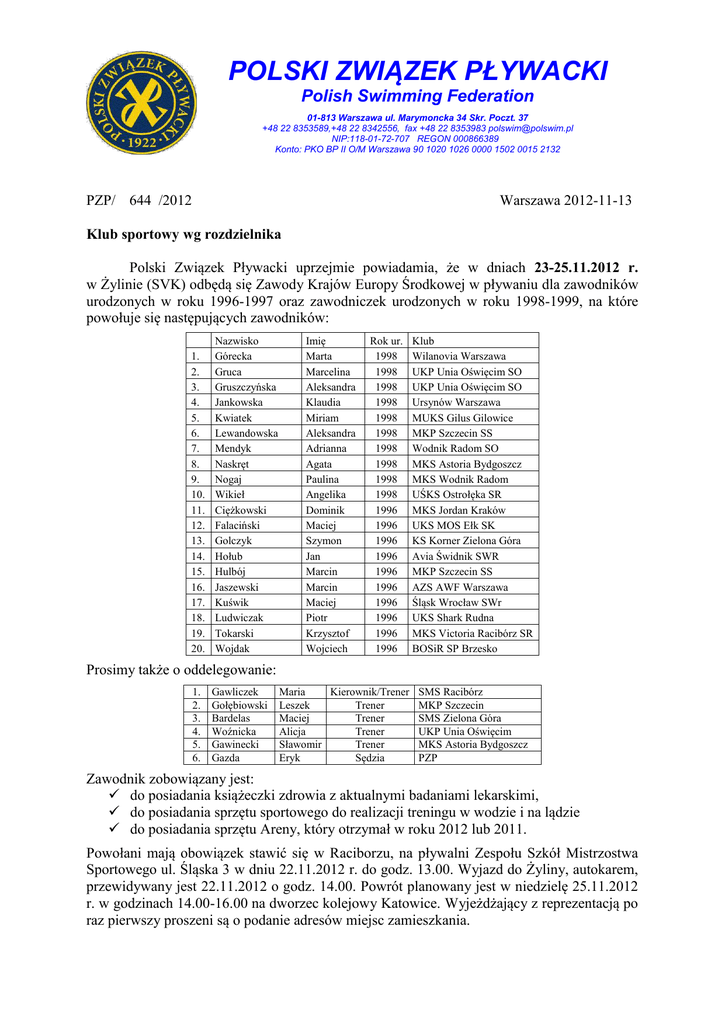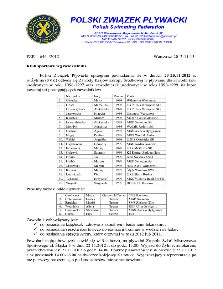 POLSKI ZWIĄZEK PŁYWACKI Polish Swimming Federation 01-813 Warszawa ul. Marymoncka 34 Skr. Poczt. 37 +48 22 8353589,+48 22 8342556, fax +48 22 8353983 [email protected] NIP:118-01-72-707 REGON 000866389 Konto: PKO BP II O/M Warszawa 90 1020 1026 0000 1502 0015 2132 PZP/ 644 /2012 Warszawa 2012-11-13 Klub sportowy wg rozdzielnika Polski Związek Pływacki uprzejmie powiadamia, że w dniach 23-25.11.2012 r. w Żylinie (SVK) odbędą się Zawody Krajów Europy Środkowej w pływaniu dla zawodników urodzonych w roku 1996-1997 oraz zawodniczek urodzonych w roku 1998-1999, na które powołuje się następujących zawodników: 1. 2. 3. 4. 5. 6. 7. 8. 9. 10. 11. 12. 13. 14. 15. 16. 17. 18. 19. 20. Nazwisko Górecka Gruca Gruszczyńska Jankowska Kwiatek Lewandowska Mendyk Naskręt Nogaj Wikieł Ciężkowski Falaciński Golczyk Hołub Hulbój Jaszewski Kuświk Ludwiczak Tokarski Wojdak Imię Marta Marcelina Aleksandra Klaudia Miriam Aleksandra Adrianna Agata Paulina Angelika Dominik Maciej Szymon Jan Marcin Marcin Maciej Piotr Krzysztof Wojciech Rok ur. 1998 1998 1998 1998 1998 1998 1998 1998 1998 1998 1996 1996 1996 1996 1996 1996 1996 1996 1996 1996 Klub Wilanovia Warszawa UKP Unia Oświęcim SO UKP Unia Oświęcim SO Ursynów Warszawa MUKS Gilus Gilowice MKP Szczecin SS Wodnik Radom SO MKS Astoria Bydgoszcz MKS Wodnik Radom UŚKS Ostrołęka SR MKS Jordan Kraków UKS MOS Ełk SK KS Korner Zielona Góra Avia Świdnik SWR MKP Szczecin SS AZS AWF Warszawa Śląsk Wrocław SWr UKS Shark Rudna MKS Victoria Racibórz SR BOSiR SP Brzesko Prosimy także o oddelegowanie: 1. 2. 3. 4. 5. 6. Gawliczek Gołębiowski Bardelas Woźnicka Gawinecki Gazda Maria Kierownik/Trener SMS Racibórz Leszek Trener MKP Szczecin Maciej Trener SMS Zielona Góra Alicja Trener UKP Unia Oświęcim Sławomir Trener MKS Astoria Bydgoszcz Eryk Sędzia PZP Zawodnik zobowiązany jest: do posiadania książeczki zdrowia z aktualnymi badaniami lekarskimi, do posiadania sprzętu sportowego do realizacji treningu w wodzie i na lądzie do posiadania sprzętu Areny, który otrzymał w roku 2012 lub 2011. Powołani mają obowiązek stawić się w Raciborzu, na pływalni Zespołu Szkół Mistrzostwa Sportowego ul. Śląska 3 w dniu 22.11.2012 r. do godz. 13.00. Wyjazd do Żyliny, autokarem, przewidywany jest 22.11.2012 o godz. 14.00. Powrót planowany jest w niedzielę 25.11.2012 r. w godzinach 14.00-16.00 na dworzec kolejowy Katowice. Wyjeżdżający z reprezentacją po raz pierwszy proszeni są o podanie adresów miejsc zamieszkania. Powołanym Polski Związek Pływacki, zapewni obiad w dniu 22.11.2012. W przypadku konieczności skorzystania z zakwaterowania w Raciborzu 21/22.11.2012 r. prosimy bezzwłocznie powiadomić PZP pocztą e-mail [email protected] lub telefonicznie 22 8353589 lub faksem 22 8353983. Osobą odpowiedzialną za organizację wyjazdu jest Pan Sławomir Szwed tel. 602485924. Również w przypadku braku możliwości wzięcia udziału w zawodach prosimy o bezzwłoczne powiadomienie PZP. Chęć wystartowania w wyścigach poza konkursowych należy zgłosić do PZP do środy 14.11.2012 lub w dniu wyjazdu kierowniczce reprezentacji Pani Marii Gawliczek. Zawodnicy muszą posiadać pisemne zgody rodziców na udział w zawodach, a ci którzy po zawodach nie będą odbierani przez swoich rodziców ponadto muszą posiadać pisemne upoważnienia opiekunów prawnych do odbioru przez wskazane osoby trzecie. Koszty przyjazdu do Raciborza i powrót do miejsc zamieszkania pokrywają jednostki delegujące. Pozostałe koszty pokrywa PZP. Kierownik OrganizacyjnoSzkoleniowy mgr Jerzy Kowalski Otrzymują: Zainteresowane Kluby i SMS PREZES Andrzej Kowalski Proponowana obsada konkurencji l.p. Nazwisko Imię r.ur. konkurencja 1. Lewandowska Aleksandra 1998 100 dow. 2. Wikieł Angelika 1998 3. Naskręt Agata 1998 4. Jankowska Klaudia 1998 200 dow. 5. Nogaj Paulina 1998 4x100 dow. 100mot. 6. Górecka Marta 1998 50 dow. 4x100 dow. 7. Gruszczyńska Aleksandra 1998 800 dow. 400 dow. 8. Gruca Marcelina 1998 200 mot. 100 mot. 4x100zm. 4x200 dow. 100 klas. 200 klas. 4x100 zm. 100 grzb. 200 grzb. 4x100 zm. 4x200 dow. 400 dow. 4x100 dow. 4x200 dow. 9. Kwiatek Miriam 1998 200 zm. 400 zm. 10. Mendyk Adrianna 1998 400 zm. 200 zm. 1. Ludwiczak Piotr 1996 50 dow. 100 dow. 2. Hołub Jan 1996 100 dow. 4x100 dow. 4x200 dow. 3. Falaciński Maciej 1996 100 grzb. 200 grzb. 4x100 zm. 4. Wojdak Wojciech 1996 400zm. 400dow. 1500 dow. 5. Jaszewski Marcin 1996 4x100 dow. 4x200 dow. 6. Golczyk Szymon 1996 100mot. 200mot. 7. Tokarski Krzysztof 1996 100 klas. 4x100zm. 8. Hulbój Marcin 1996 200 klas. 100 klas. 9. Ciężkowski Dominik 1996 200zm. 400 zm. 10. Kuświk Maciej 1996 1500 dow. 4x100 dow. 4x100zm. 4x200 dow. 200 dow. 4x200 dow. 4x100 dow. 200dow.