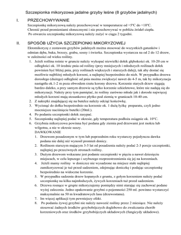 Szczepionka mikoryzowa jadalne grzyby leśne (8 grzybów jadalnych) I. PRZECHOWYWANIE Szczepionkę mikoryzową należy przechowywać w temperaturze od +5ºC do +18ºC. Chronić przed promieniami słonecznymi i nie przechowywać w pobliżu źródeł ciepła. Po otwarciu szczepionkę mikoryzową należy zużyć w ciągu 2 tygodni. II. SPOSÓB UŻYCIA SZCZEPIONKI MIKORYZOWEJ Ektomikoryzę z zestawem grzybów jadalnych można stosować do wszystkich gatunków i odmian dęba, buka, brzozy, grabu, sosny i świerka. Szczepionka wystarcza na od 2 do 12 drzew, w zależności od wieku rośliny. 1. Jeżeli roślina rośnie w gruncie należy wykopać niewielki dołek głębokości ok. 10-20 cm w odległości ok. 10 średnic pnia od rośliny (przy mniejszych i młodszych roślinach dołek powinien być bliżej pnia, przy roślinach większych i starszych dalej), tak aby dostać się możliwie najbliżej młodych korzeni, a najlepiej bezpośrednio do nich. W przypadku drzewa dorosłego (dużego) odległość od pnia można zwiększyć nawet do 4-5 m, tak by mikoryzacja nastąpiła ok.1-2 m poza obwodem rzutu korony drzewa. Korzenie starych drzew sięgają bardzo daleko, a przy samym drzewie są tylko korzenie szkieletowe, które nie nadają się do mikoryzacji. Należy przy tym pamiętać, że rośliny zarówno młode jak i dorosłe najwięcej młodych korzeni mają stosunkowo płytko pod ziemią w granicach 10-40 cm. 2. Z nakrętki znajdującej się na butelce należy odciąć końcówkę. 3. Wycisnąć do dołka bezpośrednio na korzenie ok. 1 dużą łyżkę preparatu, czyli jedno mocniejsze naciśnięcie butelki (20ml.). 4. Po podaniu szczepionki dołek zasypać. 5. Szczepionkę najlepiej podać w okresie, gdy temperatura podłoża osiągnie ok. 10°C. 6. Grzybnia mikoryzowa powinna być podana gdy ziemia pod drzewami jest mokra lub wilgotna, a nie w okresie suszy. DAWKOWANIE 1. Drzewom posadzonym w tym lub poprzednim roku wystarczy pojedyncza dawka podana nie dalej niż wynosił promień donicy. 2. Roślinom starszym mającym 3-5 lat od posadzenia należy podać 2-3 porcje szczepionki, najlepiej po przeciwnych stronach rośliny. 3. Dużym drzewom wskazane jest podanie szczepionki w pięciu a nawet dziesięciu miejscach, w celu lepszego i szybszego rozprzestrzenienia się jej na korzeniach. 4. Jeżeli mamy rośliny w doniczce nie wysadzone na miejsce stałe najlepiej zamikoryzować je tuż przed sadzeniem, zdejmując doniczkę i podając szczepionkę bezpośrednio na widoczne korzenie. 5. W przypadku sadzenia drzew kopanych z gruntu, z gołym korzeniem należy podać szczepionkę na kilka najmłodszych, żywych korzeniach tuż przed sadzeniem. 6. Drzewa rosnące w grupie mikoryzujemy pomiędzy nimi starając się zachować podane wyżej zalecenia. Jedno opakowanie grzybni o pojemności 250 ml. powinno wystarczyć maksymalnie na 50 m kwadratowych lasu (drzewostanu). 7. Im więcej aplikacji tym pewniejszy efekt. 8. Po podaniu żywej grzybni nie należy nawozić rośliny przez 2 miesiące. Nie należy stosować żadnych środków grzybobójczych doglebowo do zwalczania chorób korzeniowych oraz środków grzybobójczych układowych (fungicydy układowe). III. UWAGI OGÓLNE 1. Uwaga: Obok wystąpienia grzybów jadalnych mogą pojawić się grzyby niejadalne oraz trujące, dlatego należy zachować należytą ostrożność podczas ich zbierania. 2. Produkt jest niejadalny. 3. Mikoryza nigdy nie szkodzi. (Nie ma możliwości przedawkowania). 4. Mikoryza raz podana wystarcza na całe życie rośliny. 5. Więcej informacji o mikoryzie na www.mikoryza.pl lub www.mykoflor.pl. 6. Termin przydatności znajduje się na opakowaniu. IV. PRODUCENT Producent: Laboratorium Grzybów Mikoryzowych Mykoflor®, Rudy 84, 24-130 Końskowola. V. SKŁAD SZCZEPIONKI W 2009 ROKU Skład szczepionki: borowik szlachetny (Boletus edulis), borowik sosnowy (Boletus pinicola), mleczaj rydz (Lactarius deliciosus), koźlarz babka (Leccinum scabrum), koźlarz pomarańczowoczerwony (Leccinum versipelle), maślak zwyczajny (Suillus luteus), maślak żółty (Suillus grevillei), gąska zielona (Tricholoma equestre). Stężenie: > 100 jednostek propagacyjnych w 1 ml.