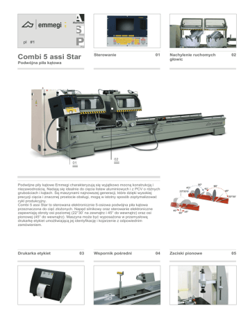 pl #1 Combi 5 assi Star Sterowanie 01 Podwójna piła kątowa Nachylenie ruchomych głowic 02 Zaciski pionowe 05 02 01 Podwójne piły kątowe Emmegi charakteryzują się wyjątkowo mocną konstrukcją i niezawodnością. Nadają się idealnie do cięcia listew aluminiowych i z PCV o różnych grubościach i kątach. Są maszynami najnowszej generacji, które dzięki wysokiej precyzji cięcia i znacznej prostocie obsługi, mogą w istotny sposób zoptymalizować cykl produkcyjny. Combi 5 assi Star to sterowana elektronicznie 5-osiowa podwójna piła kątowa przeznaczona do cięć złożonych. Napęd silnikowy oraz sterowanie elektroniczne zapewniają obroty osi poziomej (22°30’ na zewnątrz i 45° do wewnątrz) oraz osi pionowej (45° do wewnątrz). Maszyna może być wyposażona w przemysłową drukarkę etykiet umożliwiającą jej identyfikację i kojarzenie z odpowiednim zamówieniem. Drukarka etykiet 03 Wspornik pośredni 04 Combi 5 assi Star Podwójna piła kątowa 01 02 03 04 05 Sterowanie Nachylenie ruchomych głowic Drukarka etykiet Wspornik pośredni Zaciski pionowe Zainstalowany w różnych modelach pulpit sterowniczy przesuwa się na łożyskach, co ułatwia obsługę i umożliwia prawidłowe ustawienie ruchomych głowic w zależności od zaprogramowanego rodzaju cięcia. Tworzenie list cięcia pozwala zoptymalizować cykl roboczy, umożliwiając zarówno ograniczenie ilości odpadów jak też skrócenie czasu trwania fazy załadunku i wyładunku elementu. Serwonapędy z enkoderem umożliwiają odchylenie ruchomych głowic do tyłu, a ich odpowiednie ustawienie oraz nastawa parametrów dokonywane są za pomocą sterowania elektronicznego stanowiącego prosty interfejs operacyjny. Zespoły ruchome są wyposażone w opuszczane pneumatycznie osłony całkowicie zabezpieczające strefę roboczą. Przemysłowa drukarka etykiet umożliwia przypisanie do każdego przyciętego profilu parametrów identyfikacyjnych pochodzących z listy cięcia. Dodatkowo drukarka kodów kreskowych umożliwia prostą identyfikację samego profilu, co jest szczególnie przydatne w kolejnych fazach jego obróbki na centrach obróbczych lub w liniach montażowych. Pneumatyczny wspornik pośredni jest szczególnie przydatny podczas cięcia lekkich profili o znacznej długości. W takim przypadku pneumatyczny wspornik pośredni w sposób automatyczny idealnie podtrzymuje niewymiarowy profil. Ten dodatkowy element wyposażenia jest dostępny z maszynami do cięcia wszystkich wymiarów, jednak zaleca się jego użycie w maszynach o zakresie roboczym cięcia od 5 do 6 metrów. Pewne i precyzyjne zamocowanie ciętego profilu jest ułatwione poprzez zastosowanie zacisków pneumatycznych, wyposażonych w urządzenie niskiego ciśnienia zapobiegające przypadkowemu zgnieceniu. Dla ułatwienia regulacji poziomej i pionowej poszczególnych siłowników, każdy zespół zacisków jest wyposażony w praktyczne uchwyty dźwigniowe. Diagram cięcia DANE TECHNICZNE STEROWANIA Komputer przemysłowy kompatybilny z “Windows XPE” Kolorowy wyświetlacz graficzny TFT 12" Pamięć DOMM o pojemności 1 GB Mysz wbudowana w klawiaturę Gniazdo do podłączenia przemysłowej drukarki etykiet Możliwość połączenia ze zdalnym PC przez USB, sieć lub złącze szeregowe (zależnie od wersji) Realizacja cięć cyklicznych na podstawie list cięcia i makroinstrukcji Realizacja cięć pojedynczych Zapisywanie w pamięci 500 wartości korekcyjnych profilu z automatycznym obliczaniem wymiaru do cięć pod kątem Zapisywanie w pamięci 500 list cięcia (każda o 1000 liniach) za pomocą klawiatury Optymalizacja listew DANE TECHNICZNE MASZYNY Elektroniczne sterowanie nastawami kątów pośrednich Określanie położenia ruchomej głowicy za pomocą bezpośredniego układu pomiarowego z taśmą magnetyczną 2 piły widiowe ø 500 Sterowane pneumatycznie osłony zabezpieczające całkowicie strefę roboczą Para pneumatycznych zacisków poziomych z urządzeniem "niskiego ciśnienia” System pionowego mocowania z zaciskiem poziomym Transporter rolkowy profili System smarowania olejowego z minimalną dyfuzją Ręczny wspornik profilu Miejsce pod automatyczny starter odciągu MG4-MG8 Linijka metryczna Zakres roboczy cięcia 4/5/6 m, zależnie od modelu Moc silnika piły (kW) 2009/03/06 2,2
