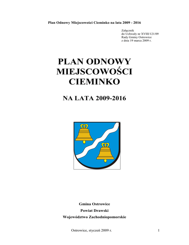 Plan Odnowy Miejscowości Cieminko na lata 2009 - 2016 Załącznik do Uchwały nr XVIII/121/09 Rady Gminy Ostrowice z dnia 19 marca 2009 r. PLAN ODNOWY MIEJSCOWOŚCI CIEMINKO NA LATA 2009-2016 Gmina Ostrowice Powiat Drawski Województwo Zachodniopomorskie Ostrowice, styczeń 2009 r. 1 Plan Odnowy Miejscowości Cieminko na lata 2009 - 2016 SPIS TREŚCI I. Wstęp……………………………………………………3 II. PołoŜenie………………………………………………..4 III. Charakterystyka miejscowości………………………….5 1. Ludność 2. Instytucje 3. Działalność kulturalna i sportowa 4. Środowisko przyrodnicze 5. PołoŜenie komunikacyjne 6. Gospodarka 7. Zabytki IV. Obecna sytuacja społeczno- gospodarcza……………....7 V. Analiza zasobów wsi Cieminko………………………..8 VI. Analiza SWOT………………………………………...12 VII. Wizja rozwoju wsi……………………………………..13 VIII. Opis przedsięwzięć przewidzianych do realizacji……..14 IX. WdraŜanie i monitoring………………………………..15 X. Harmonogram planowanego przedsięwzięcia………....15 XI. Szczegółowy harmonogram działań……………….…..16 Ostrowice, styczeń 2009 r. 2 Plan Odnowy Miejscowości Cieminko na lata 2009 - 2016 I. Wstęp: Konieczność opracowania Planu Odnowy Miejscowości wynika z wytycznych Programu Rozwoju Obszarów Wiejskich, a w szczególności wytycznych osi 3 PROW – Działanie Odnowa i Rozwój Wsi. Oś 3 zakłada między innymi wspieranie działań mających wpływ na poprawę jakości Ŝycia na obszarach wiejskich przez zaspokojenie potrzeb społecznych i kulturalnych mieszkańców wsi. Głównym celem programów odnowy i rozwoju obszarów wiejskich jest wzmocnienie istniejących róŜnic w poziomie rozwojowym obszarów wiejskich w porównaniu do obszarów miejskich. Program rozwoju miejscowości jest przewaŜnie składową częścią przeprowadzanych dotąd zadań. Zmierza do poprawy sytuacji gmin oraz wsi, które są im podporządkowane. Głównymi załoŜeniami Planu Odnowy Miejscowości są m.in.: poprawa warunków Ŝycia na terenach wiejskich, zachowanie walorów środowiskowych, rozwój kultury, remonty obiektów sportowych, świetlic wiejskich, placów zabaw. Plan rozwoju i odnowy wsi Cieminko zaplanowany został na okres 8 najbliŜszych lat. W tym okresie wykonywane będą określone z uwagi na zaplanowane wcześniej cele i priorytety rozwojowe działania inwestycyjne. Podjęcie do realizacji danego zadania poprzedzone zostanie przygotowaniem niezbędnych opisów i uzasadnień realizacji zadania, opracowaniem zakresu rzeczowego, określeniem kosztów i terminów realizacji. Tak przygotowane i określone zadania będą przyjmowane na zebraniach wiejskich i będą częścią stanowiącą w kolejnych załącznikach do planu. Plan Odnowy Miejscowości jest dokumentem o charakterze planowania strategicznego i ma na celu stworzenie szczegółowej koncepcji i wizji rozwoju miejscowości oraz pokaŜe zaangaŜowanie i aktywność mieszkańców Cieminka. Określi metody, dzięki którym miejscowość będzie się rozwijać. Opracowanie i uchwalenie takiego dokumentu stanowi niezbędny warunek przy ubieganiu się o środki finansowe w ramach Programu Rozwoju Obszarów Wiejskich na lata 2007 – 2013 Działanie Odnowa i Rozwój Wsi. Obszarem realizacji Planu Odnowy Miejscowości Cieminko jest obszar tej miejscowości. Ostrowice, styczeń 2009 r. 3 Plan Odnowy Miejscowości Cieminko na lata 2009 - 2016 II. PołoŜenie: Cieminko jest miejscowością naleŜącą do Gminy Ostrowice, która administracyjnie wchodzi w skład województwa zachodniopomorskiego (z siedzibą w Szczecinie) w powiecie drawskim. Zajmuje obszar 150,42 km² w środkowej części województwa. Geograficznie obszar gminy Ostrowice wchodzi w skład Pojezierza Drawskiego - jednej z największych jednostek fizjograficznych Pojezierza Zachodniopomorskiego. Tutaj przebiega takŜe granica Drawskiego i Ińskiego Parku Krajobrazowego. Obszar gminy charakteryzuje się urozmaicona rzeźbą terenu z licznymi formami polodowcowymi. Dominującym typem krajobrazu jest młodoglacjalny, pagórkowaty pojezierny, poprzecinany dolinami i równinami akumulacyjnymi (den dolinnych). Obszar całej gminy zasobny jest w wody powierzchniowe i wgłębne. Ponadto na terenie gminy występuje 20 jezior. Przez obszar gminy przebiega droga wojewódzka nr 173 relacji Drawsko Pomorskie-Połczyn Zdrój. Przez teren Ostrowic przechodzą ponadto pozostałe szlaki komunikacyjne łączące miejscowości gminy z innymi ośrodkami w powiecie i województwie. Mapa 1. PołoŜenie Cieminka na tle Gminy Ostrowice Ostrowice, styczeń 2009 r. 4 Plan Odnowy Miejscowości Cieminko na lata 2009 - 2016 III. Charakterystyka miejscowości: Cieminko jest małą miejscowością Gminy Ostrowice, połoŜoną w powiecie drawskim woj. zachodniopomorskie. Na obszarze Gminy Ostrowice przebiega granica malowniczego Drawskiego i Ińskiego Parku Krajobrazowego. Cieminko leŜy na uboczu trasy prowadzącej z Ostrowic do Nowego Worowa. Miejscowość Cieminko tworzy sołectwo. Funkcję sołtysa pełni pan Stanisław Krasoń, który jest jednocześnie radnym Rady Gminy Ostrowice. Wokół miejscowości Cieminko znajduje się znaczna ilość lasów. Mieszkańcy tej niewielkiej miejscowości wyraŜają chęć pomocy w poprawie i rozwoju miejsca swojego zamieszkania poprzez integrację podczas prac na rzecz wsi. Podstawowe dane: Stan ludność na dzień 31.12.2008 r.: WIEK LICZBA MIESZKAŃCÓW Do 18 roku Ŝycia 10 19 – 60 lat 40 PowyŜej 60 lat 7 Ogółem 57 Źródło: Ewidencja ludności Urzędu Gminy Ostrowice Instytucje: Na terenie miejscowości Cieminko działa jednostka Ochotniczej StraŜy PoŜarnej. Działalność kulturalna i sportowa: W Cieminku znajduje się świetlica wiejska, której utrzymanie jest finansowane z budŜetu gminy. W świetlicy odbywają się zajęcia dla dzieci, organ