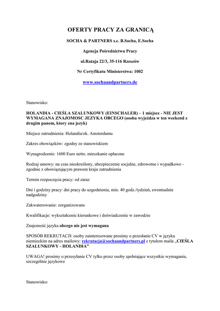 OFERTY PRACY ZA GRANICĄ SOCHA & PARTNERS s.c. B.Socha, E.Socha Agencja Pośrednictwa Pracy ul.Rataja 22/3, 35-116 Rzeszów Nr Certyfikatu Ministerstwa: 1002 www.sochaandpartners.de Stanowisko: HOLANDIA - CIEŚLA SZALUNKOWY (EINSCHALER) – 1 miejsce - NIE JEST WYMAGANA ZNAJOMOSC JEZYKA OBCEGO (osoba wyjeżdza w ten weekend z drugim panem, ktory zna jezyk) Miejsce zatrudnienia: Holandia/ok. Amsterdamu Zakres obowiązków: zgodny ze stanowiskiem Wynagrodzenie: 1600 Euro netto. mieszkanie opłacone Rodzaj umowy: na czas nieokreślony, ubezpieczenie socjalne, zdrowotne i wypadkowe zgodnie z obowiązującym prawem kraju zatrudnienia Termin rozpoczęcia pracy: od zaraz Dni i godziny pracy: dni pracy do uzgodnienia, min. 40 godz./tydzień, ewentualnie nadgodziny Zakwaterowanie: zorganizowane Kwalifikacje: wykształcenie kierunkowe i doświadczenie w zawodzie Znajomość języka obcego nie jest wymagana SPOSÓB REKRUTACJI: osoby zainteresowane prosimy o przesłanie CV w języku niemieckim na adres mailowy: [email protected] z tytułem maila „CIEŚLA SZALUNKOWY - HOLANDIA” UWAGA! prosimy o przesyłanie CV tylko przez osoby spełniające wszystkie wymagania, szczególnie językowe Stanowisko: HOLANDIA - CIEŚLA SZALUNKOWY (EINSCHALER) - 4 miejsca + MURARZ (MAURER) 4 miejsca + CIEŚLA DACHOWY (DACHDECKER) – 4 miejsca Miejsce zatrudnienia: Holandia/ok. Amsterdamu Zakres obowiązków: zgodny ze stanowiskiem Wynagrodzenie: 1600 Euro netto. mieszkanie opłacone Rodzaj umowy: na czas nieokreślony, ubezpieczenie socjalne, zdrowotne i wypadkowe zgodnie z obowiązującym prawem kraju zatrudnienia Termin rozpoczęcia pracy: od zaraz Dni i godziny pracy: dni pracy do uzgodnienia, min. 40 godz./tydzień, ewentualnie nadgodziny Zakwaterowanie: zorganizowane, oplacone Kwalifikacje: wykształcenie kierunkowe i doświadczenie w zawodzie Znajomość języka angielskiego lub niemieckiego: 1 osoba w każdej grupie - dobra znajomość (rozmowa przez telefon z pracodawcą) , reszta osób nie musi znać języka SPOSÓB REKRUTACJI: osoby zainteresowane prosimy o przesłanie CV w języku niemieckim na adres mailowy: [email protected] z tytułem maila „CIEŚLA SZALUNKOWY/MURARZ/CIESLA DACHOWY - HOLANDIA” UWAGA! prosimy o przesyłanie CV tylko przez osoby spełniające wszystkie wymagania, szczególnie językowe Stanowisko: AUSTRIA - CIEŚLA SZALUNKOWY/MURARZ (EINSCHALER) - 4 miejsca Miejsce zatrudnienia: Austria Zakres obowiązków: zgodny ze stanowiskiem Wynagrodzenie: 13,07 Euro/godz. brutto plus 41 Euro netto dziennie diety (w dni robocze) Rodzaj umowy: na czas nieokreślony, ubezpieczenie socjalne, zdrowotne i wypadkowe zgodnie z obowiązującym prawem kraju zatrudnienia Termin rozpoczęcia pracy: od zaraz Dni i godziny pracy: dni pracy do uzgodnienia, min. 40 godz./tydzień, ewentualnie nadgodziny Zakwaterowanie: zorganizowane Kwalifikacje: wykształcenie kierunkowe i doświadczenie w zawodzie Znajomość języka angielskiego lub niemieckiego: 1 osoba w grupie - dobra znajomość (rozmowa przez telefon z pracodawcą), reszta osób nie musi znać języka SPOSÓB REKRUTACJI: osoby zainteresowane prosimy o przesłanie CV w języku niemieckim na adres mailowy: [email protected] z tytułem maila „CIEŚLA SZALUNKOWY/MURARZ - AUSTRIA” UWAGA! prosimy o przesyłanie CV tylko przez osoby spełniające wszystkie wymagania, szczególnie językowe