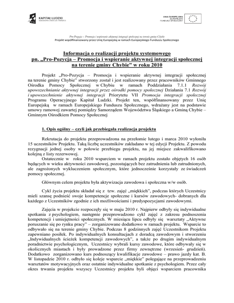 Pro-Pozycja – Promocja i wspieranie aktywnej integracji społecznej na terenie gminy Chybie Projekt współfinansowany przez Unię Europejską w ramach Europejskiego Funduszu Społecznego Informacja o realizacji projektu systemowego pn. „Pro-Pozycja – Promocja i wspieranie aktywnej integracji społecznej na terenie gminy Chybie” w roku 2010 Projekt „Pro-Pozycja – Promocja i wspieranie aktywnej integracji społecznej na terenie gminy Chybie” stworzony został i jest realizowany przez pracowników Gminnego Ośrodka Pomocy Społecznej w Chybiu w ramach Poddziałania 7.1.1 Rozwój upowszechnianie aktywnej integracji przez ośrodki pomocy społecznej Działania 7.1 Rozwój i upowszechnienie aktywnej integracji Priorytetu VII Promocja integracji społecznej Programu Operacyjnego Kapitał Ludzki. Projekt ten, współfinansowany przez Unię Europejską w ramach Europejskiego Funduszu Społecznego, wdrażany jest na podstawie umowy ramowej zawartej pomiędzy Samorządem Województwa Śląskiego a Gminą Chybie – Gminnym Ośrodkiem Pomocy Społecznej 1. Opis ogólny – czyli jak przebiegała realizacja projektu Rekrutacja do projektu przeprowadzona na przełomie lutego i marca 2010 wyłoniła 15 uczestników Projektu. Taką liczbę uczestników zakładano w tej edycji Projektu. Z powodu rezygnacji jednej osoby w połowie przebiegu projektu, na jej miejsce zakwalifikowano kolejną z listy rezerwowej. Ostatecznie w roku 2010 wsparciem w ramach projektu zostało objętych 16 osób będących w wieku aktywności zawodowej, pozostających bez zatrudnienia lub zatrudnionych, ale zagrożonych wykluczeniem społecznym, które jednocześnie korzystały ze świadczeń pomocy społecznej. Głównym celem projektu była aktywizacja zawodowa i społeczna w/w osób. Cykl życia projektu składał się z tzw. zajęć „miękkich”, podczas których Uczestnicy mieli szansę podnieść swoje kompetencje społeczne i kursów zawodowych- dobranych dla każdego z Uczestników zgodnie z ich możliwościami i predyspozycjami zawodowymi. Zajęcia w projekcie rozpoczęły się w maju 2010 r. Najpierw odbyły się indywidualne spotkania z psychologiem, następnie przeprowadzono cykl zajęć z zakresu podnoszenia kompetencji i umiejętności społecznych. W miesiącu lipcu odbyły się warsztaty „Aktywne poruszanie się po rynku pracy” – zorganizowane dodatkowo w ramach projektu. Wsparcie to odbywało się na terenie gminy Chybie. Podczas 8 godzinnych zajęć Uczestnikom Projektu zapewniano posiłek. Po indywidualnych konsultacjach z doradcą zawodowym i stworzeniu „Indywidualnych ścieżek kompetencji zawodowych”, a także po drugim indywidualnym poradnictwie psychologicznym, Uczestnicy wybrali kursy zawodowe, które odbywały się w okolicznych miastach i były prowadzone przez firmy zewnętrzne (wrzesień- grudzień). Dodatkowo zorganizowano kurs podnoszący kwalifikacje zawodowe – prawo jazdy kat. B. W listopadzie 2010 r. odbyło się koleje wsparcie „miękkie” polegające na przeprowadzeniu warsztatów motywacyjnych oraz ostatnie indywidualne spotkanie z psychologiem. Przez cały okres trwania projektu wszyscy Uczestnicy projektu byli objęci wsparciem pracownika Pro-Pozycja – Promocja i wspieranie aktywnej integracji społecznej na terenie gminy Chybie Projekt współfinansowany przez Unię Europejską w ramach Europejskiego Funduszu Społecznego socjalnego, który prowadził szeroko rozumianą pracę socjalną i monitorował realizację kontraktów socjalnych zawartych z w/w. 2. Formy wsparcia – czyli w czym Uczestnicy projektu wzięli udział Szczegółowa charakterystyka form wsparcia, jaką Uczestnicy projektu otrzymali w ramach tzw. aktywnej integracji (aktywizacja społeczna, zawodowa i edukacyjna) przedstawia się następująco: 1. indywidualne poradnictwo psychologiczne (3h dla każdego Uczestnika) 2. możliwość udziału w indywidualnej terapii psychologicznej 3. cykl szkoleń z zakresu podnoszenia kompetencji i umiejętności społecznych: a. zajęcia integracyjne (8h) b. trening skutecznego rodzica wg T. Gordona (24h) c. warsztaty radzenia sobie ze stresem (8h) d. trening umiejętności interpersonalnych (8h) e. warsztaty motywujące (16h) 4. warsztaty pt. „Zmień swój styl-znajdź pracę” (20h) 5. indywidualne konsultacje z doradcą zawodowym (2h dla każdego Uczestnika) 6. kursy zawodowe : a. sprzedawca z obsługą komputera, kasy fiskalnej i programu SUBIEKT- 6 osób b. księgowość małej firmy wraz z obsługą komputera- 3 osoby c. opiekunka do dzieci, osób starszych, chorych i niepełnosprawnych- 4 osoby d. palacz kotłów centralnego ogrzewania- 2 osoby e. kurs podnoszący kwalifikacje zawodowe: kurs prawa jazdy kat. B – 10 osób Dodatkowo w ramach projektu zorganizowano 30-godzinne warsztaty „Aktywne poruszanie się po rynku pracy”, podczas których w/w zapoznali się z metodami tworzenia dokumentów aplikacyjnych, potrzebami rynku pracy oraz sposobami prowadzenia rozmów kwalifikacyjnych. 3. Działania środowiskowe – czyli w jaki sposób skorzystać z projektu środowisko lokalne mogło Nową formą wsparcia, jaką zostali objęci Uczestnicy tegorocznej edycji projektu to działania środowiskowe, w ramach których zorganizowano pięć imprez środowiskowych w ramach „Rodzinnej Akademii Radości” oraz dwie wycieczki integracyjne. „Rodzinna Akademia Radości” W miesiącu sierpniu i wrześniu odbyły się pilotażowe spotkania w ramach Rodzinnej Akademii Radości, gdzie podczas gminnych festynów Uczestnicy projektu oraz ich otoczenie, Pro-Pozycja – Promocja i wspieranie aktywnej integracji społecznej na terenie gminy Chybie Projekt współfinansowany przez Unię Europejską w ramach Europejskiego Funduszu Społecznego a także wszyscy uczestnicy festynów, mieli okazję poznać metody kreatywnego spędzania czasu wolnego wraz z dziećmi. Natomiast przez 3 kolejne niedziele w miesiącu październiku, listopadzie i grudniu odbyły si