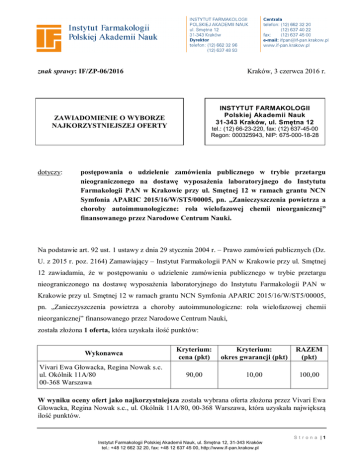 Kraków, 3 czerwca 2016 r. znak sprawy: IF/ZP-06/2016 INSTYTUT FARMAKOLOGII Polskiej Akademii Nauk 31-343 Kraków, ul. Smętna 12 ZAWIADOMIENIE O WYBORZE NAJKORZYSTNIEJSZEJ OFERTY dotyczy: tel.: (12) 66-23-220, fax: (12) 637-45-00 Regon: 000325943, NIP: 675-000-18-28 postępowania o udzielenie zamówienia publicznego w trybie przetargu nieograniczonego na dostawę wyposażenia laboratoryjnego do Instytutu Farmakologii PAN w Krakowie przy ul. Smętnej 12 w ramach grantu NCN Symfonia APARIC 2015/16/W/ST5/00005, pn. „Zanieczyszczenia powietrza a choroby autoimmunologiczne: rola wielofazowej chemii nieorganicznej” finansowanego przez Narodowe Centrum Nauki. Na podstawie art. 92 ust. 1 ustawy z dnia 29 stycznia 2004 r. – Prawo zamówień publicznych (Dz. U. z 2015 r. poz. 2164) Zamawiający – Instytut Farmakologii PAN w Krakowie przy ul. Smętnej 12 zawiadamia, że w postępowaniu o udzielenie zamówienia publicznego w trybie przetargu nieograniczonego na dostawę wyposażenia laboratoryjnego do Instytutu Farmakologii PAN w Krakowie przy ul. Smętnej 12 w ramach grantu NCN Symfonia APARIC 2015/16/W/ST5/00005, pn. „Zanieczyszczenia powietrza a choroby autoimmunologiczne: rola wielofazowej chemii nieorganicznej” finansowanego przez Narodowe Centrum Nauki, została złożona 1 oferta, która uzyskała ilość punktów: Wykonawca Vivari Ewa Głowacka, Regina Nowak s.c. ul. Okólnik 11A/80 00-368 Warszawa Kryterium: cena (pkt) Kryterium: okres gwarancji (pkt) RAZEM (pkt) 90,00 10,00 100,00 W wyniku oceny ofert jako najkorzystniejsza została wybrana oferta złożona przez Vivari Ewa Głowacka, Regina Nowak s.c., ul. Okólnik 11A/80, 00-368 Warszawa, która uzyskała największą ilość punktów. S t r on a |1 Instytut Farmakologii Polskiej Akademii Nauk, ul. Smętna 12, 31-343 Kraków tel.: +48 12 662 32 20, fax: +48 12 637 45 00, http://www.if-pan.krakow.pl Zamawiający informuje, że umowa zostanie zawarta z wybranym Wykonawcą w terminie nie krótszym niż 10 dni od dnia przesłania zawiadomienia, tj. nie wcześniej niż w dniu 14 czerwca 2016 roku. S t r on a |2 Instytut Farmakologii Polskiej Akademii Nauk, ul. Smętna 12, 31-343 Kraków tel.: +48 12 662 32 20, fax: +48 12 637 45 00, http://www.if-pan.krakow.pl