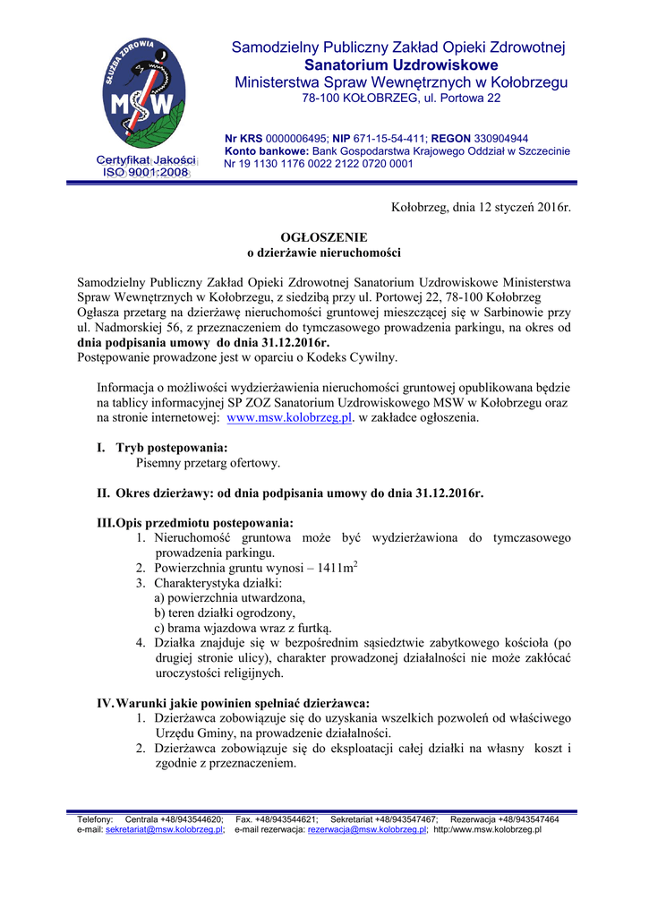 Samodzielny Publiczny Zakład Opieki Zdrowotnej Sanatorium Uzdrowiskowe Ministerstwa Spraw Wewnętrznych w Kołobrzegu 78-100 KOŁOBRZEG, ul. Portowa 22 Nr KRS 0000006495; NIP 671-15-54-411; REGON 330904944 Konto bankowe: Bank Gospodarstwa Krajowego Oddział w Szczecinie Nr 19 1130 1176 0022 2122 0720 0001 Kołobrzeg, dnia 12 styczeń 2016r. OGŁOSZENIE o dzierżawie nieruchomości Samodzielny Publiczny Zakład Opieki Zdrowotnej Sanatorium Uzdrowiskowe Ministerstwa Spraw Wewnętrznych w Kołobrzegu, z siedzibą przy ul. Portowej 22, 78-100 Kołobrzeg Ogłasza przetarg na dzierżawę nieruchomości gruntowej mieszczącej się w Sarbinowie przy ul. Nadmorskiej 56, z przeznaczeniem do tymczasowego prowadzenia parkingu, na okres od dnia podpisania umowy do dnia 31.12.2016r. Postępowanie prowadzone jest w oparciu o Kodeks Cywilny. Informacja o możliwości wydzierżawienia nieruchomości gruntowej opublikowana będzie na tablicy informacyjnej SP ZOZ Sanatorium Uzdrowiskowego MSW w Kołobrzegu oraz na stronie internetowej: www.msw.kolobrzeg.pl. w zakładce ogłoszenia. I. Tryb postepowania: Pisemny przetarg ofertowy. II. Okres dzierżawy: od dnia podpisania umowy do dnia 31.12.2016r. III.Opis przedmiotu postepowania: 1. Nieruchomość gruntowa może być wydzierżawiona do tymczasowego prowadzenia parkingu. 2. Powierzchnia gruntu wynosi – 1411m2 3. Charakterystyka działki: a) powierzchnia utwardzona, b) teren działki ogrodzony, c) brama wjazdowa wraz z furtką. 4. Działka znajduje się w bezpośrednim sąsiedztwie zabytkowego kościoła (po drugiej stronie ulicy), charakter prowadzonej działalności nie może zakłócać uroczystości religijnych. IV. Warunki jakie powinien spełniać dzierżawca: 1. Dzierżawca zobowiązuje się do uzyskania wszelkich pozwoleń od właściwego Urzędu Gminy, na prowadzenie działalności. 2. Dzierżawca zobowiązuje się do eksploatacji całej działki na własny koszt i zgodnie z przeznaczeniem. Telefony: Centrala +48/943544620; e-mail: [email protected]; Fax. +48/943544621; Sekretariat +48/943547467; Rezerwacja +48/943547464 e-mail rezerwacja: [email protected]; http:/www.msw.kolobrzeg.pl Samodzielny Publiczny Zakład Opieki Zdrowotnej Sanatorium Uzdrowiskowe Ministerstwa Spraw Wewnętrznych w Kołobrzegu 78-100 KOŁOBRZEG, ul. Portowa 22 Nr KRS 0000006495; NIP 671-15-54-411; REGON 330904944 Konto bankowe: Bank Gospodarstwa Krajowego Oddział w Szczecinie Nr 19 1130 1176 0022 2122 0720 0001 3. Minimalna kwota miesięcznego czynszu wydzierżawienia gruntu wynosi: 1300,00 zł netto (słownie: jeden tysiąc trzysta zł 00/100 zł) plus obowiązujący podatek VAT. 4. Czynsz płatny będzie z góry w terminie do 15 dnia każdego miesiąca na podstawie faktur VAT wystawionych przez Wydzierżawiającego przelewem na jego rachunek bankowy w Bank Gospodarstwa Krajowego Oddział w Szczecinie nr rachunku: 19 1130 1176 0022 2122 0720 0001, lub w kasie Sanatorium. 5. Za datę zapłaty faktury uznaje się datę wpływu na rachunek Wydzierżawiającego. 6. Za każdy dzień opóźnienia w zapłacie czynszu naliczane będą odsetki w wysokości ustawowej. 7. Dzierżawca zobowiązany jest do zapłaty czynszu bez względu na przerwy w prowadzeniu działalności. V. Informacja dotycząca sposobu sporządzenia, składania i otwarcia ofert: 1. Ofertę należy sporządzić w języku polskim, pismem maszynowym, komputerowym lub ręcznym, nieścieralnym atramentem. 2. Oferta wraz z załącznikami i dokumentami powinna być złożona w zaklejonej kopercie i oznakowanej danymi oferenta z dopiskiem: „ Oferta na dzierżawę nieruchomości gruntowej mieszczącej się w Sarbinowie przy ul. Nadmorskiej 56.” 3. Wszystkie strony dokumentów składających się na ofertę muszą być ponumerowane. 4. Oferta powinna być podpisana przez osobę upoważnioną do reprezentowania oferenta, a każda ze stron parafowana. 5. Każdy oferent ma prawo do złożenia tylko jednej oferty i może zaproponować tylko jedna cenę. 6. Oferenci zobowiązani są do złożenia oferty zgodniej z wymaganiami niniejszego ogłoszenia pod rygorem odrzucenia. 7. Nie dopuszcza się uzupełnienia oferty po terminie składania ofert. 8. Oferent ponosi wszelkie koszty związane z przygotowaniem i złożeniem oferty. 9. Oferty należy składać w terminie do dnia 19 stycznia 2016 roku do godz. 10:00 na adres: SP ZOZ Sanatorium Uzdrowiskowe MSW w Kołobrzegu, ul. Portowa 22, 78-100 Kołobrzeg, w sekretariacie w godzinach urzędowania tj. od godz. 07:00 – 14:35. 10. Otwarcie ofert nastąpi w dniu upływu składania ofert o godz. 10:05, w siedzibie Sanatorium pokój 3-113 (parter niskiego budynku). Telefony: Centrala +48/943544620; e-mail: [email protected]; Fax. +48/943544621; Sekretariat +48/943547467; Rezerwacja +48/943547464 e-mail rezerwacja: [email protected]; http:/www.msw.kolobrzeg.pl Samodzielny Publiczny Zakład Opieki Zdrowotnej Sanatorium Uzdrowiskowe Ministerstwa Spraw Wewnętrznych w Kołobrzegu 78-100 KOŁOBRZEG, ul. Portowa 22 Nr KRS 0000006495; NIP 671-15-54-411; REGON 330904944 Konto bankowe: Bank Gospodarstwa Krajowego Oddział w Szczecinie Nr 19 1130 1176 0022 2122 0720 0001 11. Otwarcie ofert jest jawne. 12. Oferty złożone po terminie składania ofert zostaną odesłane, bądź zwrócone oferentom bez ich otwierania. VI. Wyjaśnienia: 1. Wyjaśnienia dotyczące ogłoszenia będą udzielane w formie pisemnej faksem bądź z wykorzystaniem poczty elektronicznej, jednocześnie zostaną zamieszczone na stronie internetowej Sanatorium. 2. Oferent zwraca się z prośbą o udzielenie wyjaśnienia lub zapytania dotyczącego ogłoszenia na piśmie. 3. Wszelkich informacji dotyczących przetargu udziela: Andrzej Gosek, tel. 94 3544620 wew. 1500, tel. 607800234. VII. Kryteria oceny ofert: Cena – 100%, Umowa zostanie zawarta z oferentem, którego oferta spełnia warunki określone w ogłoszeniu oraz złożona oferta uznana zostanie za najkorzystniejsza pod względem ceny. VIII. Wykaz dokumentów jaki