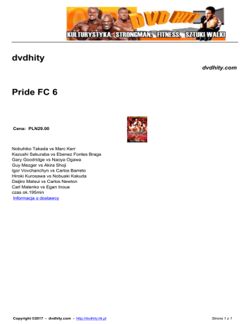 dvdhity dvdhity.com Pride FC 6 Cena: PLN29.00 Nobuhiko Takada vs Marc Kerr Kazushi Sakuraba vs Ebenez Fontes Braga Gary Goodridge vs Naoya Ogawa Guy Mezger vs Akira Shoji Igor Vovchanchyn vs Carlos Barreto Hiroki Kurosawa vs Nobuaki Kakuda Daijiro Matsui vs Carlos Newton Carl Malenko vs Egan Inoue czas ok.195min Informacja o dostawcy Copyright ©2017 - dvdhity.com - http://dvdhity.llk.pl Strona 1 z 1