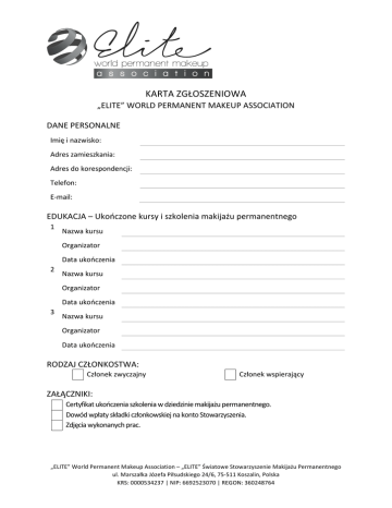 KARTA ZGŁOSZENIOWA „ELITE” WORLD PERMANENT MAKEUP ASSOCIATION DANE PERSONALNE Imię i nazwisko: Adres zamieszkania: Adres do korespondencji: Telefon: E-‐mail: EDUKACJA – Ukończone kursy i szkolenia makijażu permanentnego 1 2 3 Nazwa kursu Organizator Data ukończenia Nazwa kursu Organizator Data ukończenia Nazwa kursu Organizator Data ukończenia RODZAJ CZŁONKOSTWA: Członek zwyczajny Członek wspierający ZAŁĄCZNIKI: Certyfikat ukończenia szkolenia w dziedzinie makijażu permanentnego. Dowód wpłaty składki członkowskiej na konto Stowarzyszenia. Zdjęcia wykonanych prac. „ELITE” World Permanent Makeup Association – „ELITE” Światowe Stowarzyszenie Makijażu Permanentnego ul. Marszałka Józefa Piłsudskiego 24/6, 75-‐511 Koszalin, Polska KRS: 0000534237 | NIP: 6692523070 | REGON: 360248764 Deklaruję, że zapoznałem/łam się ze Statutem „ELITE” World Permanent Makeup Association oraz zobowiązuję się do przestrzegania jego założeń i współpracy w zakresie wspólnej realizacji celów. Zobowiązuję się do opłacania składki członkowskiej w wysokości 120 zł rocznie, lub 10 zł miesięcznie, na konto Stowarzyszenia: Bank PKO BP Nr konta: 29 1020 2791 0000 7102 0229 0971 Dane do przelewu z zagranicy: IBAN: PL 29 1020 2791 0000 7102 0229 0971 SWIFT: BPKOPLPW Wyrażam zgodę na przetwarzanie moich danych osobowych dla potrzeb niezbędnych w bieżącej pracy „ELITE” oraz realizacji jego celów statutowych (w rozumieniu Ustawy z dnia 29.08.1997r. o ochronie danych osobowych). Wyrażam zgodę na przesyłanie informacji handlowych drogą elektroniczną przez „ELITE” World Permanent Makeup Association z siedzibą w Koszalinie ul. Marszałka Józefa Piłsudskiego 24/6, 75-‐511, zgodnie z ustawą z dn. 18 lipca 2002 roku o świadczeniu usług drogą elektroniczną (Dz. U. z 2002 r. Nr 144, poz. 1204 z późn. zm.).” na adres podany w karcie zgłoszeniowej Data Podpis Po zapoznaniu się z treścią Karty Zgłoszeniowej i dołączonymi dokumentami, deklarację wpisano do rejestru członków „ELITE” World Permanent Makeup Association pod numerem ………./………./………./………. Koszalin, dnia Podpis Prezesa „ELITE” World Permanent Makeup Association – „ELITE” Światowe Stowarzyszenie Makijażu Permanentnego ul. Marszałka Józefa Piłsudskiego 24/6, 75-‐511 Koszalin, Polska KRS: 0000534237 | NIP: 6692523070 | REGON: 360248764
