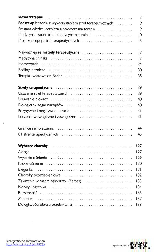 Słowo wstępne .......................................................................................... 7 .............. 9 Prastara wiedza lecznicza a nowoczesna terapia .................................... 9 Podstawy leczenia z wykorzystaniem stref terapeutycznych Medycyna akademicka i medycyna naturalna ........................................ 10 Moja koncepcja stref terapeutycznych .................................................... 13 Najważniejsze metody terapeutyczne .................................................... 17 Medycyna chińska Homeopatia ...................................................................................... 17 ............................................................................................... 24 ........................................................................................ 30 Terapia kwiatowa dr. B a c h a ....................................................................... Rośliny lecznicze 35 Strefy terapeutyczne ................................................................................. 39 Ustalanie stref terapeutycznych ................................................................ 39 Usuwanie blokady ...................................................................................... Biologiczny zegar narządów ..................................................................... Pozytywne i negatywne uczucia .............................................................. Leczenie wewnętrzne i zewnętrzne Granice samoleczenia Alergie 41 .............................................................................. 44 ................ 45 ...................................................................................... ............................................. Wysokie ciśnienie Niskie ciśnienie 41 . ..................................................... 8 1 stref terapeutycznych Wybrane choroby 40 40 127 ...................................................................................... .................................................................... Biegunka ...................................................................................................... Choroby przeziębieniowe 127 .......................... Zakażenie wirusem opryszczki (herpes) 129 130 131 132 .................................................. 133 N erw y i psychika ........................................................................................ 134 Bezsenność ................................................................................................. 135 Zaparcie 137 ...................................................................................................... Dolegliwości okresu przekwitania ........................................................... 138 Jak sobie pomóc: praktyczne sposoby.................................................... 141 Masaż meridianów ..................................................................................... 141 Gimnastyka meridianów ........................................................................... 149 Stosowanie leków homeopatycznych 166 .................................................... Zastosowanie ekstraktów kwiatowych dr. Bacha Stosowanie roślin leczniczych ................................. 169 .......................................... ....................... 170 Zalecenia d ie te ty c z n e ................................................................................ 174 Piśmiennictwo ............................................................................................ Indeks .......................................................................................................... 184 185*