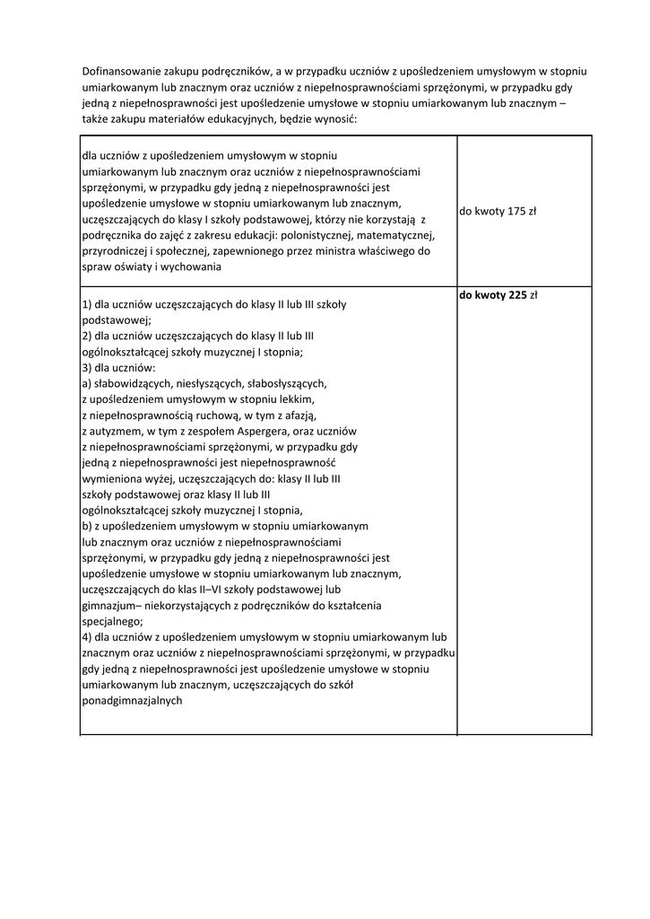 Dofinansowanie zakupu podręczników, a w przypadku uczniów z upośledzeniem umysłowym w stopniu umiarkowanym lub znacznym oraz uczniów z niepełnosprawnościami sprzężonymi, w przypadku gdy jedną z niepełnosprawności jest upośledzenie umysłowe w stopniu umiarkowanym lub znacznym – także zakupu materiałów edukacyjnych, będzie wynosić: dla uczniów z upośledzeniem umysłowym w stopniu umiarkowanym lub znacznym oraz uczniów z niepełnosprawnościami sprzężonymi, w przypadku gdy jedną z niepełnosprawności jest upośledzenie umysłowe w stopniu umiarkowanym lub znacznym, uczęszczających do klasy I szkoły podstawowej, którzy nie korzystają z podręcznika do zajęć z zakresu edukacji: polonistycznej, matematycznej, przyrodniczej i społecznej, zapewnionego przez ministra właściwego do spraw oświaty i wychowania 1) dla uczniów uczęszczających do klasy II lub III szkoły podstawowej; 2) dla uczniów uczęszczających do klasy II lub III ogólnokształcącej szkoły muzycznej I stopnia; 3) dla uczniów: a) słabowidzących, niesłyszących, słabosłyszących, z upośledzeniem umysłowym w stopniu lekkim, z niepełnosprawnością ruchową, w tym z afazją, z autyzmem, w tym z zespołem Aspergera, oraz uczniów z niepełnosprawnościami sprzężonymi, w przypadku gdy jedną z niepełnosprawności jest niepełnosprawność wymieniona wyżej, uczęszczających do: klasy II lub III szkoły podstawowej oraz klasy II lub III ogólnokształcącej szkoły muzycznej I stopnia, b) z upośledzeniem umysłowym w stopniu umiarkowanym lub znacznym oraz uczniów z niepełnosprawnościami sprzężonymi, w przypadku gdy jedną z niepełnosprawności jest upośledzenie umysłowe w stopniu umiarkowanym lub znacznym, uczęszczających do klas II–VI szkoły podstawowej lub gimnazjum– niekorzystających z podręczników do kształcenia specjalnego; 4) dla uczniów z upośledzeniem umysłowym w stopniu umiarkowanym lub znacznym oraz uczniów z niepełnosprawnościami sprzężonymi, w przypadku gdy jedną z niepełnosprawności jest upośledzenie umysłowe w stopniu umiarkowanym lub znacznym, uczęszczających do szkół ponadgimnazjalnych do kwoty 175 zł do kwoty 225 zł dla uczniów: do kwoty 770 zł 1) niesłyszących, z upośledzeniem umysłowym w stopniu lekkim oraz uczniów z niepełnosprawnościami sprzężonymi, w przypadku gdy jedną z niepełnosprawności jest niepełnosprawność wymieniona wyżej,uczęszczających do: klasy II lub III szkoły podstawowej lub klasy II lub III ogólnokształcącej szkoły muzycznej I stopnia, 2) z upośledzeniem umysłowym w stopniu umiarkowanym lub znacznym oraz uczniów z niepełnosprawnościami sprzężonymi, w przypadku gdy jedną z niepełnosprawności jest upośledzenie umysłowe w stopniu umiarkowanym lub znacznym, uczęszczających do klas II–VI szkoły podstawowej lub gimnazjum dla uczniów: do kwoty 770 zł 1) niesłyszących, z upośledzeniem umysłowym w stopniu lekkim oraz uczniów z niepełnosprawnościami sprzężonymi, w przypadku gdy jedną z niepełnosprawności jest niepełnosprawność wymieniona wyżej,uczęszczających do: klasy II lub III szkoły podstawowej lub klasy II lub III ogólnokształcącej szkoły muzycznej I stopnia, 2) z upośledzeniem umysłowym w stopniu umiarkowanym lub znacznym oraz uczniów z niepełnosprawnościami sprzężonymi, w przypadku gdy jedną z niepełnosprawności jest upośledzenie umysłowe w stopniu umiarkowanym lub znacznym, uczęszczających do klas II–VI szkoły podstawowej lub gimnazjum - korzystających z podręczników do kształcenia specjalnego; w przypadku korzystania z części podręczników do kształcenia ogólnego niebędących podręcznikami do kształcenia specjalnego, koszt dofinansowania zakupu podręczników do kształcenia ogólnego niebędących podręcznikami do kształcenia specjalnego lub materiałów edukacyjnych nie może być wyższy niż 192,50 zł do kwoty 325 zł 1) dla uczniów uczęszczających do klasy VI szkoły podstawowej; 2) dla uczniów uczęszczających do klasy VI ogólnokształcącej szkoły muzycznej I stopnia lub klasy III ogólnokształcącej szkoły baletowej, 3) dla uczniów słabowidzących, niesłyszących, słabosłyszących, z upośledzeniem umysłowym w stopniu lekkim, z niepełnosprawnością ruchową, w tym z afazją, z autyzmem, w tym z zespołem Aspergera oraz uczniów z niepełnosprawnościami sprzężonymi, w przypadku gdy jedną z niepełnosprawności jest niepełnosprawność wymieniona wyżej, uczęszczających do: klas IV–VI szkoły podstawowej, klas IV–VI ogólnokształcącej szkoły muzycznej I stopnia lub klas I–III ogólnokształcącej szkoły baletowej, niekorzystających z podręczników do kształcenia specjalnego dla uczniów niesłyszących z upośledzeniem umysłowym w stopniu do kwoty 770 zł lekkim oraz uczniów z niepełnosprawnościami sprzężonymi, w przypadku gdy jedną z niepełnosprawności jest niepełnosprawność wymieniona wyżej, uczęszczających do: klas IV–VI szkoły podstawowej, klas IV–VI ogólnokształcącej szkoły muzycznej I stopnia lub klas I–III ogólnokształcącej szkoły baletowej, korzystających z podręczników do kształcenia specjalnego; w przypadku korzystania z części podręczników do kształcenia ogólnego niebędących podręcznikami do kształcenia specjalnego, koszt dofinansowania zakupu podręczników do kształcenia ogólnego niebędących podręcznikami do kształcenia specjalnego nie może być wyższy niż 308,00 zł dla uczniów słabowidzących, niesłyszących, słabosłyszących, z upośledzeniem umysłowym w stopniu lekkim, z niepełnosprawnością ruchową, w tym z afazją, z autyzmem, w tym z zespołem Aspergera oraz uczniów z niepełnosprawnościami sprzężonymi, w przypadku gdy jedną z niepełnosprawności jest niepełnosprawność wymieniona wyżej, uczęszczających do: gimnazjum, klas I–III ogólnokształcącej szkoły muzycznej II st