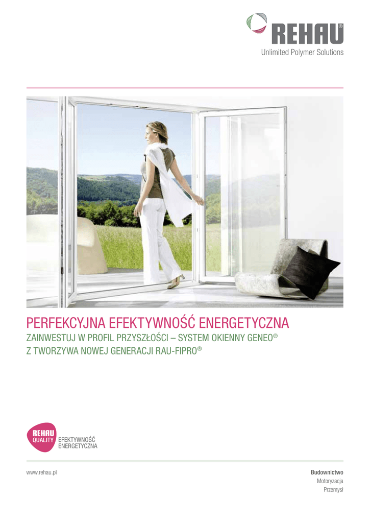 perfekcyjna efektywność energetyczna zainwestuj w profil przyszłości – system okienny GENEO® z tworzywa nowej generacji rau-fipro® EFEKTYWNOŚĆ ENERGETYCZNA www.rehau.pl Budownictwo Motoryzacja Przemysł system profili GENEO® z myślą o przyszłości – GENEO® to unikatowe rozwiązanie w zakresie techniki okiennej System okienny GENEO to niezwykła innowacja w dziedzinie techniki okiennej. To doskonały wybór dla osób, które cenią nowatorskie rozwiązania. - system niezwykle stabilnych profili okiennych, w których można wyeliminować stosowanie tradycyjnych wzmocnień ze stali - wykonany z innowacyjnego tworzywa nowej generacji RAU-FIPRO - wyjątkowa klasa efektywności energetycznej – od okien do domów niskoenergetycznych (np. Uw = 1,1 W/m²K), po okna w standardzie domów pasywnych (np. Uw = 0,73 W/m²K) - doskonała izolacyjność akustyczna okna – Rw (C, Ctr) = 47 (-1; -3) dB dla szyby o izolacyjności akustycznej 50 dB, osiągana bez wzmocnienia stalowego - utrudnienia przeciwwłamaniowe do klasy RC 3, bez wzmocnienia stalowego do klasy RC 2 – przy zachowaniu optymalnych parametrów ochrony cieplnej - łatwe w czyszczeniu, gładkie powierzchnie zewnętrzne profili, odporne na działanie czynników atmosferycznych - zwiększona powierzchnia przeszklenia, dzięki obniżeniu wysokości pakietu profili – nowoczesny wygląd oraz efektywne pozyskiwanie ciepła i światła słonecznego - najpewniejsza inwestycja w energooszczędność – już dziś spełnisz normy przyszłości Zainwestuj w swoją przyszłość. Wybierz GENEO! Wymiana starych okien na nowoczesne okna z systemu GENEO pozwoli na zmniejszenie wydatków na ogrzewanie oraz poprawę komfortu mieszkania. Dzięki GENEO możesz zaoszczędzić nawet do 76% energii! stare okna drewniane okna GENEO (wymiar okna 123 x 148 cm) (wymiar okna 123 x 148 cm) współczynnik Ug oszklenia 3,0 W/m²K 0,5 W/m²K współczynnik Uf ramy 1,9 W/m²K 0,86 W/m²K rezultat: dzięki GENEO możesz możesz zaoszczędzić nawet do 76% energii Dzięki profilom GENEO otrzymujesz okna o najwyższej efektywności energetycznej i możesz zrealizować swoje marzenia odnośnie komfortu mieszkania. Nowatorska konstrukcja profili pozwala w większości przypadków na rezygnację z tradycyjnie stosowanych wzmocnień stalowych. Brak stali sprawia, że znika przyczyna powstawania mostków termicznych i zmniejszają się straty energii. okna z profili gENEO® najlepsza izolacyjność akustyczna, skuteczna ochrona przeciwwłamaniowa – w pakiecie z energooszczędnością System z uszczelką środkową Doskonałą szczelność okien GENEO zapewniają trzy wysokiej jakości elastyczne uszczelki umieszczone obwiedniowo. Uszczelki wykonane są z materiału odpornego na niekorzystne warunki atmosferyczne i są długowieczne. izolacyjność akustyczna Rw = 47 dB z szybą 50 dB bez wzmocnienia stalowego optymalne parametry ochrony cieplnej ochrona przed hałasem - rozkoszuj się ciszą oszklenie zalecana izolacyjność akustyczna okna* Rw natężenie ruchu odległość domu od osi jezdni droga lokalna 1500 pojazdów/dzień 30-12 m droga lokalna 1500 pojazdów/dzień 12-5 m 30-34 dB droga krajowa 30 000 pojazdów/dzień 150-80 m 35-39 dB droga krajowa 30 000 pojazdów/dzień 80-30 m 40-44 dB 40 dB 42 dB autostrada 50 000 pojazdów/dzień 70-40 m 45-49 dB 50 dB 47 dB 28-29 dB * zdolność okien do zmniejszenia poziomu natężenia hałasu do klasy RC 2 bez wzmocnienia stalowego optymalne parametry ochrony cieplnej ochrona przeciwwłamaniowa - dla Twojego bezpieczeństwa Podstawowa ochrona utrudniająca włamanie Ochrona przeciwwłamaniowa może zostać zwiększona przez zastosowanie specjalnych okuć. Podstawowa ochrona nie podlega badaniom i daje tylko niewielką poprawę bezpieczeństwa. Podwyższona ochrona przeciwwłamaniowa została określona w normie PN-EN 1627. Norma PN-EN 1627 klasyfikuje okna na klasy odporności na włamanie w zależności od uzyskanych wyników badań: - klasa RC 2 N oferuje zwiększoną ochronę przed użyciem prostych narzędzi typu wkrętak, kliny, szczypce, - klasa RC 2 oferuje podobną ochronę jak klasa RC 2 N lecz dodatkowo okna wyposażone są w szyby bezpieczne klasy 4, - klasa RC 3 oferuje zwiększoną ochronę przed użyciem ciężkich narzędzi typu łomy. Eleganckie wzornictwo Konstrukcja profili pozwala na uzyskanie optycznie eleganckich, wąskich powierzchni widocznych profili (115 mm) − również przy dużych wymiarach okien. W połączeniu z techniką klejenia szyb do profili REHAU można realizować stabilne elementy okienne o wysokości kondygnacji. Optymalne parametry termoizolacyjne Komory funkcyjne w profilach GENEO mają różnorodne zastosowanie. Przykładowo, wsunięte w komory wkładki thermo optymalizują parametry cieplne okien. Rdzeń profili z RAU-FIPRO Rdzeń profili z tworzywa nowej generacji RAU-FIPRO zastępuje tradycyjne wzmocnienie stalowe, zapewniając najwyższą stabilność okien GENEO. GENEO® – technologia jutra przygotuj się na wyzwania przyszłości przyszłość zaczyna się już dziś system okienny GENEO system okienny certyfikowany do domów pasywnych GENEO PHZ Cechy systemu w skrócie: System profili okiennych GENEO głębokość profili: 86 mm / system 6 komorowy współczynnik przenikania ciepła: Uf do 0,86 W/m2K (GENEO)* Uf do 0,79 W/m2K (GENEO PHZ)* izolacyjność akustyczna: Rw (C, Ctr) = 47 (-1; -3) dB dla szyby o izolacyjności akustycznej 50 dB, osiągana bez wzmocnienia stalowego** odporność na włamanie: do klasy RC 3, klasa RC 2 osiągana bez wzmocnienia stalowego** powierzchnia profili: twała, gładka, odporna na czynniki atmosferyczne, łatwa w czyszczeniu -nowoczesne rozwiązanie do domów energooszczędnych i przy termomodernizacji -osiąga standard domów pasywnych - spełnia najwyższe wymagania *Uf = wpółczynnik przenikania ciepła dla profili **przy zachowaniu optymalnych parametrów ochrony cieplnej 1. Nadzwyczajna stabilność RAU-FIPRO – tw