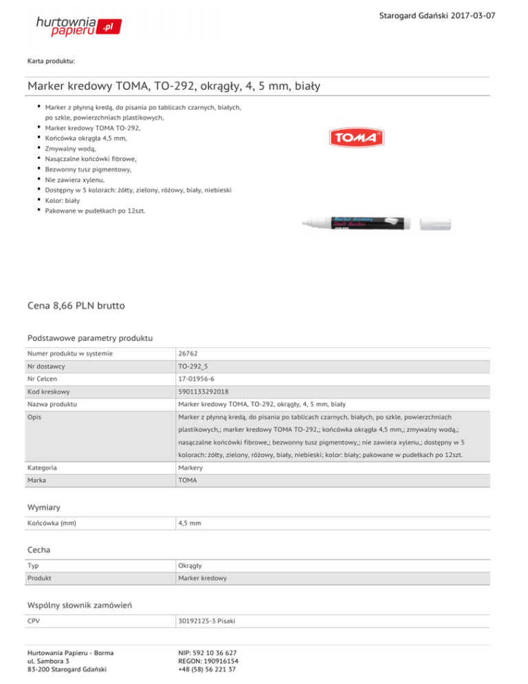 Starogard Gdański 2017-03-07 Karta produktu: Marker kredowy TOMA, TO-292, okrągły, 4, 5 mm, biały Marker z płynną kredą, do pisania po tablicach czarnych, białych, po szkle, powierzchniach plastikowych, Marker kredowy TOMA TO-292, Końcówka okrągła 4,5 mm, Zmywalny wodą, Nasączalne końcówki fibrowe, Bezwonny tusz pigmentowy, Nie zawiera xylenu, Dostępny w 5 kolorach: żółty, zielony, różowy, biały, niebieski Kolor: biały Pakowane w pudełkach po 12szt. Cena 8,66 PLN brutto Podstawowe parametry produktu Numer produktu w systemie 26762 Nr dostawcy TO-292_5 Nr Celcen 17-01956-6 Kod kreskowy 5901133292018 Nazwa produktu Marker kredowy TOMA, TO-292, okrągły, 4, 5 mm, biały Opis Marker z płynną kredą, do pisania po tablicach czarnych, białych, po szkle, powierzchniach plastikowych,; marker kredowy TOMA TO-292,; końcówka okrągła 4,5 mm,; zmywalny wodą,; nasączalne końcówki fibrowe,; bezwonny tusz pigmentowy,; nie zawiera xylenu,; dostępny w 5 kolorach: żółty, zielony, różowy, biały, niebieski; kolor: biały; pakowane w pudełkach po 12szt. Kategoria Markery Marka TOMA Wymiary Końcówka (mm) 4,5 mm Cecha Typ Okrągły Produkt Marker kredowy Wspólny słownik zamówień CPV 30192125-3 Pisaki Hurtowania Papieru - Borma ul. Sambora 3 83-200 Starogard Gdański NIP: 592 10 36 627 REGON: 190916154 +48 (58) 56 221 37 Starogard Gdański 2017-03-07 Karta katalogowa produktu cd. Marker kredowy TOMA, TO-292, okrągły, 4, 5 mm, biały Certyfikaty Nowy produkt w ofercie Standard Hit Standard Kolor Kolor Biały Pozostałe zdjęcia produktu Serdecznie zapraszamy do współpracy Hurtowania Papieru - Borma zespół. Hurtowania Papieru - Borma ul. Sambora 3 83-200 Starogard Gdański NIP: 592 10 36 627 REGON: 190916154 +48 (58) 56 221 37