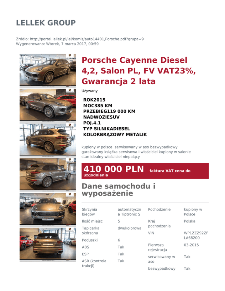 LELLEK GROUP Źródło: http://portal.lellek.pl/lel/komis/auto14401,Porsche.pdf?grupa=9 Wygenerowano: Wtorek, 7 marca 2017, 00:59 Porsche Cayenne Diesel 4,2, Salon PL, FV VAT23%, Gwarancja 2 lata Używany ROK2015 MOC385 KM PRZEBIEG119 000 KM NADWOZIESUV POJ.4.1 TYP SILNIKADIESEL KOLORBRĄZOWY METALIK kupiony w polsce serwisowany w aso bezwypadkowy garażowany książka serwisowa I właściciel kupiony w salonie stan idealny właściciel niepalący 410 000 PLN faktura VAT cena do uzgodnienia Dane samochodu i wyposażenie Skrzynia biegów automatyczn a Tiptronic S Pochodzenie kupiony w Polsce Ilość miejsc 5 Polska Tapicerka skórzana dwukolorowa Kraj pochodzenia VIN Poduszki 6 WP1ZZZ92ZF LA68200 ABS Tak Pierwsza rejestracja 03-2015 ESP Tak Tak serwisowany w aso Tak ASR (kontrola trakcji) bezwypadkowy Tak Klimatyzacja automatyczna garażowany Tak książka serwisowa Tak I właściciel Tak kupiony w salonie Tak tunning homologacja stan idealny Tak właściciel niepalący Tak czterostrefow a Handlowiec Marcin Teske, Maciej Słobodowski +48 661 911 912 zapytaj mobile +48 515 000 911 Gwarancja Gwarancja dostępna Ubezpieczenie Ubezpieczenie dostępne Kredyt Kredyt dostępny Elektryczne szyby Tak Elektryczne lusterka Tak Wspomaganie kierownicy Tak Komputer Tak Radioodtwarza cz Tak Alarm Tak Immobilizer Tak Centralny zamek Tak Nawigacja satelitarna Tak Światła przeciwmgieln e Tak Czujnik deszczu Tak Czujniki parkowania Tak Kierownica wielofunkcyjna Tak Ogrzewanie postojowe Tak Podgrzewane fotele Tak Zaw. pneumatyczne Tak Tempomat Tak 4x4 Tak Asystent pasa ruchu Tak Czujnik martwego pola Tak Kamera cofania Tak Bluetooth Tak System Start-Stop Tak Asystent parkowania Tak Zeskanuj kod, aby zobaczyć ofertę online Czujniki parkowania przód Tak Dach panoramiczny Tak Tuner TV Tak Światła LED Tak Alufelgi 20 cali Miejsce postoju Porsche Centrum Sopot / Approved Opis dodatkowy Porsche Cayenne Diesel 4,2 Tiptronic Kolor: Umber Metalic Tapicerka skórzana dwukolorowa Espresso / Cognac PA2 Automatycznie ściemniające się lusterka zewnętrzne i wewnętrzne 3FU Dach Panoramiczny 0NA Brak oznaczenia modelu 5W4 Relingi dachowe wykończone w kolorze czarnym QJ4 Listwy bocznych szyb w kolorze czarnym 8SB Przyciemnione klosze tylnych lamp 8EX Reflektory LED Porsche Dynamic Light System Plus ( PDLS Plus ) 4F2 Porsche Entry&Drive GZ2 Delikatne domykanie drzwi Soft Close 7X8 Asystent parkowania z przodu i z tyłu z kamerą cofania VW5 Termoizolacyjne szyby laminowane 1BK Zawieszenie pneumatyczne z systemem samopoziomowania i funkcją regulacji wysokości z Porsche Active Suspension 1Y1 Porsche Torque Vectoring Plus (PTV Plus ) 1N3 Wspomaganie układu kierowniczego Plus 0P6 Czarne sportowe końcówki układu wydechowego 1NP Kolorowe emblematy Porsche w piastach kół C5B 20 calowe koło RS Spyder Design PP6 Pakiet oświetlenia komfort 9AH 4 strefowa klimatyzacja automatyczna 4X4 Boczne poduszki powietrzne z tyłu 9M9 Niezależne ogrzewanie samochodu 3X1 Pokrowiec na narty 3Y7 Elektryczne rolety przeciwsłoneczne tylnych bocznych szyb 9Jb Pakiet dla palących 8T3 Adaptacyjny tempomat 0TD Dywaniki 7Y7 Asystent utrzymania pasa ruchu z asystentem zmiany pasa ruchu Lane Change Assist LCA 9Q6 System rozpoznawania ograniczenia prędkości FI3 Pasy bezpieczeństwa w kolorze Espresso PE6 Adaptacyjne sportowe fotele z 18 zakresową regulacją i pakietem pamięci 4A4 Podgrzewane fotele z przodu i z tyłu 4D3 Wentylowane fotele z przodu 5MH Pakiet wnętrza z włókna węglowego 2FX Ogrzewana kierownica wielofunkcyjna wykończona włóknem węglowym 7M8 Podświetlane listwy progowe z włókna węglowego 7T1 Porsche Communication Management PCM z modułem nawigacji QR1 Kompas w desce rozdzielczej 9W5 Przygotowanie do telefonu komórkowego 9VJ System dźwiękowy Burmester High End Surround Sound 7D7 Zmieniarka na 6 płyt CD/DVD 7M4 Przygotowanie do montażu podświetlanych listw progowych AXK Pakiet wnętrza ze środkową cześcią foteli ze skóry w kontrastowym kolorze Espresso 2D1 Pakiet Sport Design 6Q7 Dźwignia zmiany biegów Tiptronic S z aluminium Cena katalogowa 719 283 zł brutto. W cenie 2 lata gwarancji Porsche Approved ! Samochód na ekspozycji salonu Porsche Approved w Sopocie / przy Porsche Centrum Sopot Zapraszamy ! Nota prawna Informacja nie stanowi oferty w rozumieniu art. 66 Kodeksu Cywilnego. Podane dane mają charakter wyłącznie informacyjny. Pełna informacja dostępna jest u handlowca. Sprzedający nie odpowiada za ewentualne błędy lub nieaktualność ogłoszenia.