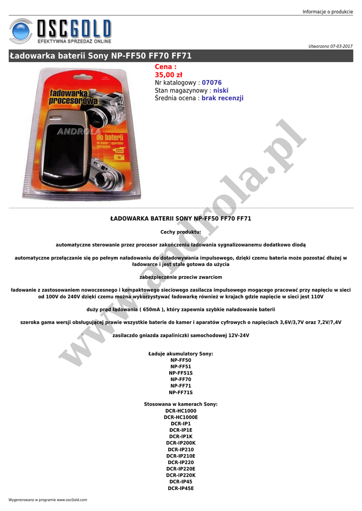 Informacje o produkcie Utworzono 07-03-2017 Ładowarka baterii Sony NP-FF50 FF70 FF71 Cena : 35,00 zł ro la .p l Nr katalogowy : 07076 Stan magazynowy : niski Średnia ocena : brak recenzji ŁADOWARKA BATERII SONY NP-FF50 FF70 FF71 nd Cechy produktu: automatyczne sterowanie przez procesor zakończeniu ładowania sygnalizowanemu dodatkowo diodą automatyczne przełączanie się po pełnym naładowaniu do doładowywania impulsowego, dzięki czemu bateria może pozostać dłużej w ładowarce i jest stale gotowa do użycia w .a zabezpieczenie przeciw zwarciom ładowanie z zastosowaniem nowoczesnego i kompaktowego sieciowego zasilacza impulsowego mogącego pracować przy napięciu w sieci od 100V do 240V dzięki czemu można wykorzystywać ładowarkę również w krajach gdzie napięcie w sieci jest 110V duży prąd łądowania ( 650mA ), który zapewnia szybkie naładowanie baterii w w szeroka gama wersji obsługującej prawie wszystkie baterie do kamer i aparatów cyfrowych o napięciach 3,6V/3,7V oraz 7,2V/7,4V zasilaczdo gniazda zapaliniczki samochodowej 12V-24V Ładuje akumulatory Sony: NP-FF50 NP-FF51 NP-FF51S NP-FF70 NP-FF71 NP-FF71S Stosowana w kamerach Sony: DCR-HC1000 DCR-HC1000E DCR-IP1 DCR-IP1E DCR-IP1K DCR-IP200K DCR-IP210 DCR-IP210E DCR-IP220 DCR-IP220E DCR-IP220K DCR-IP45 DCR-IP45E Wygenerowano w programie www.oscGold.com DCR-IP5 DCR-IP55 DCR-IP55E DCR-IP5E DCR-IP7 DCR-IP7BT DCR-IP7E DCR-PC106 DCR-PC106E DCR-PC107 DCR-PC107E DCR-PC108 DCR-PC108E DCR-PC109 DCR-PC109E DCR-PC350 DCR-PC350E la .p l Instrukcja obsługi: 1. Podłączyć zasilacz do sieci 2. Po podłączeniu ładowarki do zasilacza zapala się zielona dioda. 3. Włożyć baterię do ładowarki, poprawne jej włożenie i rozpoczęcie procesu ładowania jest sygnalizowane poprzez zmianę koloru diody z zielonego na czerwony. Dioda może pozostać w kolorze zielonym jeśli włożona do ładowarki bateria jest w pełni naładowana. 4. Po pełnym naładowaniu dioda zmienia kolor z czerwonego na zileony i automatycznie ładowarka przełącza się w tryb doładowywania impulsowego. nd ro Specyfikacja: Wejście: DC 12-24V AC 100V-240V Wyjście: 4,2V lub 8,4V 0,5A Stan: Nowy w w w .a Opakowanie: Blister