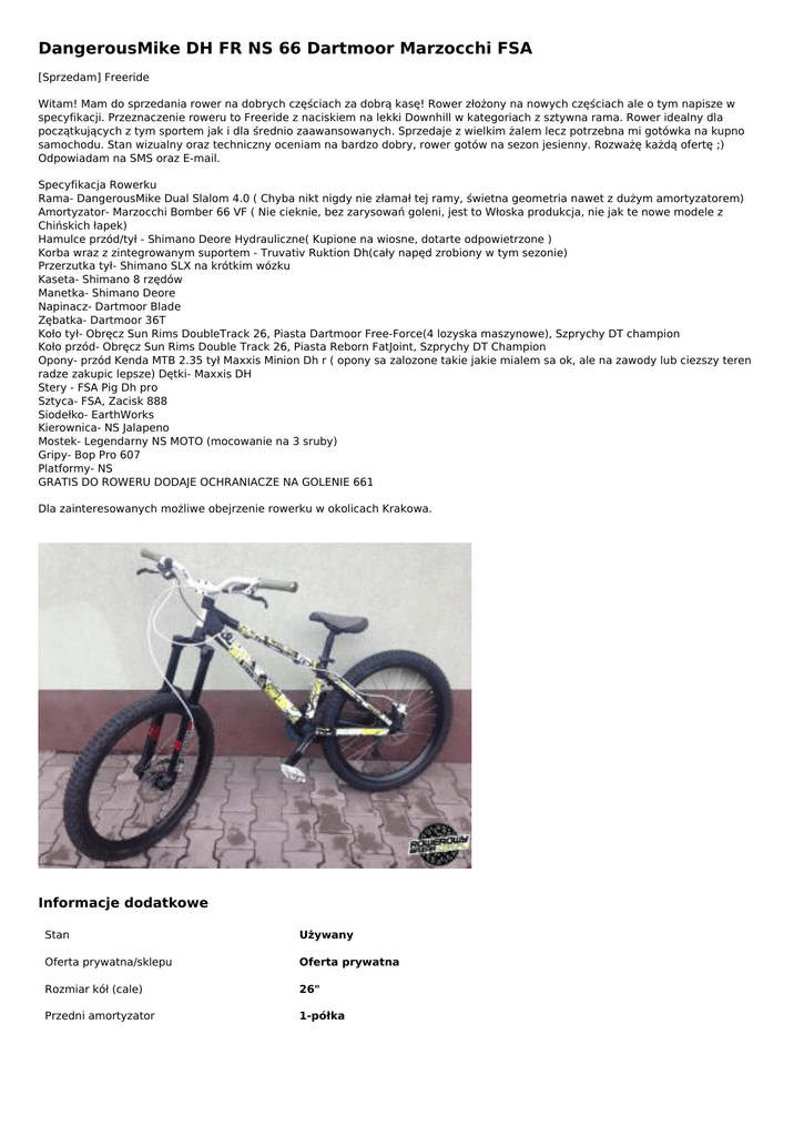 DangerousMike DH FR NS 66 Dartmoor Marzocchi FSA [Sprzedam] Freeride Witam! Mam do sprzedania rower na dobrych częściach za dobrą kasę! Rower złożony na nowych częściach ale o tym napisze w specyfikacji. Przeznaczenie roweru to Freeride z naciskiem na lekki Downhill w kategoriach z sztywna rama. Rower idealny dla początkujących z tym sportem jak i dla średnio zaawansowanych. Sprzedaje z wielkim żalem lecz potrzebna mi gotówka na kupno samochodu. Stan wizualny oraz techniczny oceniam na bardzo dobry, rower gotów na sezon jesienny. Rozważę każdą ofertę ;) Odpowiadam na SMS oraz E-mail. Specyfikacja Rowerku Rama- DangerousMike Dual Slalom 4.0 ( Chyba nikt nigdy nie złamał tej ramy, świetna geometria nawet z dużym amortyzatorem) Amortyzator- Marzocchi Bomber 66 VF ( Nie cieknie, bez zarysowań goleni, jest to Włoska produkcja, nie jak te nowe modele z Chińskich łapek) Hamulce przód/tył - Shimano Deore Hydrauliczne( Kupione na wiosne, dotarte odpowietrzone ) Korba wraz z zintegrowanym suportem - Truvativ Ruktion Dh(cały napęd zrobiony w tym sezonie) Przerzutka tył- Shimano SLX na krótkim wózku Kaseta- Shimano 8 rzędów Manetka- Shimano Deore Napinacz- Dartmoor Blade Zębatka- Dartmoor 36T Koło tył- Obręcz Sun Rims DoubleTrack 26, Piasta Dartmoor Free-Force(4 lozyska maszynowe), Szprychy DT champion Koło przód- Obręcz Sun Rims Double Track 26, Piasta Reborn FatJoint, Szprychy DT Champion Opony- przód Kenda MTB 2.35 tył Maxxis Minion Dh r ( opony sa zalozone takie jakie mialem sa ok, ale na zawody lub ciezszy teren radze zakupic lepsze) Dętki- Maxxis DH Stery - FSA Pig Dh pro Sztyca- FSA, Zacisk 888 Siodełko- EarthWorks Kierownica- NS Jalapeno Mostek- Legendarny NS MOTO (mocowanie na 3 sruby) Gripy- Bop Pro 607 Platformy- NS GRATIS DO ROWERU DODAJE OCHRANIACZE NA GOLENIE 661 Dla zainteresowanych możliwe obejrzenie rowerku w okolicach Krakowa. Informacje dodatkowe Stan Używany Oferta prywatna/sklepu Oferta prywatna Rozmiar kół (cale) 26" Przedni amortyzator 1-półka Adres ogłoszenia http://rowerowybazar.com.pl/dangerousmike-dh-fr-ns-66-dartmoor-marzocchi-fsa,o2627 Kontakt Mail: [email protected] Telefon: 794-341-657 Lokalizacja , Krakow Małopolskie (Polska) Ogłoszenie dodano: 2015-10-04 11:32:11 Ogłoszenie wygasa: 2017-06-02 11:32:11 Powered by TCPDF (www.tcpdf.org)