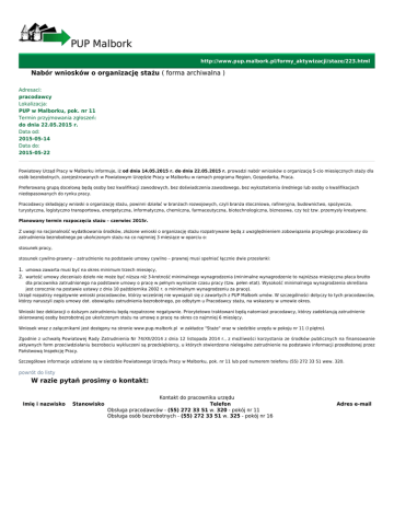 PUP Malbork http://www.pup.malbork.pl/formy_aktywizacji/staze/223.html Nabór wniosków o organizację stażu ( forma archiwalna ) Adresaci: pracodawcy Lokalizacja: PUP w Malborku, pok. nr 11 Termin przyjmowania zgłoszeń: do dnia 22.05.2015 r. Data od: 2015-05-14 Data do: 2015-05-22 Powiatowy Urząd Pracy w Malborku informuje, iż od dnia 14.05.2015 r. do dnia 22.05.2015 r. prowadzi nabór wniosków o organizację 5-cio miesięcznych staży dla osób bezrobotnych, zarejestrowanych w Powiatowym Urzędzie Pracy w Malborku w ramach programu Region, Gospodarka, Praca. Preferowaną grupą docelową będą osoby bez kwalifikacji zawodowych, bez doświadczenia zawodowego, bez wykształcenia średniego lub osoby o kwalifikacjach niedopasowanych do rynku pracy. Pracodawcy składający wnioski o organizację stażu, powinni działać w branżach rozwojowych, czyli branża stoczniowa, rafineryjna, budownictwo, spożywcza, turystyczna, logistyczno transportowa, energetyczna, informatyczna, chemiczna, farmaceutyczna, biotechnologiczna, biznesowa, czy też tzw. przemysły kreatywne. Planowany termin rozpoczęcia stażu – czerwiec 2015r. Z uwagi na racjonalność wydatkowania środków, złożone wnioski o organizację stażu rozpatrywane będą z uwzględnieniem zobowiązania przyszłego pracodawcy do zatrudnienia bezrobotnego po ukończonym stażu na co najmniej 3 miesiące w oparciu o: stosunek pracy, stosunek cywilno-prawny – zatrudnienie na podstawie umowy cywilno – prawnej musi spełniać łącznie dwie przesłanki: 1. umowa zawarta musi być na okres minimum trzech miesięcy, 2. wartość umowy zlecenia/o dzieło nie może być niższa niż 3-krotność minimalnego wynagrodzenia (minimalne wynagrodzenie to najniższa miesięczna płaca brutto dla pracownika zatrudnionego na podstawie umowy o pracę w pełnym wymiarze czasu pracy (tzw. pełen etat). Wysokość minimalnego wynagrodzenia określana jest corocznie na postawie ustawy z dnia 10 października 2002 r. o minimalnym wynagrodzeniu za pracę). Urząd rozpatrzy negatywnie wnioski pracodawców, którzy wcześniej nie wywiązali się z zawartych z PUP Malbork umów. W szczególności dotyczy to tych pracodawców, którzy naruszyli zapis umowy dot. obowiązku zatrudnienia bezrobotnego, po odbytym u Pracodawcy stażu, na wskazany w umowie okres. Wnioski bez deklaracji o dalszym zatrudnieniu będą rozpatrzone negatywnie. Priorytetowo traktowani będą natomiast pracodawcy, którzy zadeklarują zatrudnienie skierowanej osoby bezrobotnej po ukończonym stażu na umowę o pracę na okres co najmniej 6 miesięcy. Wniosek wraz z załącznikami jest dostępny na stronie www.pup.malbork.pl w zakładce "Staże" oraz w siedzibie urzędu w pokoju nr 11 (I piętro). Zgodnie z uchwałą Powiatowej Rady Zatrudnienia Nr 74/XII/2014 z dnia 12 listopada 2014 r., z możliwości korzystania ze środków publicznych na finansowanie aktywnych form przeciwdziałaniu bezrobociu wykluczeni są przedsiębiorcy, u których stwierdzono nielegalne zatrudnienie na podstawie informacji przedłożonej przez Państwową Inspekcję Pracy. Szczegółowe informacje udzielane są w siedzibie Powiatowego Urzędu Pracy w Malborku, pok. nr 11 lub pod numerem telefonu (55) 272 33 51 wew. 320. powrót do listy W razie pytań prosimy o kontakt: Imię i nazwisko Stanowisko Kontakt do pracownika urzędu Telefon Obsługa pracodawców - (55) 272 33 51 w. 320 - pokój nr 11 Obsługa osób bezrobotnych - (55) 272 33 51 w. 325 - pokój nr 16 Adres e-mail
