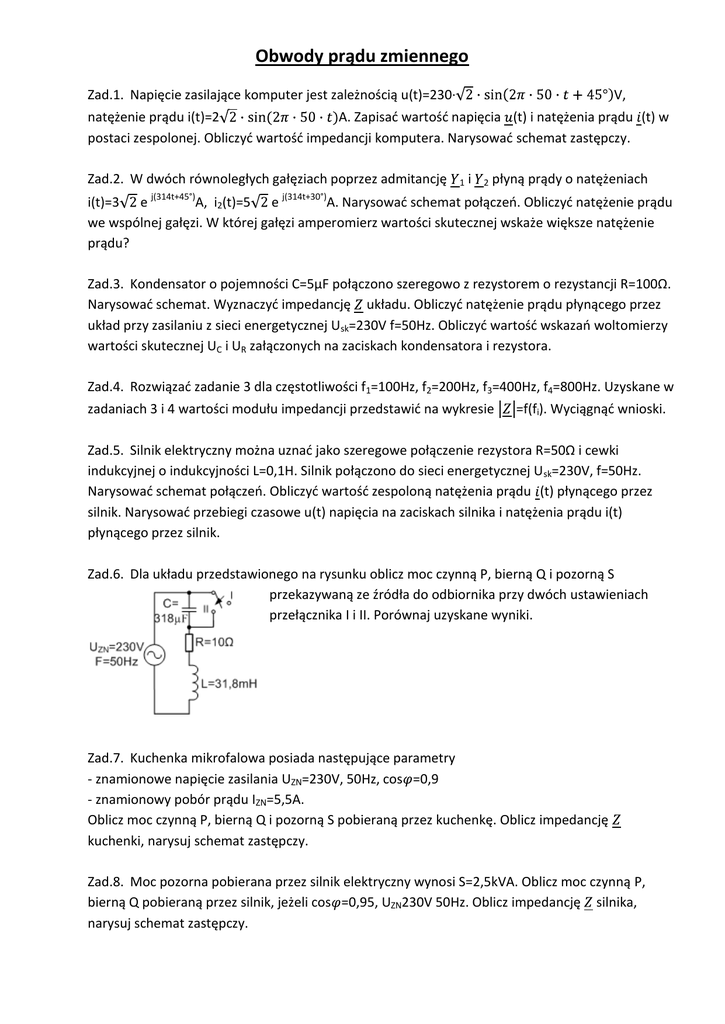 Obwody prądu zmiennego Zad.1. Napięcie zasilające komputer jest zależnością u(t)=230· V, natężenie prądu i(t)=2 A. Zapisad wartośd napięcia (t) i natężenia prądu (t) w postaci zespolonej. Obliczyd wartośd impedancji komputera. Narysowad schemat zastępczy. Zad.2. W dwóch równoległych gałęziach poprzez admitancję 1 i 2 płyną prądy o natężeniach i(t)=3 e j(314t+45°)A, i2(t)=5 e j(314t+30°)A. Narysowad schemat połączeo. Obliczyd natężenie prądu we wspólnej gałęzi. W której gałęzi amperomierz wartości skutecznej wskaże większe natężenie prądu? Zad.3. Kondensator o pojemności C=5µF połączono szeregowo z rezystorem o rezystancji R=100Ω. Narysowad schemat. Wyznaczyd impedancję układu. Obliczyd natężenie prądu płynącego przez układ przy zasilaniu z sieci energetycznej Usk=230V f=50Hz. Obliczyd wartośd wskazao woltomierzy wartości skutecznej UC i UR załączonych na zaciskach kondensatora i rezystora. Zad.4. Rozwiązad zadanie 3 dla częstotliwości f1=100Hz, f2=200Hz, f3=400Hz, f4=800Hz. Uzyskane w zadaniach 3 i 4 wartości modułu impedancji przedstawid na wykresie =f(fi). Wyciągnąd wnioski. Zad.5. Silnik elektryczny można uznad jako szeregowe połączenie rezystora R=50Ω i cewki indukcyjnej o indukcyjności L=0,1H. Silnik połączono do sieci energetycznej Usk=230V, f=50Hz. Narysowad schemat połączeo. Obliczyd wartośd zespoloną natężenia prądu (t) płynącego przez silnik. Narysowad przebiegi czasowe u(t) napięcia na zaciskach silnika i natężenia prądu i(t) płynącego przez silnik. Zad.6. Dla układu przedstawionego na rysunku oblicz moc czynną P, bierną Q i pozorną S przekazywaną ze źródła do odbiornika przy dwóch ustawieniach przełącznika I i II. Porównaj uzyskane wyniki. Zad.7. Kuchenka mikrofalowa posiada następujące parametry - znamionowe napięcie zasilania UZN=230V, 50Hz, cos =0,9 - znamionowy pobór prądu IZN=5,5A. Oblicz moc czynną P, bierną Q i pozorną S pobieraną przez kuchenkę. Oblicz impedancję kuchenki, narysuj schemat zastępczy. Zad.8. Moc pozorna pobierana przez silnik elektryczny wynosi S=2,5kVA. Oblicz moc czynną P, bierną Q pobieraną przez silnik, jeżeli cos =0,95, UZN230V 50Hz. Oblicz impedancję silnika, narysuj schemat zastępczy.
