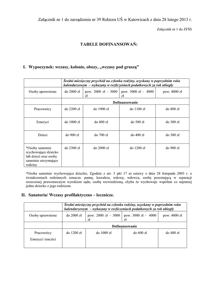 Załącznik nr 1 do zarządzenia nr 39 Rektora UŚ w Katowicach z dnia 28 lutego 2013 r. Załącznik nr 1 do ZFŚS TABELE DOFINANSOWAŃ: I. Wypoczynek: wczasy, kolonie, obozy, „wczasy pod gruszą” Średni miesięczny przychód na członka rodziny, uzyskany w poprzednim roku kalendarzowym – wykazany w rozliczeniach podatkowych za rok ubiegły Osoby uprawnione do 2000 zł pow. 2000 zł – 3000 zł pow. 3000 zł – 4000 zł pow. 4000 zł Dofinansowanie Pracownicy do 2200 zł do 1900 zł do 1100 zł do 800 zł Emeryci do 1000 zł do 800 zł do 500 zł do 300 zł Dzieci do 900 zł do 700 zł do 400 zł do 300 zł *Osoby samotnie wychowujące dziecko lub dzieci oraz osoby samotnie utrzymujące rodziny do 2300 zł do 2000 zł do 1200 zł do 900 zł *Osoba samotnie wychowująca dziecko, Zgodnie z art. 3 pkt 17 a) ustawy z dnia 28 listopada 2003 r. o świadczeniach rodzinnych oznacza: pannę, kawalera, wdowę, wdowca, osobę pozostającą w separacji orzeczonej prawomocnym wyrokiem sądu, osobę rozwiedzioną, chyba że wychowuje wspólnie co najmniej jedno dziecko z jego rodzicem. II. Sanatoria/ Wczasy profilaktyczno – lecznicze. Średni miesięczny przychód na członka rodziny, uzyskany w poprzednim roku kalendarzowym – wykazany w rozliczeniach podatkowych za rok ubiegły Osoby uprawnione do 2000 zł pow. 2000 zł – 3000 zł pow. 3000 zł – 4000 zł pow. 4000 zł Dofinansowanie Pracownicy Emeryci/ renciści do 1200 zł do 1000 zł do 600 zł do 400 zł III. Pomoc rzeczowa i finansowa Zapomogi losowe – do 2000 zł – wg propozycji Komisji. Średni miesięczny przychód na członka rodziny, uzyskany w poprzednim roku kalendarzowym – wykazany w rozliczeniach podatkowych za rok ubiegły do 2000 zł pow. 2000 zł – 3000 zł pow. 3000 zł – 4000 zł pow. 4000 zł Dofinansowanie Zapomoga z tyt. urodzenia dziecka do 1200 zł do 900 zł do 600 zł do 400 zł Zapomoga materialna do 1700 zł do 1500 zł do 1100 zł do 800 zł Dopłata do „zielonej szkoły” do 1000 zł do 800 zł do 500 zł do 300 zł Jednorazowe dofinansowanie świąteczne do 700 zł do 600 zł do 500 zł do 400 zł Dofinansowanie do wyżywienia w żłobkach, przedszkolach, szkołach do 80% mies. kosztów wyżywienia do 40% mies. kosztów wyżywienia --- --- IV. Działalność sportowo – rekreacyjna, kulturalno – oświatowa i wypoczynek sobotnioniedzielny organizowana przez Dział Spraw Osobowych i Socjalnych wspólnie ze związkami zawodowymi działającymi w Uczelni – do 50 % kosztów biletów lub uczestnictwa w imprezach, o których mowa w § 21 ust.1 pkt b) i c) Regulaminu. Średni miesięczny przychód na członka rodziny, uzyskany w poprzednim roku kalendarzowym – wykazany w rozliczeniach podatkowych za rok ubiegły Osoby uprawnione do 2000 zł pow. 2000 zł – 3000 zł pow. 3000 zł – 4000 zł pow. 4000 zł Dofinansowanie Pracownicy do 450 zł do 400 zł do 350 zł do 250 zł Emeryci/ renciści V. Wycieczki krajowe i zagraniczne organizowane lub proponowane przez Uczelnię oraz związki zawodowe – do 60 % kosztów wycieczki, o których mowa w § 21 ust.1 pkt a) Regulaminu. Średni miesięczny przychód na członka rodziny, uzyskany w poprzednim roku kalendarzowym – wykazany w rozliczeniach podatkowych za rok ubiegły Osoby uprawnione do 2000 zł pow. 2000 zł – 3000 zł pow. 3000 zł – 4000 zł pow. 4000 zł Dofinansowanie Pracownicy Emeryci/ renciści do 450 zł do 400 zł do 350 zł do 250 zł