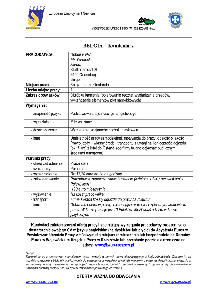 European Employment Services Wojewódzki Urząd Pracy w Rzeszowie (Łódź) BELGIA – Kamieniarz PRACODAWCA: Miejsce pracy: Liczba miejsc pracy: Zakres obowiązków: Debeir BVBA Els Vermont Adres: Stattionsstraat 30 8460 Oudenburg Belgia Belgia, region Oostende 1 Obróbka kamienia (polerowanie ręczne, wygładzanie brzegów, wykańczanie elementów płyt nagrobkowych) Wymagania: - znajomość języka Podstawowa znajomość jęz. angielskiego - wykształcenie Mile widziane - doświadczenie Wymagane, znajomość obróbki piaskowca - inne Umiejętność pracy samodzielnej, motywacja do pracy, dbałość o jakość Prawo jazdy i własny środek transportu z uwagi na konieczność dojazdu (ok. 7 km) z Istel do Ostend (do firmy trudno dojechać publicznymi środkami transportu) Warunki pracy: - okres zatrudnienia - czas pracy - wynagrodzenie - zakwaterowanie - wyżywienie - transport - inne Praca stała Pełen etat Do 13,20 euro brutto na godzinę Pracodawca zapewnia zakwaterowanie (dzielone z 3-4 pracownikami z Polski) koszt 190 euro miesięcznie Na koszt pracownika Firma zwraca koszty dojazdu do pracy na miejscu Dobra atmosfera w pracy, interesująca praca w bezpiecznym środowisku pracy. W firmie pracuje już 16 Polaków. Możliwość udziału w kursie językowym. Kandydaci zainteresowani ofertą pracy i spełniający wymagania pracodawcy proszeni są o dostarczenie swojego CV w języku angielskim (na dyskietce lub płycie) do Asystenta Eures w Powiatowym Urzędzie Pracy właściwym dla miejsca zamieszkania lub bezpośrednio do Doradcy Eures w Wojewódzkim Urzędzie Pracy w Rzeszowie lub przesłanie pocztą elektroniczną na adres: [email protected] Uwaga: Stosunek pracy z pracodawcą zagranicznym będzie zawarty w ramach prawa obowiązującego w kraju zatrudnienia. Oznacza to, że wszelkie roszczenie z tytułu nie wywiązywania się pracodawcy z warunków zawartych w umowie o pracę, dochodzić można wyłącznie w sądzie pracy w kraju zatrudnienia. W sytuacjach losowych pomoc polskich placówek konsularnych ogranicza się do ewentualnego udzielenia doraźnej pomocy ( np. kredytu na zakup biletu powrotnego do Polski ). OFERTA WAŻNA DO ODWOŁANIA www.eures.europa.eu www.wup-rzeszow.pl
