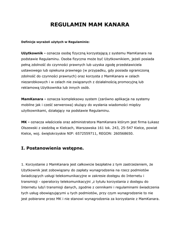 REGULAMIN MAM KANARA Definicje wyrażeń użytych w Regulaminie: Użytkownik - oznacza osobę fizyczną korzystającą z systemu MamKanara na podstawie Regulaminu. Osoba fizyczna może być Użytkownikiem, jeżeli posiada pełną zdolność do czynności prawnych lub uzyska zgodę przedstawiciela ustawowego lub opiekuna prawnego (w przypadku, gdy posiada ograniczoną zdolność do czynności prawnych) oraz korzysta z MamKanara w celach niezarobkowych i w celach nie związanych z działalnością promocyjną lub reklamową Użytkownika lub innych osób. MamKanara - oznacza kompleksowy system (zarówno aplikacja na systemy mobilne jak i cześć serwerowa) służący do wysłania wiadomości między użytkownikami, działający na podstawie Regulaminu. MK - oznacza właścicela oraz administratora MamKanara którym jest firma Łukasz Olszewski z siedzibą w Kielcach, Warszawska 161 lok. 243, 25-547 Kielce, powiat Kielce, woj. świętokrzyskie NIP: 6572559711, REGON: 260568650. I. Postanowienia wstępne. 1. Korzystanie z MamKanara jest całkowicie bezpłatne z tym zastrzeżeniem, że Użytkownik jest zobowiązany do zapłaty wynagrodzenia na rzecz podmiotów świadczących usługi telekomunikacyjne w zakresie dostępu do Internetu i transmisji - operatorzy telekomunikacyjni ,z tytułu korzystania z dostępu do Internetu lub/i transmisji danych, zgodnie z cennikami i regulaminami świadczenia tych usług obowiązującymi u tych podmiotów, przy czym wynagrodzenie to nie jest pobierane przez MK i nie stanowi wynagrodzenia za korzystanie z MamKanara. 2. Użytkownik korzysta z MamKanara wyłącznie na własną odpowiedzialność. 3. MK nie ponosi odpowiedzialności za treść oraz skutki użytkowania MamKanara przez Użytkownika. 4. MamKanara ma charakter wyłącznie informacyjny i nie ma w zamiarze nikogo obrazić ani nakłaniać do łamania prawa. II. Ogólne założenia korzystania z MamKanara. 1. Korzystanie przez użytkowników z MamKanara odbywa się na zasadzie dobrowolności i jest równoznaczne ze złożeniem przez Użytkownika oświadczenia o akceptacji wszystkich postanowień Regulaminu oraz wyrażeniem przez niego zgody na udostępnienie mu ewentualnych usług związanych z MamKanara. 2. Konsekwencje naruszania regulaminu MamKanara: ● a. MK ma prawo do zablokowania Użytkownika, który za pośrednictwem MamKanara rozsyła nieprawdziwe powiadomienia które mają na celu wprowadzić w błąd pozostałych Użytkoników, ● b. Użytkownik który naruszy regulamin otrzyma ostrzeżenie od MK; w przypadku powtórzenia się takiej sytuacji konto Użytkownika może zostać trwale zablokowane, ● c. w przypadku naruszenia prawa MK ma obowiązek powiadomić o tym odpowiednie instytucje. 3. Niezależnie od postanowień pkt III Regulaminu każda osoba korzystająca z MamKanara jest zobowiązana do zapoznania się oraz do przestrzegania niniejszego Regulaminu. III. Odpowiedzialność. 1. MK nie ponosi odpowiedzialności za szkody spowodowane działaniami lub zaniechaniami Użytkownika m. in. za korzystanie przez niego z MamKanara w sposób niezgodny z obowiązującymi przepisami prawa i postanowieniami Regulaminu oraz za szkody wynikające z podania niepełnych lub nieprawdziwych danych. 2. MK nie ponosi odpowiedzialności z tytułu utraconych korzyści poniesionych przez użytkownika lub osoby trzecie w związku korzystaniem z MamKanra i zgłaszaniem miejsca kontroli biletów. 3. MK są uprawnieni do przerwy lub zakłóceń w dostępności i korzystania z MamKanara lub/i jego poszczególnych części, jeżeli jest to spowodowane koniecznością naprawy, rozbudowy, modyfikacji lub konserwacji sprzętu albo oprogramowania bądź też innymi przyczynami niezależnymi od MK(siła wyższa, działania lub zaniechania osób trzecich). 4. MK zastrzega sobie prawo do udostępniania danych Użytkownika, jeżeli obowiązek udostępnienia uprawnionym osobom lub organom wynika z obowiązujących przepisów prawa lub nakazów sądu lub odpowiednich organów. 5. MK zastrzega sobie prawo do rozbudowy lub/i zmian oprogramowania przeznaczonego do korzystania z MamKanra bądź szaty graficznej MamKanara bez uprzedniego informowania o tym Użytkowników. IV. Przetwarzanie danych osobowych. 1. Użytkowni akceptująć regulamin wyraża zgodę na przetwarzanie danych osobowych w zakresie adres e-mail do celów marketingowych przez MK Na podstawie art. 23 ust. 1 pkt 1) w zw. z art. 7 pkt 5) ustawy z dnia 29.08.1997 r. - o ochronie danych osobowych (t.j. z dnia 17.06.2002 r., Dz.U. Nr 101, poz. 926 ze zm.) V. Postanowienia końcowe. 1. MK nie ponosi żadnej odpowiedzialności za nie prawdziwe zgłoszenia o miejscu kontroli biletów. 2. Regulamin obowiązuje od momentu opublikowania i może się zmieniać w trakcie działania MamKanara.