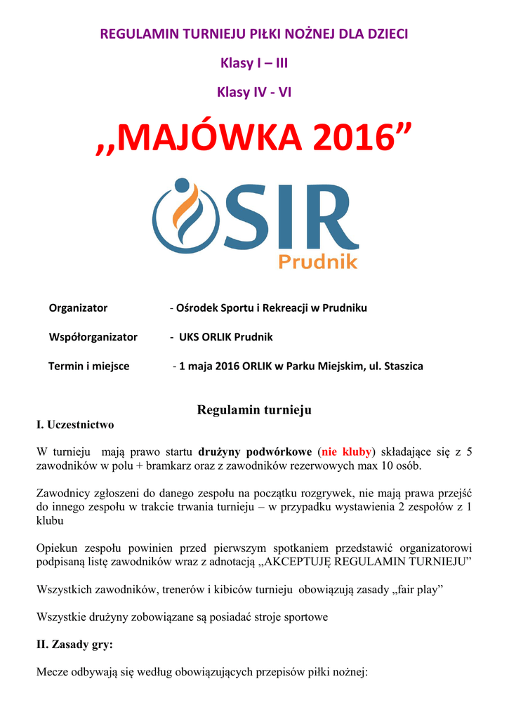 REGULAMIN TURNIEJU PIŁKI NOŻNEJ DLA DZIECI Klasy I – III Klasy IV - VI ,,MAJÓWKA 2016” Organizator - Ośrodek Sportu i Rekreacji w Prudniku Współorganizator - UKS ORLIK Prudnik Termin i miejsce - 1 maja 2016 ORLIK w Parku Miejskim, ul. Staszica Regulamin turnieju I. Uczestnictwo W turnieju mają prawo startu drużyny podwórkowe (nie kluby) składające się z 5 zawodników w polu + bramkarz oraz z zawodników rezerwowych max 10 osób. Zawodnicy zgłoszeni do danego zespołu na początku rozgrywek, nie mają prawa przejść do innego zespołu w trakcie trwania turnieju – w przypadku wystawienia 2 zespołów z 1 klubu Opiekun zespołu powinien przed pierwszym spotkaniem przedstawić organizatorowi podpisaną listę zawodników wraz z adnotacją ,,AKCEPTUJĘ REGULAMIN TURNIEJU” Wszystkich zawodników, trenerów i kibiców turnieju obowiązują zasady „fair play” Wszystkie drużyny zobowiązane są posiadać stroje sportowe II. Zasady gry: Mecze odbywają się według obowiązujących przepisów piłki nożnej: w meczu uczestniczy bezpośrednio 5 zawodników w polu + bramkarz czas gry: 12 minut bez zmiany połów rzuty z autu wykonywane są nogą (z podłoża) zmiany zawodników -lotne ( bez konieczności zgłaszania ich sędziemu ) bramkarz po aucie bramkowym wybija piłkę dowolnie ręką lub nogą z podłoża turniej zostanie rozegrany piłką o rozmiarze nr 4 podczas wykonywania stałych fragmentów gry zawodnicy drużyny przeciwnej muszą znajdować się co najmniej w odległości 5 m od piłki. nie wolno wykonywać wślizgów, nie wolno grać lub blokować dostępu do piłki leżąc pozostałe przepisy zgodnie z przepisami PZPN III. Kary: Zawodnikom za niesportowe zachowanie grożą następujące kary, które są wymierzane przez sędziego prowadzącego spotkanie kara wykluczenia ze spotkania na 2 minuty kara wykluczenia ze spotkania na 5 minut IV. Punktacja : za zwycięstwo drużyna otrzymuje 3 punkty, remis 1 punkt, za przegraną 0 punktów, za przegraną na skutek niestawiennictwa 0 pkt. i wynik 0:3, w rozgrywkach rundy zasadniczej kolejność zespołów ustalona zostanie na podstawie, ilości dużych punktów. W przypadku gdy dwie drużyny uzyskają taką samą liczbę punktów o miejscu tych drużyn decydują wynik bezpośredniego spotkania pomiędzy nimi, w przypadku uzyskania tej samej liczby punktów, przez więcej niż dwie drużyny o kolejności decyduje „mała tabela” uwzględniająca tylko mecze pomiędzy zainteresowanymi zespołami, o zajętych miejscach decydują kolejno : - większa ilość zdobytych punktów - stosunek bramek, strzelone do straconych - większa liczba zdobytych bramek - w przypadku takiego samego bilansu rozstrzygną 3 rzuty karne, V. Nagrody drużyny, które zajmą I, II, III miejsca w swojej kategorii otrzymują puchary nagrody indywidualne – piłka dla najlepszego bramkarza, strzelca, zawodnika turnieju VI. Zgłoszenia do turnieju Zgłoszenie należy złożyć bezpośrednio przed rozgrywkami . Karta drużyny musi zawierać: - nazwę drużyny, - imię, nazwisko, podpis i telefon kontaktowy trenera drużyny, - podpis opiekuna drużyny, - każdy zawodnik musi mieć pisemną zgodę rodziców na udział w zawodach VII. System rozgrywek System rozgrywek ustalony zostanie na miejscu w zależności od ilości zgłoszonych zespołów. VIII. Postanowienia końcowe Organizator nie ponosi odpowiedzialności za pozostawione rzeczy bez opieki na trybunach w szatniach i innych miejscach na terenie obiektu. Organizator nie odpowiada z tytułu NW osób biorących udział w turnieju jak również osób towarzyszących i innych osób przebywających na terenie obiektu. Organizator zapewnia opiekę medyczną. Organizator zastrzega sobie prawo do zmian w niniejszym regulaminie. W przypadku zmiany uczestnicy turnieju zostaną o tym powiadomieni najpóźniej do momentu rozpoczęcia się turnieju. W przypadku pojawienia się pytań prosimy o kontakt tel. 608 537 324, 500 112 509 Poniżej druk zgody rodziców : ZGODA RODZICÓW/OPIEKUNÓW PRAWNYCH NA UDZIAŁ DZIECKA W ZAWODACH SPORTOWYCH …………………………………………. /imię i nazwisko rodzica/opiekuna/ ……………………………………………. /telefon kontaktowy rodzica/opiekuna/ Wyrażam zgodę na udział dziecka ……………………………………………….. /imię i nazwisko dziecka/ w zawodach sportowych w dniu 1 maja 2016r. Turniej Piłki Nożnej „Majówka 2016” ……………………………………………….. /dyscyplina sportowa/ Oświadczam, że nie ma przeciwwskazań lekarskich, aby moje dziecko uczestniczyło w zawodach sportowych – Turniej Piłki Nożnej „Majówka 2016:”. Wyrażam zgodę na podejmowanie decyzji przez opiekuna, organizatora zawodów związanych z zagrożeniem zdrowia i życia mojego dziecka. Uczestników zawodów obowiązuje bezwzględny zakaz posiadania, spożywania i używania tytoniu, alkoholu, narkotyków i innych środków odurzających. ……………………………… miejscowość i data ……………………………… podpis rodzica/opiekuna