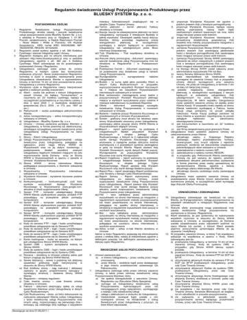 Regulamin świadczenia Usługi Pozycjonowania Produktowego przez BLUESKY SYSTEM Sp. z o. o. miesięcy kalendarzowych znajdujących się w obrębie Czasu Trwania Umowy; ab) Termin płatności – termin płatności Faktury określony w Umowie; ac) Kaucja- kaucja na zabezpieczenie płatności na rzecz Usługodawcy, wynosząca 3 miesięczne Budżety w pełnej wysokości. Obowiązek zapłaty kaucji dotyczy klientów, którzy posiadają negatywną ocenę wiarygodności płatniczej, w szczególności wynikającą z danych będących w posiadaniu Usługodawcy lub udostępnionych przez Biuro Informacji Gospodarczej. ad) Tryb Współpracy – Tryb współpracy określony w Umowie; ae) Warunki oferty promocyjnej - dokument zawierający warunki świadczenia usług Pozycjonowania inne niż określone w Regulaminie i w Podstawowym Cenniku; af) Podstawowy Cennik - dokument zawierający ceny za podstawowe oraz dodatkowe usługi w ramach Usługi Pozycjonowania; ag) Wynagrodzenie – wynagrodzenie należne Usługodawcy; ah) Budżet – to suma opłat jakie poniósłby Klient w danym Cyklu Rozliczeniowym w przypadku wypozycjonowania wszystkich Wyrażeń kluczowych na 1 miejsca we wszystkich Wyszukiwarkach internetowych wskazanych w Umowie. ai) Brak rentowności- nieosiągnięcie przez żadne z pozycjonowanych Wyrażeń Kluczowych płatnego miejsca w wynikach wyszukiwania przez ostatnie 4 miesiące kalendarzowe na podstawie Raportów. aj) Oferta – dokument zawierający szczegóły świadczenia Usług Pozycjonowania o numerach wskazanych w Umowie; ak) Badanie – badanie pozycji Wyrażenia Kluczowego w przedstawionych w Umowie Wyszukiwarkach; al) Screen - graficzny zrzut ekranu lub tekstowy zapis strony Wyszukiwarki utworzony przez Usługodawcę, zawierający płatne pozycje strony WWW Klienta w Wyszukiwarkach objętych Umową. am)Raport – raport wykonywany na podstawie 4 cotygodniowych Badań wszystkich Wyrażeń Kluczowych w obrębie jednego Cyklu Rozliczeniowego, z których to 2 najbardziej odległe wyniki danego Wyrażenia Kluczowego zostają anulowane, a następnie zostaje obliczona średnia arytmetyczna z 2 pozostałych wyników zaokrąglona w górę na korzyść Klienta. Raport zawiera listę Wyrażeń Kluczowych, wynik danych Badań pozycji, Wynagrodzenie za poszczególne Wyrażenia Kluczowe oraz sumę Wynagrodzeń; an) Raport Cząstkowy – raport wykonany na podstawie 1 cotygodniowego Badania wszystkich Wyrażeń Kluczowych w obrębie jednego Cyklu Rozliczeniowego. Raport zawiera listę Wyrażeń Kluczowych oraz wynik danego Badania pozycji; ao) Raport Plus – raport zawierający Raport podstawowy oraz Screeny z danego Cyklu Rozliczeniowego; ap) Raport Zerowy – Raport wykonywany przez Usługodawcę po zawarciu Umowy, przed rozpoczęciem świadczenia Usług Pozycjonowania przez Usługodawcę, Raport zawiera listę Wyrażeń Kluczowych oraz wynik danego Badania pozycji aktualny przed rozpoczęciem świadczenia Usług Pozycjonowania przez Usługodawcę; aq) Filtr – kara nakładana przez administratora wyszukiwarki na stronę internetową za niezgodne z regulaminami wyszukiwarki metody pozycjonowania lub treści prezentowane na stronie internetowej, polegająca na spadku strony internetowej o określoną w regulaminie wyszukiwarki ilość pozycji w wynikach wyszukiwania, ar) Ban - kara nakładana przez administratora wyszukiwarki na stronę internetową za niezgodne z regulaminami wyszukiwarki metody pozycjonowania lub treści prezentowane na stronie internetowej, polegająca na usunięciu strony internetowej z wyników wyszukiwania as) Adres e-mail – adres e-mail Klienta określony w Umowie. Ilekroć w treści Regulaminu pojawiają się sformułowania pisane z wielkiej litery, należy je interpretować zgodnie z definicjami powyżej, lub definicjami zamieszczonymi w dalszej części Regulaminu. POSTANOWIENIA OGÓLNE 1. 2. 3. 4. 5. Regulamin Świadczenia Usługi Pozycjonowania Produktowego określa zasady i warunki świadczenia usługi pozycjonowania przez BlueSky System Sp. z o.o. z siedzibą w Poznaniu przy ul. Książęcej 1, 61-361 Poznań, zarejestrowaną w Sądzie Rejonowym Poznań – Nowe Miasto i Wilda w Poznaniu VIII Wydział Gospodarczy KRS, numer KRS: 0000362986, NIP: 7822509785, REGON: 301524240. Regulamin został wydany zgodnie z art. 384 Kodeksu Cywilnego i stanowi integralną część Umowy. Regulamin dostępny jest na witrynie internetowej pod adresem http://www.blueskysystem.pl oraz w siedzibie Usługodawcy, zgodnie z art. 384 par. 4 Kodeksu Cywilnego. Klient zobowiązuje się do przestrzegania postanowień Umowy i Regulaminu. Usługodawca zastrzega sobie prawo do zmiany Regulaminu w każdym czasie bez konieczności podawania przyczyn. Nowe postanowienia Regulaminu wchodzą w życie w przypadku nieotrzymania przez Usługodawcę oświadczenia Klienta o wypowiedzeniu Umowy w terminie 14 dni od dnia powiadomienia przez Usługodawcę o zmianie Regulaminu. Wyrażenia użyte w Regulaminie należy interpretować zgodnie z nadanym poniżej znaczeniem: a) Klient - osoba lub podmiot z którym Usługodawca zawarł Umowę, nie będący "konsumentem" w rozumieniu art. 221 kodeksu cywilnego, będący w szczególności przedsiębiorcą w rozumieniu ustawy z dnia 2 lipca 2004 r. o swobodzie działalności gospodarczej (Dz.U. 2004 , nr 173, poz. 1807 ze zm.) b) Pełnomocnik – osoba posiadająca pełnomocnictwo Klienta; c) Adres korespondencyjny – adres korespondencyjny wskazany w Umowie; d) Usługodawca – BlueSky System Sp. z o.o. e) Umowa – Umowa zawierana pomiędzy Klientem a Usługodawcą, w formie pisemnej lub elektronicznej, określająca szczegółowe warunki świadczenia przez Usługodawcę Usługi Pozycjonowania na rzecz Klienta; f) Strony – Klient i Usługodawca; g) Usługa Pozycjonowania [Pozycjonowanie] - usługa świadczona przez Usługodawcę, polegająca na zgłoszeniu przez niego Strony WWW do Wyszukiwarki oraz na jej stałym monitoringu i podejmowania działań ws