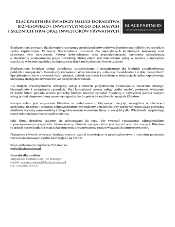 Blackpartners powstało dzięki współpracy grupy profesjonalistów z doświadczeniem na polskim i europejskim rynku kapitałowym. Partnerzy Blackpartners pracowali dla największych światowych korporacji oraz cenionych firm doradczych. Nabyte doświadczenie oraz przedsiębiorczość Partnerów zdecydowały o stworzeniu profesjonalnej grupy doradczej, której celem jest świadczenie usług w oparciu o najwyższe standardy w branży zgodnie z najlepszymi praktykami bankowości inwestycyjnej. Blackpartners świadczy usługi doradztwa transakcyjnego i strategicznego dla średnich przedsiębiorstw polskich i europejskich. Doradzamy Zarządom i Właścicielom jak „zobaczyć niewidzialne i zrobić niemożliwe”. Specjalizujemy się w procesach fuzji i przejęć, a dzięki szerokim kontaktom w instytucjach rynku kapitałowego oferujemy dostęp do inwestorów we wszystkich branżach. Dla małych przedsiębiorstw oferujemy usługi z zakresu pozyskiwania finansowania, tworzenia strategii, biznesplanów i zarządzania sprzedażą. Nasi konsultanci tworzą usługi „tailor made”, ponieważ wierzymy, że każdy Klient posiada własne potrzeby, którym musimy sprostać. Słyniemy z najwyższej jakości naszych usług, jednak dopasowujemy nasze wynagrodzenie do potrzeb i możliwości naszych Klientów. Naszym celem jest wspieranie Klientów w podejmowaniu kluczowych decyzji, szczególnie w obszarach sprzedaży, finansów i strategii. Odpowiedzialnie prowadzimy działalność, aby zapewnić równowagę pomiędzy możliwie wysoką rentownością i długookresowym wzrostem firmy z korzyścią dla Właścicieli, wypełniając nasze zobowiązania wobec społeczeństwa. Jako firma doradcza czujemy się zobowiązani do tego, aby tworzyć rozwiązania odpowiedzialne, z poszanowaniem wszystkich interesariuszy. Chociaż naszym celem jest wzrost wartości naszych Klientów to jednak nasze działania mają także inicjować zrównoważony rozwój wszystkich zainteresowanych. Planujemy również utworzyć fundusz venture capital inwestujący w przedsiębiorstwa o wysokim potencjale wzrostu na masowym rynku, bez względu na branże. Więcej informacji znajdziecie Państwo na: www.blackpartners.pl Kontakt dla mediów Magdalena Samusionek | PR Manager e-mail: [email protected] tel. +48 698 524 927