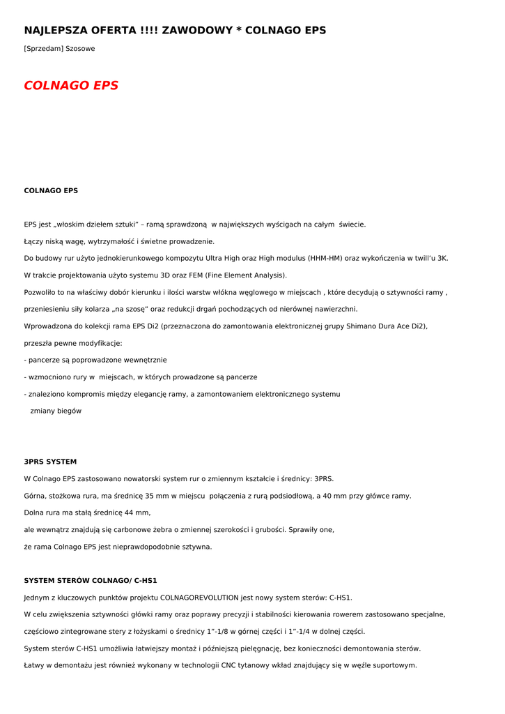 NAJLEPSZA OFERTA !!!! ZAWODOWY * COLNAGO EPS [Sprzedam] Szosowe COLNAGO EPS COLNAGO EPS EPS jest „włoskim dziełem sztuki” – ramą sprawdzoną w największych wyścigach na całym świecie. Łączy niską wagę, wytrzymałość i świetne prowadzenie. Do budowy rur użyto jednokierunkowego kompozytu Ultra High oraz High modulus (HHM-HM) oraz wykończenia w twill’u 3K. W trakcie projektowania użyto systemu 3D oraz FEM (Fine Element Analysis). Pozwoliło to na właściwy dobór kierunku i ilości warstw włókna węglowego w miejscach , które decydują o sztywności ramy , przeniesieniu siły kolarza „na szosę” oraz redukcji drgań pochodzących od nierównej nawierzchni. Wprowadzona do kolekcji rama EPS Di2 (przeznaczona do zamontowania elektronicznej grupy Shimano Dura Ace Di2), przeszła pewne modyfikacje: - pancerze są poprowadzone wewnętrznie - wzmocniono rury w miejscach, w których prowadzone są pancerze - znaleziono kompromis między elegancję ramy, a zamontowaniem elektronicznego systemu zmiany biegów 3PRS SYSTEM W Colnago EPS zastosowano nowatorski system rur o zmiennym kształcie i średnicy: 3PRS. Górna, stożkowa rura, ma średnicę 35 mm w miejscu połączenia z rurą podsiodłową, a 40 mm przy główce ramy. Dolna rura ma stałą średnicę 44 mm, ale wewnątrz znajdują się carbonowe żebra o zmiennej szerokości i grubości. Sprawiły one, że rama Colnago EPS jest nieprawdopodobnie sztywna. SYSTEM STERÓW COLNAGO/ C-HS1 Jednym z kluczowych punktów projektu COLNAGOREVOLUTION jest nowy system sterów: C-HS1. W celu zwiększenia sztywności główki ramy oraz poprawy precyzji i stabilności kierowania rowerem zastosowano specjalne, częściowo zintegrowane stery z łożyskami o średnicy 1”-1/8 w górnej części i 1”-1/4 w dolnej części. System sterów C-HS1 umożliwia łatwiejszy montaż i późniejszą pielęgnację, bez konieczności demontowania sterów. Łatwy w demontażu jest również wykonany w technologii CNC tytanowy wkład znajdujący się w węźle suportowym. WŁÓKNO WĘGLOWE I ŻYWICE COLNAGO Ernesto Colnago produkuje ramy carbonowe od ponad 20 lat. Zdobyte doświadczenie sprawia, że stosuje w swoich rowerach najwyższej jakości włókna węglowe i żywice. DODATKOWE INFORMACJE Rama EPS ma rurę podsiodłową o średnicy 35 mm – wymaga sztycy o średnicy 31,6 mm. Specjalnie dla Colnago EPS skonstruowano nowy widelec NEWSTAR, współpracujący z nowymi sterami C-HS1. ROZMIARY EPS, zgodnie z mottem Colnago: "rama pasuje do Ciebie, a nie Ty pasujesz do ramy" jest wykonana na miarę, oraz w 14 tradycyjnych (52 - 65) i 8 slopingowych (42s - 58s) rozmiarach. Dostępne malowania: EPS White (PR99) – biała EPS Red (PR82) – czerwona EPS Matt Black (MTBK) – czarna matowa SPECYFIKACJA ROZMIAR RAMY OD RURA PIONOWA OD ŚR SUPORTU DO KONCA RURY 55 CM RURA POZIOMA OD ŚR DO ŚR 54,5CM WAGA 6.8 KG RAMA *CARBON *WIDELEC CARBON NAPĘD *PRZERZUTKA PRZEDNIA - CAMPAGNOLO RECORD *PRZERZUTKA TYLNIA - CAMPAGNOLO RECORD *MECHANIZM KORBOWY - CAMPAGNOLO RECORD CT ULTRA HOLLOW STRUCTURE (T 50/34) KOŁA *KOMPLETNE KOŁA - FULCRUM RECING *OPONY - CONTINENTAL GRAND PRIX KONTROLA *MANETKI - CAMPAGNOLO RECORD *DZWIGNIE HAMULCA - CAMPAGNOLO RECORD *HAMULCE -CAMPAGNOLO RECORD *KIEROWNICA - 3T *MOSTEK - RITCHEY *STERY - COLNAGOREVOLUTION C-HS1. *SIODEŁKO - KARDAN *WSPORNIK SIODEŁKA - CARBON COLNAGO INFORMACJE DODATKOWE: *ROWER W STANIE IDEALNYM *WIĘCEJ ZDJEĆ MOGE ZAINTERESOWANYM PRZESŁAĆ NA MEILA *JEŚLI SZUKASZ INNEGO ROWERU" SZOSOWEGO" BĄDZ "MTB"PROSZĘ O KONTAKT PRZED KUP TERA PROSZE O KONTAK W CELU SPRAWDZENIA DOSTEPNOSCI TOWARU ZNAJDŹ NAS NA FACEBOOK I BĄDŹ NA BIEŻĄCO WWW.FACEBOOK.COM/BIKETOMLUBIN Informacje dodatkowe Stan Używany Oferta prywatna/sklepu Oferta prywatna Materiał ramy Karbon Adres ogłoszenia http://rowerowybazar.com.pl/najlepsza-oferta-zawodowy-colnago-eps,o2578 Kontakt Mail: [email protected] Telefon: 604579418 Lokalizacja , LUBIN Dolnośląskie (Polska) Ogłoszenie dodano: 2015-09-17 22:29:40 Ogłoszenie wygasa: 2015-10-05 14:49:36 Powered by TCPDF (www.tcpdf.org)