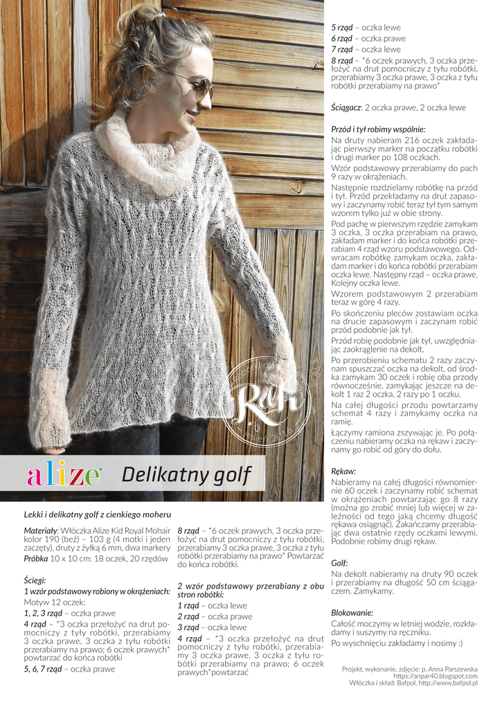 5 rząd – oczka lewe 6 rząd – oczka prawe 7 rząd – oczka lewe 8 rząd – *6 oczek prawych, 3 oczka przełożyć na drut pomocniczy z tyłu robótki, przerabiamy 3 oczka prawe, 3 oczka z tyłu robótki przerabiamy na prawo* Ściągacz: 2 oczka prawe, 2 oczka lewe Przód i tył robimy wspólnie: Na druty nabieram 216 oczek zakładając pierwszy marker na początku robótki i drugi marker po 108 oczkach. Wzór podstawowy przerabiamy do pach 9 razy w okrążeniach. Następnie rozdzielamy robótkę na przód i tył. Przód przekładamy na drut zapasowy i zaczynamy robić teraz tył tym samym wzorem tylko już w obie strony. Pod pachę w pierwszym rzędzie zamykam 3 oczka, 3 oczka przerabiam na prawo, zakładam marker i do końca robótki przerabiam 4 rząd wzoru podstawowego. Odwracam robótkę zamykam oczka, zakła dam marker i do końca robótki przerabiam oczka lewe. Następny rząd – oczka prawe, Kolejny oczka lewe. Wzorem podstawowym 2 przerabiam teraz w górę 4 razy. Po skończeniu pleców zostawiam oczka na drucie zapasowym i zaczynam robić przód podobnie jak tył. Przód robię podobnie jak tył, uwzględniając zaokrąglenie na dekolt. Po przerobieniu schematu 2 razy zaczynam spuszczać oczka na dekolt, od środka zamykam 30 oczek i robię oba przody równocześnie, zamykając jeszcze na dekolt 1 raz 2 oczka, 2 razy po 1 oczku. Na całej długości przodu powtarzamy schemat 4 razy i zamykamy oczka na ramię. Łączymy ramiona zszywając je. Po połączeniu nabieramy oczka na rękaw i zaczynamy go robić od góry do dołu. Delikatny golf Lekki i delikatny golf z cienkiego moheru Materiały: Włóczka Alize Kid Royal Mohair kolor 190 (beż) – 103 g (4 motki i jeden zaczęty), druty z żyłką 6 mm, dwa markery Próbka 10 x 10 cm: 18 oczek, 20 rzędów Ściegi: 1 wzór podstawowy robiony w okrążeniach: Motyw 12 oczek: 1, 2, 3 rząd – oczka prawe 4 rząd – *3 oczka przełożyć na drut pomocniczy z tyły robótki, przerabiamy 3 oczka prawe, 3 oczka z tyłu robótki przerabiamy na prawo; 6 oczek prawych* powtarzać do końca robótki 5, 6, 7 rząd – oczka prawe Rękaw: Nabieramy na całej długości równomiernie 60 oczek i zaczynamy robić schemat w okrążeniach powtarzając go 8 razy (można go zrobić mniej lub więcej w zależności od tego jaką chcemy długość rękawa osiągnąć). Zakańczamy przerabia8 rząd – *6 oczek prawych, 3 oczka prze- jąc dwa ostatnie rzędy oczkami lewymi. łożyć na drut pomocniczy z tyłu robótki, Podobnie robimy drugi rękaw. przerabiamy 3 oczka prawe, 3 oczka z tyłu robótki przerabiamy na prawo* Powtarzać Golf: do końca robótki. Na dekolt nabieramy na druty 90 oczek 2 wzór podstawowy przerabiany z obu i przerabiamy na długość 50 cm ściągaczem. Zamykamy. stron robótki: 1 rząd – oczka lewe Blokowanie: 2 rząd – oczka prawe Całość moczymy w letniej wodzie, rozkła3 rząd – oczka lewe damy i suszymy na ręczniku. 4 rząd – *3 oczka przełożyć na drut pomocniczy z tyłu robótki, przerabia- Po wyschnięciu zakładamy i nosimy :) my 3 oczka prawe, 3 oczka z tyłu robótki przerabiamy na prawo; 6 oczek Projekt, wykonanie, zdjęcie: p. Anna Parszewska prawych*powtarzać https://anpar40.blogspot.com Włóczka i skład: Bafpol, http://www.bafpol.pl