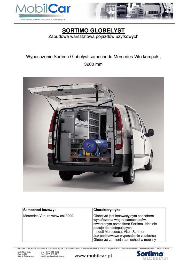 SORTIMO GLOBELYST Zabudowa warsztatowa pojazdów użytkowych Wyposażenie Sortimo Globelyst samochodu Mercedes Vito kompakt, 3200 mm Samochód bazowy: Charakterystyka: Mercedes Vito, rozstaw osi 3200. Globelyst jest innowacyjnym sposobem wykańczania wnętrz samochodów, stworzonym przez firmę Sortimo. Idealnie pasuje do następujących modeli Mercedesa: Vito i Sprinter. Już podstawowe wyposażenie z zakresu Globelyst zamienia samochód w mobilny warsztat, który jest gwarancją efektywnej pracy i ergonomicznego wykorzystania pojazdu. Przykładowe elementy wyposażenia Soboflex®- podłoga montażowa: • • • • • • Multiplex 12 mm antypoślizgowa dopasowana do konkretnego modelu samochodu brak konieczności przewiercania karoserii pojazdu (zabudowa warsztatowa przykręcana jest wyłącznie do płyty podłogowej Soboflex, natomiast boczne elementy stabilizujące przytwierdzane są do bocznych elementów karoserii pojazdu odporna na ścieranie stabilna i łatwa w utrzymaniu czystości Sowaflex®- wyłożenie ścian bocznych przestrzeni ładunkowej • • • • • ochrona samochodu przed wewnętrznymi szkodami niezwykle odporne na wstrząsy i zadrapania odporne także na wilgoć i substancje chemiczne wielkość dokładnie dopasowana do danego typu samochodu lżejsze o 60% od drewna Lewa strona (kierowcy) Prawa strona (pasażera) VI KO LI-1 VI KO RE-1 4 półki FW z 2 przegrodami i matami przeciwpoślizgowymi 2 półki FR z przegrodami i matami przeciwpoślizgowymi 2 Mobilbox z uchwytem, zamontowane na półce aluminiowej 2 walizki T-BOXX zamontowane na półce aluminiowej 1 pas transportowy (SZ x G x H): około 1972 x 382 x 1219 mm Waga: około 57,3 kg 2 półki FW z 2 przegrodami i matami przeciwpoślizgowymi 1 półka z 6 pojemnikami magazynowymi SB 04-9 1 półka FR z 2 przegrodami i matą przeciwpoślizgową (SZ x G x H): około 1004 x 382 x 1219 mm Waga: około 31,1 kg VI KO LI-2 VI KO RE- 2 2 półki z 6 pojemniakmi magazynowymi SB 04-9 2 półki FW z 2 przegrodami i matami przeciwpoślizgowymi 1 półka FR z 2 przegrodami i matą przeciwpoślizgową 1 półka z klapą aluminiową 1 uchwyt blokujący walizki 1 klapa unoszona do góry 1 kątownik podłogowy w formie szyny transportowej (SZ x G x H): około 1972 x 382 x 1219 mm Waga: około 57,1 kg 2 półki FR z 2 przegrodami i matami przeciwpoślizgowymi 3 szuflady 2 walizki T-BOXX zamontowane na półce aluminiowej 1 walizka z plastikowymi pojemnikami 1 klapa uchylana do góry 1 kątownik podłogowy w formie szyny transportowej (SZ x G x H): około 1004 x 382 x 1219 mm Waga: około 65,1 kg VI KO LI-3 VI KO RE- 3 2 półki z 6 pojemnikami magazynowymi SB 04-9 2 półki FW z 2 przegrodami i matami przeciwpoślizgowymi 2 półki FR z 2 przegrodami i matami przeciwpoślizgowymi 3 szuflady z przegrodami i matami przeciwpoślizgowymi 2 walizki T-BOXX 1 pas transportowy 1 klapa unoszona do góry 1 kątownik podłogowy w formie szyny transportowej (SZ x G x H): około 1972 x 382 x 1219 mm Waga: około 85,1 kg 1 półka FW z 2 przegrodami i matą przeciwpoślizgową 1 półka FR z 2 przegrodami i matą przeciwpoślizgową 3 szuflady z przegrodami i matami przeciwpoślizgowymi 1 klapa uchylana do góry 1 kątownik podłogowy w formie szyny transportowej (SZ x G x H): około 1004 x 382 x 1219 mm Waga: około 49,2 kg VI KO LI- 4 VI KO RE- 4 1 wanna na elementy długie 2 półki z 6 pojemnikami magazynowymi SB 04-9 2 półki FR z 2 przegrodami i matami przeciwpoślizgowymi 1 półka FW z 2 przegrodami i matą przeciwpoślizgową 3 szuflady z przegrodami i matami przeciwpoślizgowymi 1 uchwyt blokujący walizki 1 klapa uchylana do góry (SZ x G x H): około 1972 x 382 x 1171 mm Waga: około 83,9 kg Certyfikaty: 2 półki FR z 2 przegrodami i matami przeciwpoślizgowymi 3 szuflady z przegrodami i matami przeciwpoślizgowymi 4 walizki z plastikowymi pojemnikami 1 klapa uchylana do góry 1 blat składany z imadłem, z obrotową podstawą 1 uchwyt na dokumenty A4 (SZ x G x H): około 1224 x 382 x 1202 mm Waga: około 88,7 kg • • • ISO 9001 TÜV produkt spełnia wymagania normy europejskiej ECE R17 Homologacja pojazdu: nie wymaga Gwarancja: 3 lata na produkty Sortimo International GmbH Jeśli macie Państwo jakieś pytania, nasz doradca pomoże Państwu zaprojektować zabudowę samochodu. Mobilcar s.c. Dobrzeń 26 56-410 Dobroszyce Tel. (071) 315-35-32; 0-698-695-940 Fax: (071) 315-35-19 E-mail: [email protected] [email protected] www.mobilcar.pl
