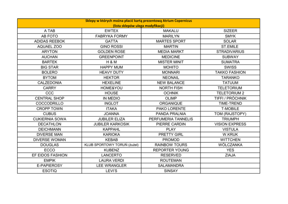 A TAB AB FOTO ADIDAS REEBOK AQUAEL ZOO ARYTON AUCHAN BARTEK BIG STAR BOLERO BYTOM CALZEDONIA CARRY CCC CENTRAL SHOP COCCODRILLO CROPP TOWN CUBUS CUKIERNIA SOWA DECATHLON DEICHMANN DIVERSE MAN DIVERSE WOMAN DOUGLAS ECCO EF EIDOS FASHION EMPIK E-PAPIEROSY ESOTIQ Sklepy w których można płacić kartą prezentową Atrium Copernicus (lista sklepów ulega modyfikacji) EWTEX MAKALU FABRYKA FORMY MARILYN GATTA MARTES SPORT GINO ROSSI MARTIN GOLDEN ROSE MEDIA MARKT GREENPOINT MEDICINE H&M MISTER MINIT HAPPY MUM MOHITO HEAVY DUTY MONNARI HEKTOR NEONAIL HEXELINE NEW BALANCE HOME&YOU NORTH FISH HOUSE OCHNIK IN MEDIO OLIMP INGLOT ORGANIQUE ITAKA PAKO LORENTE JOANNA PANDA PRALNIA JUBILER ELIZA PERFUMERIA TANNELIS JUBILER KARKOSIK PIERRE CARDIN KAPPAHL PLAY KARIOKA PRETTY GIRL KEBAB PROMOD KLUB SPORTOWY TORUŃ (żużel) RAINBOW TOURS KUBENZ REPORTER YOUNG LANCERTO RESERVED LAURA VERDI ROUTEMAN LEE WRANGLER SALAMANDRA LEVI’S SINSAY SIZEER SMYK SOLAR ST.EMILE STRADIVARIUS SUBWAY SUMATRA SWISS TAKKO FASHION TARANKO TATUUM TELETORIUM TELETORIUM 2 TIFFI / PRÓCHNIK TIME-TREND T-MOBILE TOM (RAJSTOPY) TRIUMPH VISION EXPRESS VISTULA W.KRUK WITTCHEN WÓLCZANKA YES ZIAJA